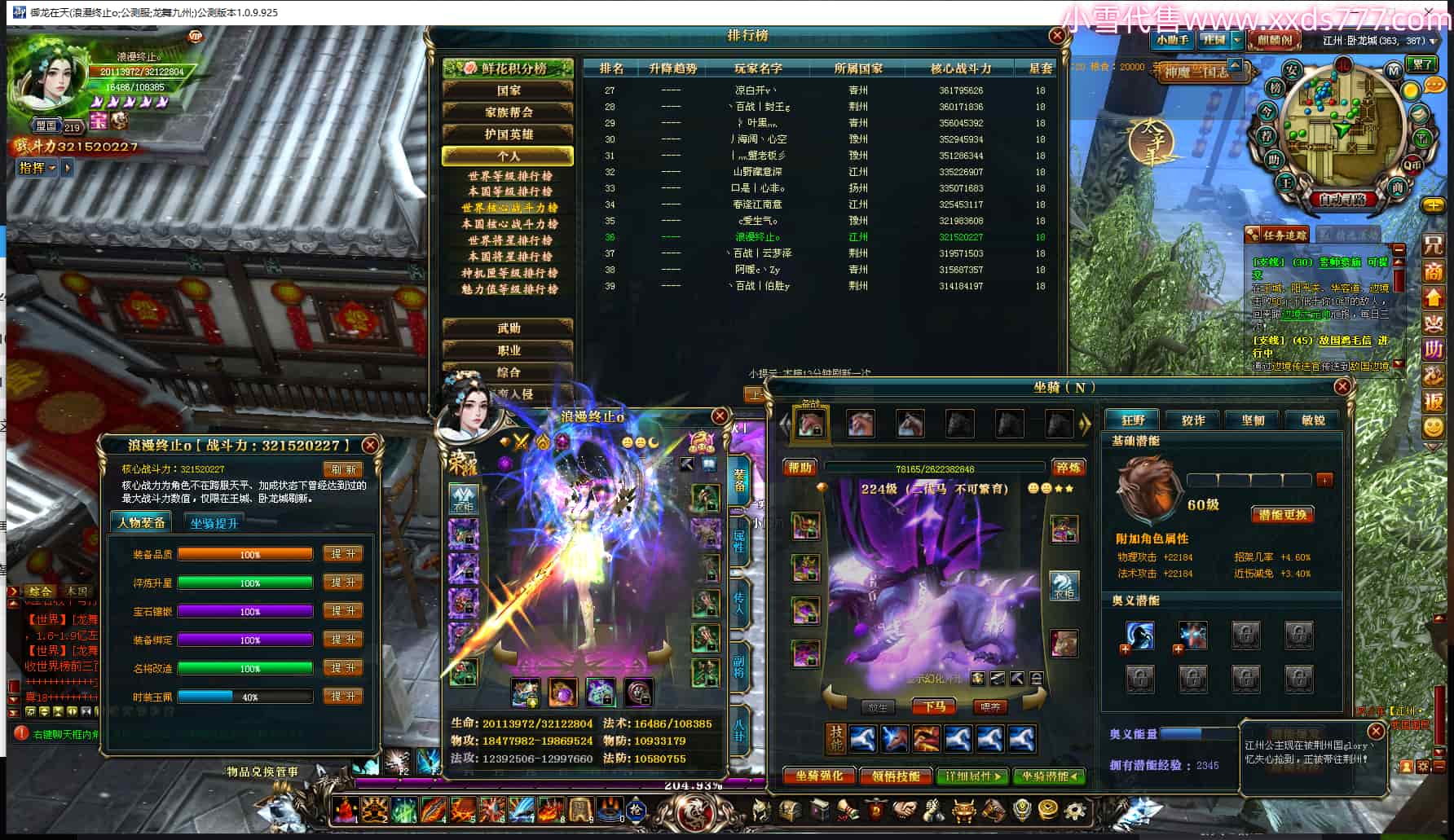 编号W24735 浪漫终止o 龙舞九州 江州 世界排名36名 32152W战力 人物黄金极品橙15X(2件18X9件混沌) 传人黄金加强橙15X(2件18X) 副将黄金普通橙15X 马黄金精良橙14X(双潜能60级57级) 史诗紫17披风 人物星魂16级 传人星魂16级 副将星魂16级 马星魂16级 人物铭刻3件18级其余15级 点亮2件18星其余16星 马铭刻14级 点亮14星 人物绿龙印(5件紫龙印) 马绿龙印 六等单双属性神圣完美石头 绿紫孔 已开完永久18星套 花榜第一