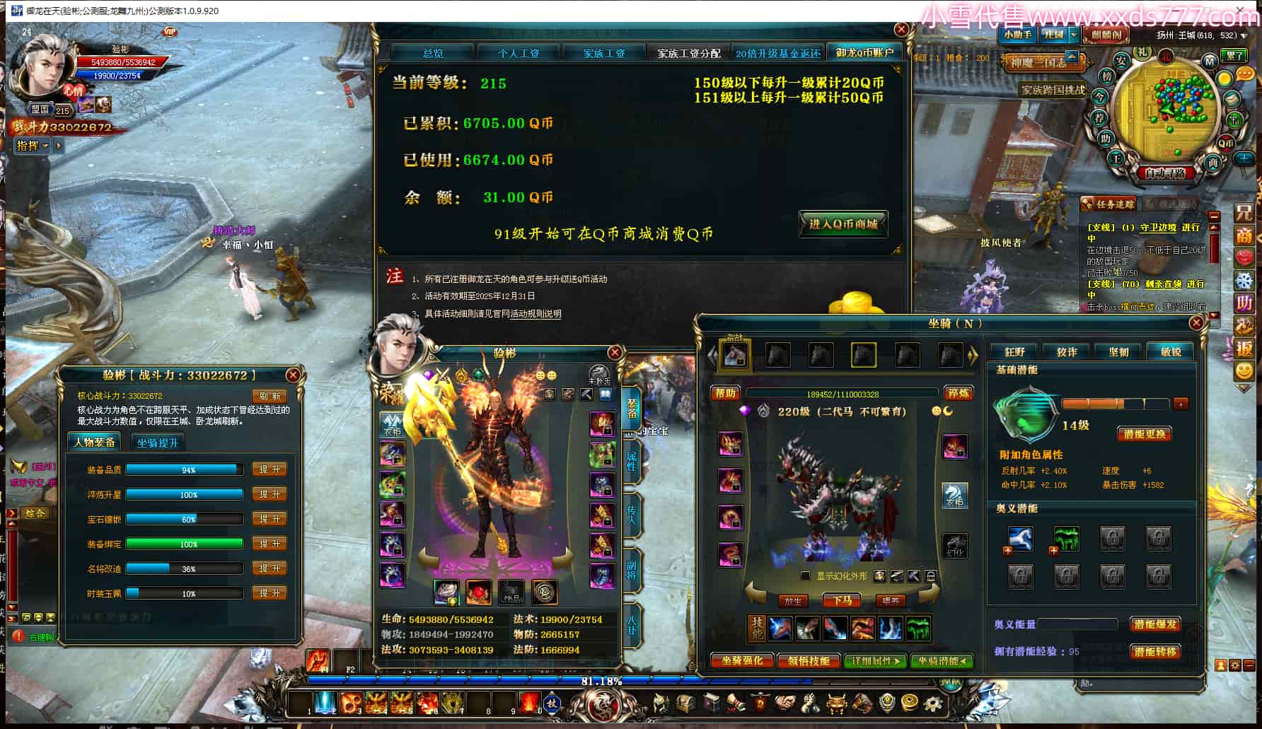 编号W24470 验彬 龙舞九州 扬州 215级 人物12X点星号 铭刻12级 点亮12星 马9X 号内Q币31个 人物高淬107个 坐骑中淬91个