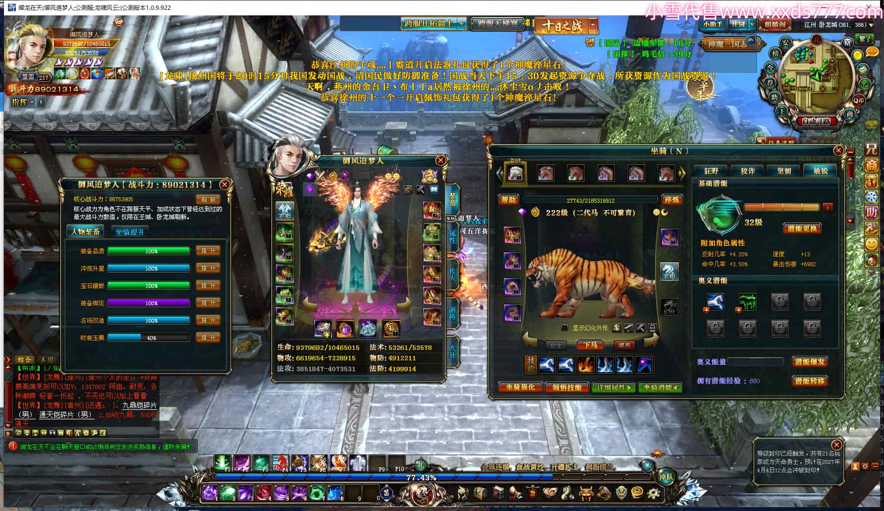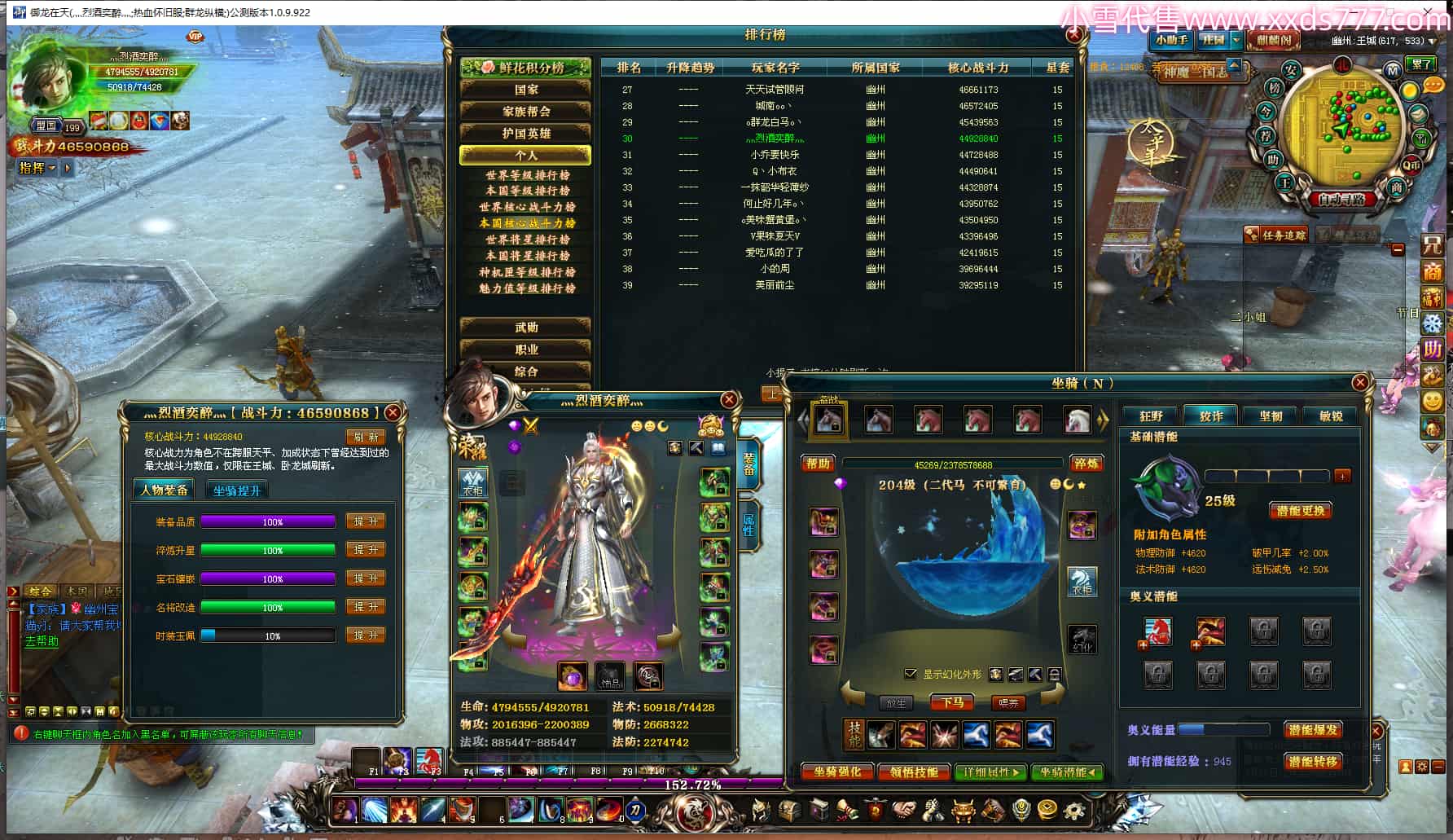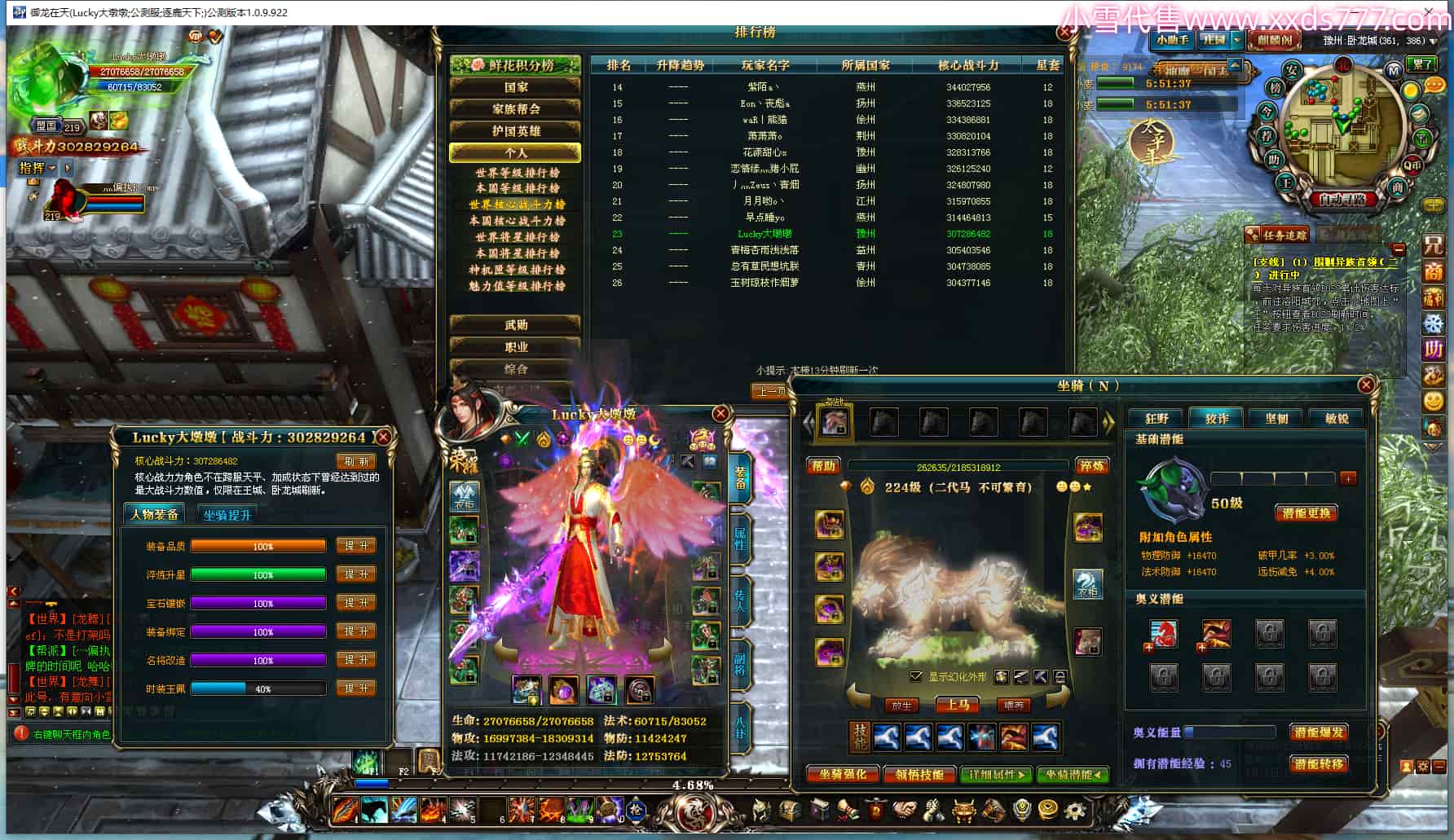 编号X24564 御风追梦人 龙啸风云 江州 8728W战力 人物精良紫12X(2件15X) 传人精良紫12X 马极品紫9X 加强紫14X披风 人物星魂12级 传人6级 马6级 人物铭刻3件15级1件14级1件13级其余12级 点亮2件16星3件14星其余12星 马铭12级 点亮10星 人物黄龙印(6件绿龙印) 马蓝龙印(1件黄龙印) 五等单双属性神圣完美无暇石头 白孔
