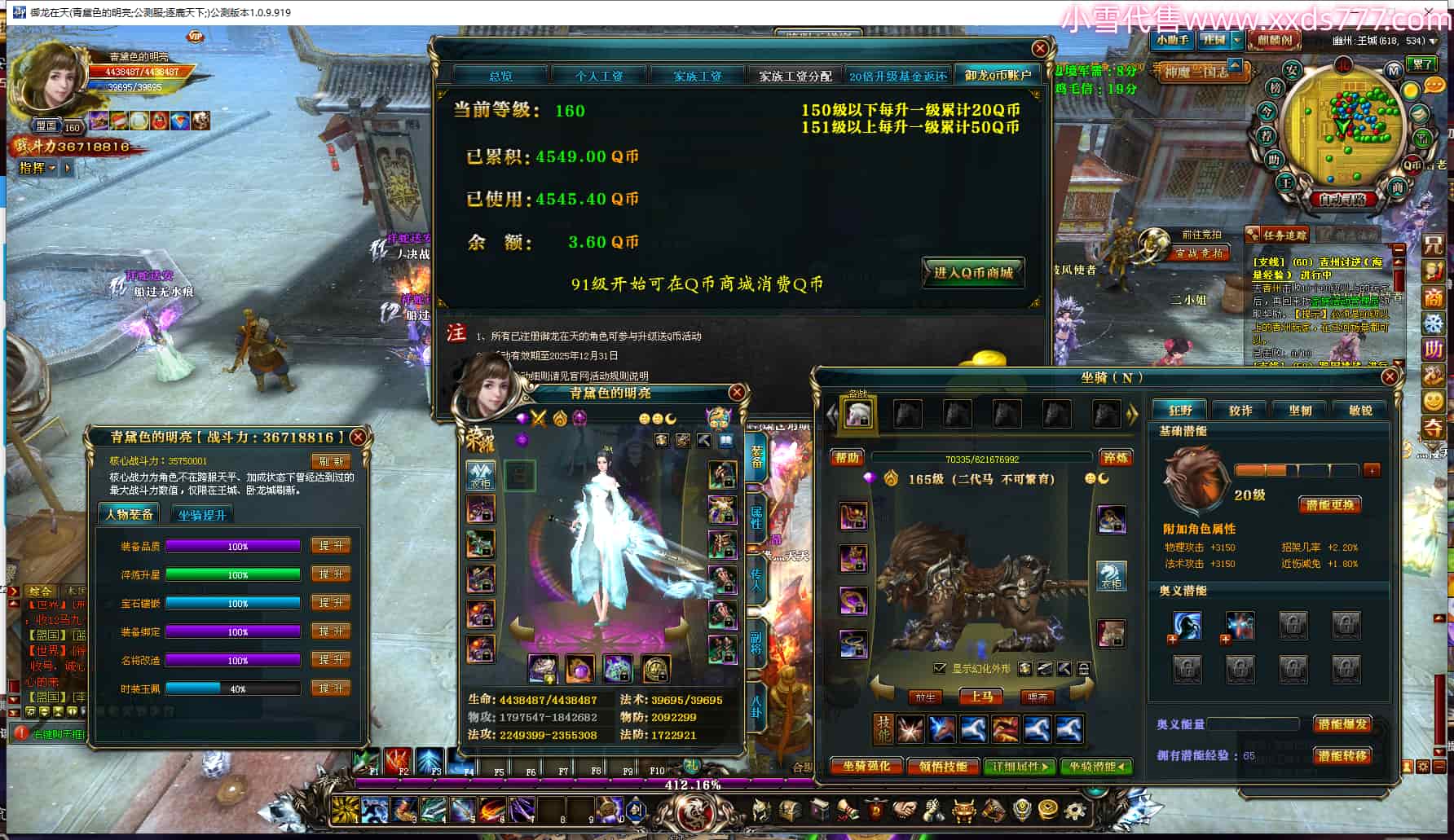 编号Z24307 青黛色的明亮 逐鹿天下 幽州 160级 3671W战力 人物黄金史诗紫15X(9件混沌) 传人精良紫12X 马史诗紫9X 人物星魂6级 人物铭刻12级 马铭刻12级 人物黄龙印(3件绿龙印) 五六等单双属性神圣完美无瑕石头 蓝黄孔