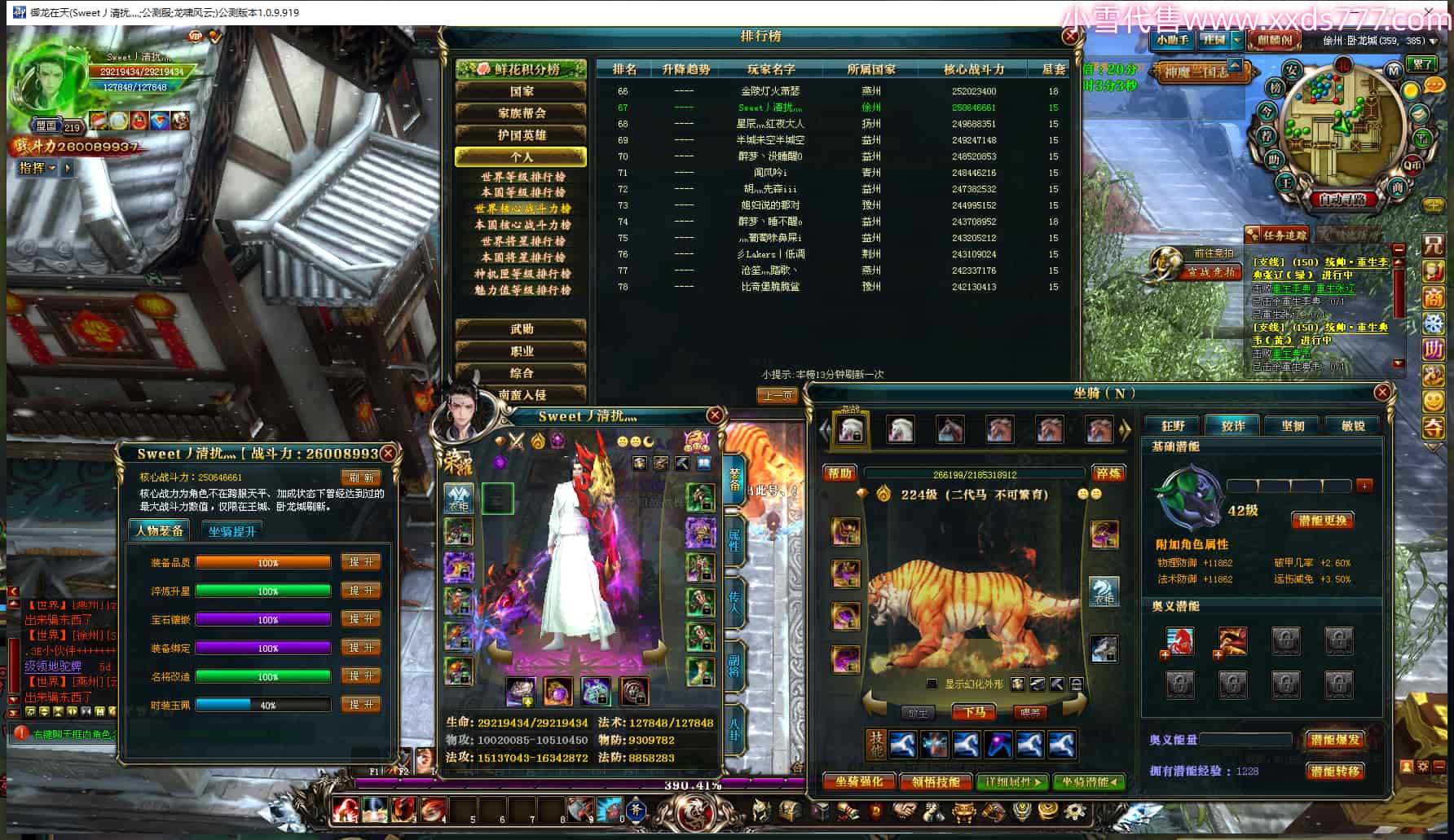 编号X24376 Sweet丿清扰灬 龙啸风云 徐州 世界排名67名 26008W战力 人物黄金极品橙15X(8件混沌) 传人史诗紫15X 副将史诗紫15X 马黄金加强橙12X 极品紫15披风 人物星魂16级 传人星魂16级 副将星魂10级 马星魂16级 人物铭刻3件16级其余15级 点亮16星 马铭刻13级 点亮12星 人物绿龙印(2件紫龙印) 马黄龙印 六等单双属性神圣完美无暇石头 黄绿孔 已开4次永久15星套