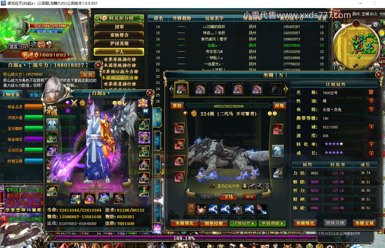 编号Z24391 拔地撒而起 逐鹿天下 扬州 210级 人物12X点星号 铭刻12级 点亮12星 传人12X 马9X 号内Q币43个 人物高淬136个 坐骑中淬21个