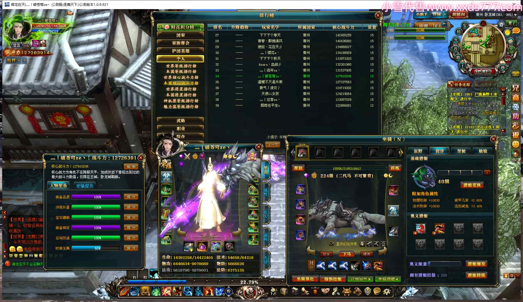 编号W24422 徒弟号号123 龙舞九州 豫州 218级 5924W战力 人物12X点星号 传人12X 副将12X 马9X 号内Q币32个 人物高淬64个 坐骑中淬43个