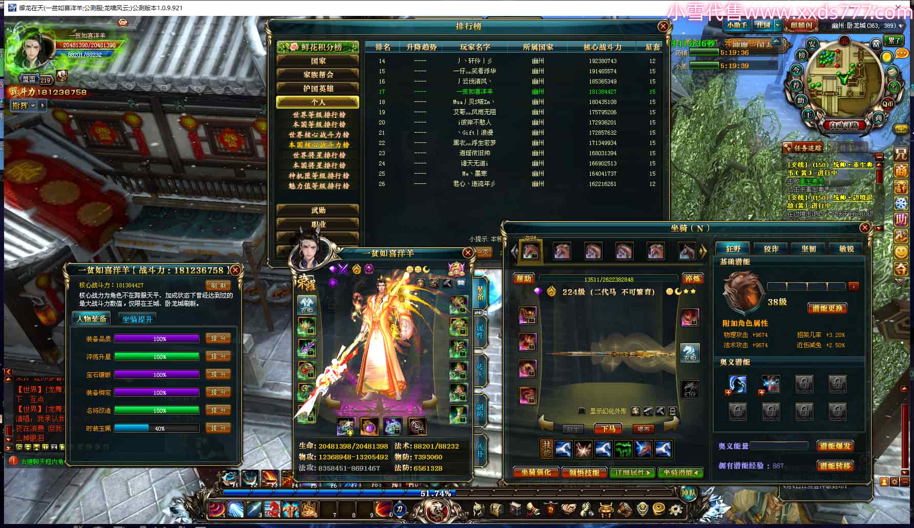 编号W24513 亦水寒i 龙舞九州 扬州 本国排名22名 16971W战力 人物黄金史诗紫15X(5件混沌) 传人精良紫12X 副将精良紫12X 马史诗紫12X 精良紫15披风 人物星魂16级 传人星魂14级 副将星魂6级 马星魂13级 人物铭刻15级 人物点亮4件16星其余14星 马铭刻12级 点亮12星 人物绿龙印 马黄龙印 五六等单双属性完美无暇神圣石头 蓝黄孔 已开2次永久15星套