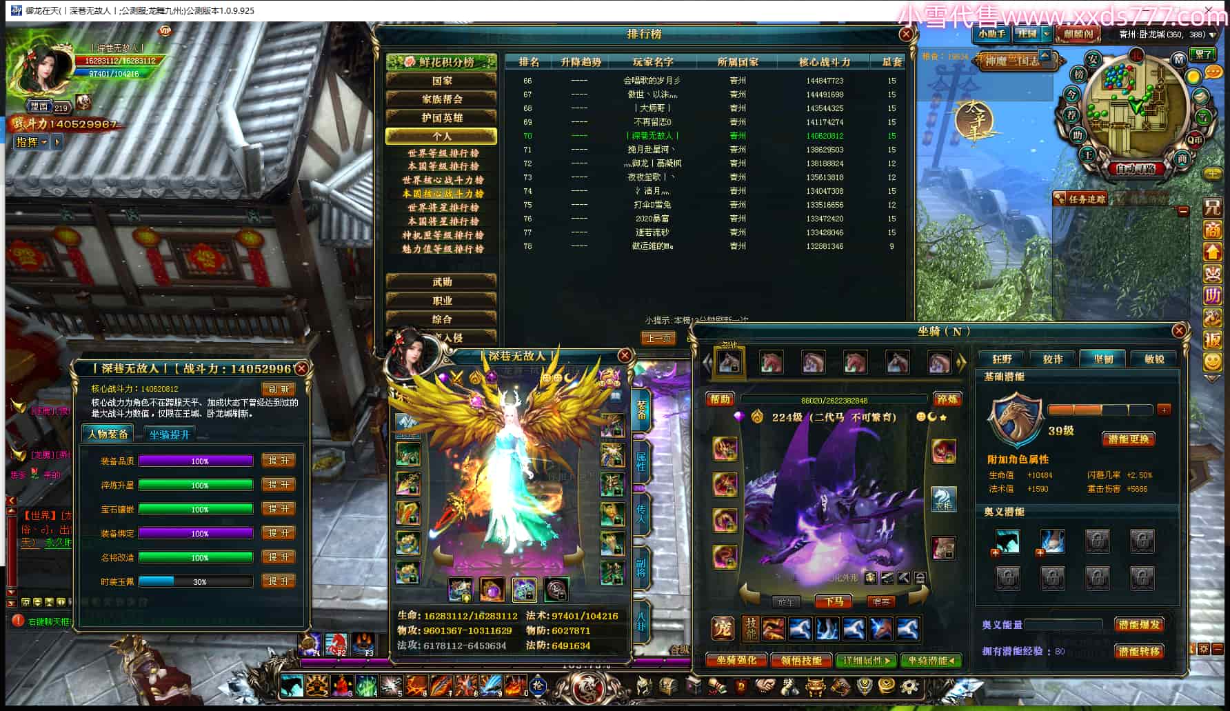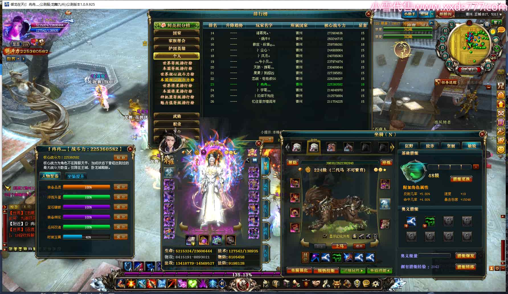 编号W24720 凉白开v丶 龙舞九州 青州 世界排名27名 36120W战力 人物混沌极品橙15X(3件18X) 传人黄金加强橙15X(1件18X) 副将史诗紫15X 马黄金精良橙13X(双潜能50级36级) 史诗紫17披风 人物星魂16级 传人星魂16级 副将星魂13级 马星魂16级 人物铭刻5件18级3件16级其余15级 点亮3件18星其余16星 马铭刻1件17级1件16级其余15级 点亮14星 人物紫龙印 马绿龙印 六等单双属性神圣完美石头 绿孔 已开完永久18星套