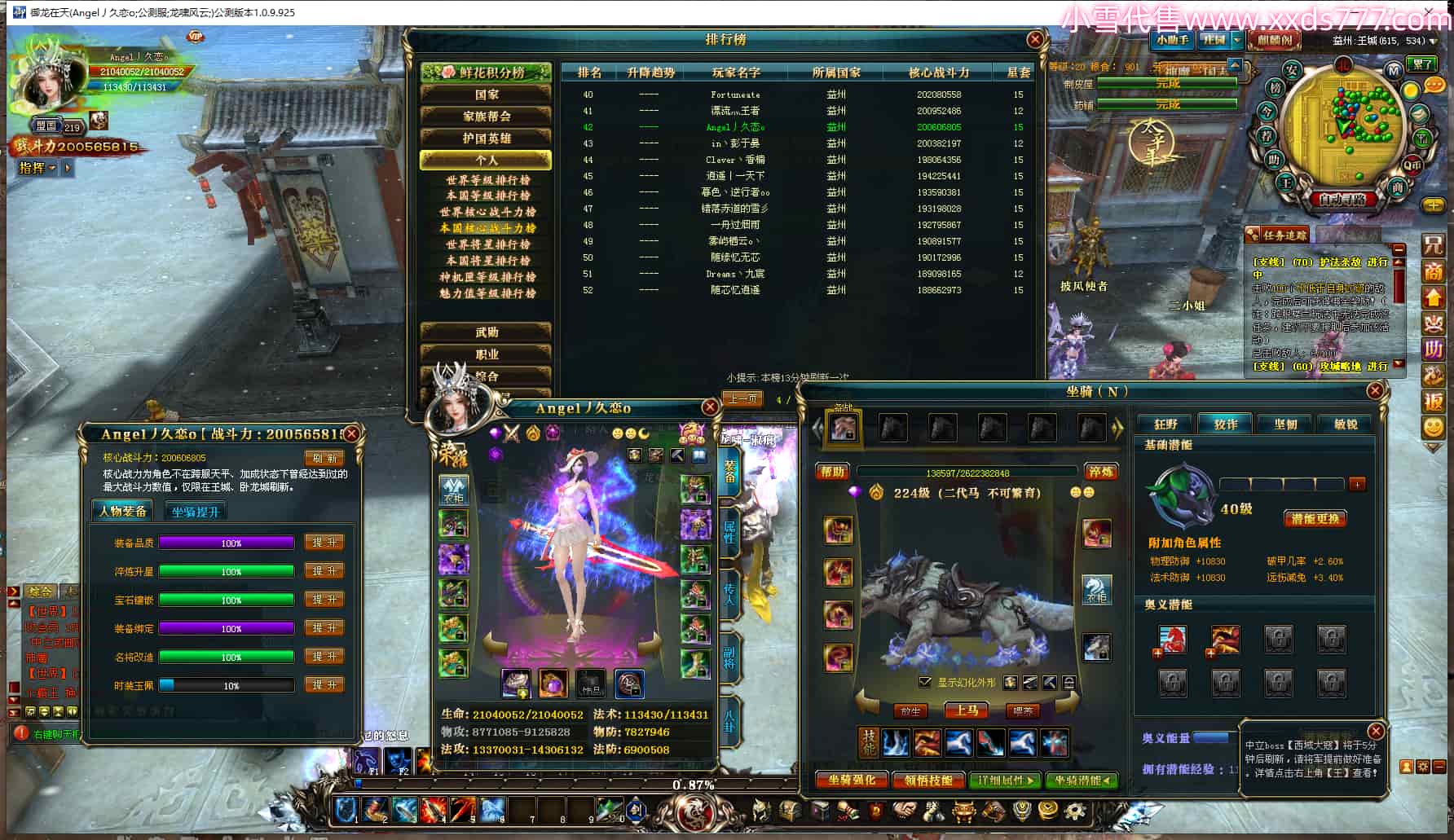 编号X24722 Angel丿久恋o 龙啸风云 益州 本国排名42名 20056W战力 人物黄金极品紫15X(2件18X6件混沌) 传人精良紫15X 副将精良紫12X 马史诗紫12X 精良紫15披风 人物星魂16级 传人星魂14级 副将星魂6级 马星魂16级 人物铭刻1件17级3件16级其余15级 点亮6件16星其余14星 马铭刻12级 点亮12星 人物绿龙印(2件紫龙印) 马黄龙印 五六等单双属性神圣完美无暇石头 蓝孔