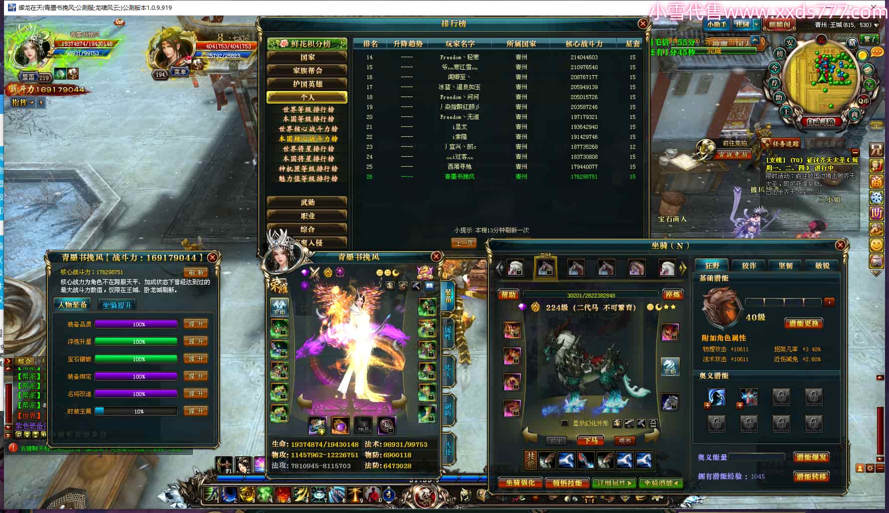 编号X22930 归缘i 龙啸风云 益州 本国排名88名 10177W战力 人物黄金史诗紫15X(5件混沌) 传人精良紫15X 副将精良紫15X 马精良紫11X 精良紫14披风 人物星魂14级 传人星魂6级 副将星魂6级 马星魂7级 人物铭刻15级 人物点亮16星 马铭刻12级 点亮12星 人物绿龙印(2件紫龙印) 马黄龙印 五六等单双属性神圣完美优秀石头 蓝黄孔 已开2次永久15星套