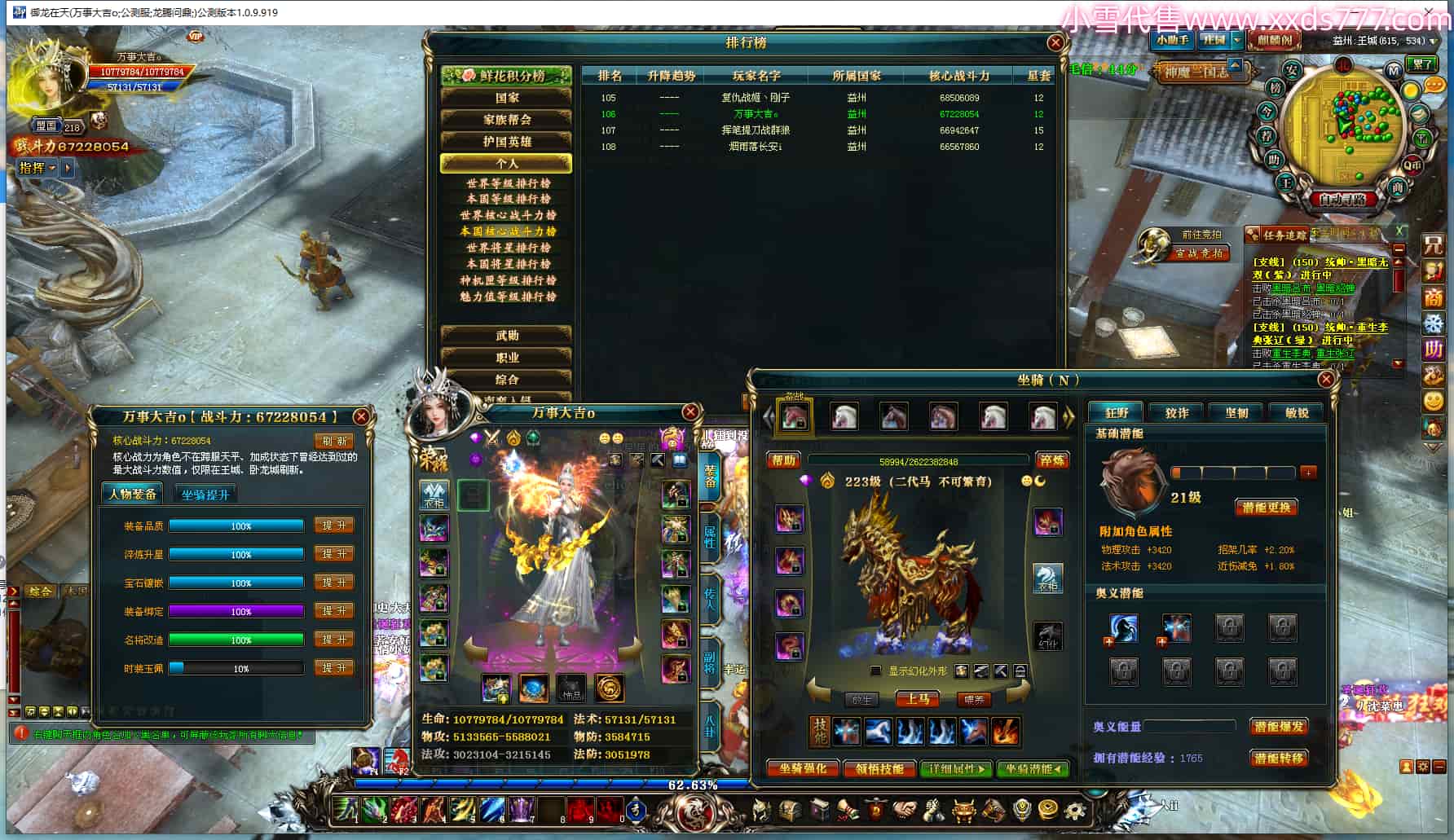 编号T22855 好运连连花海o 龙腾问鼎 扬州 212级 人物精良紫9X(8件15X) 铭刻12级 点亮12星 副将12X 马9X 号内Q币76个 人物高淬75个 坐骑中淬149个 坐骑高翠5个