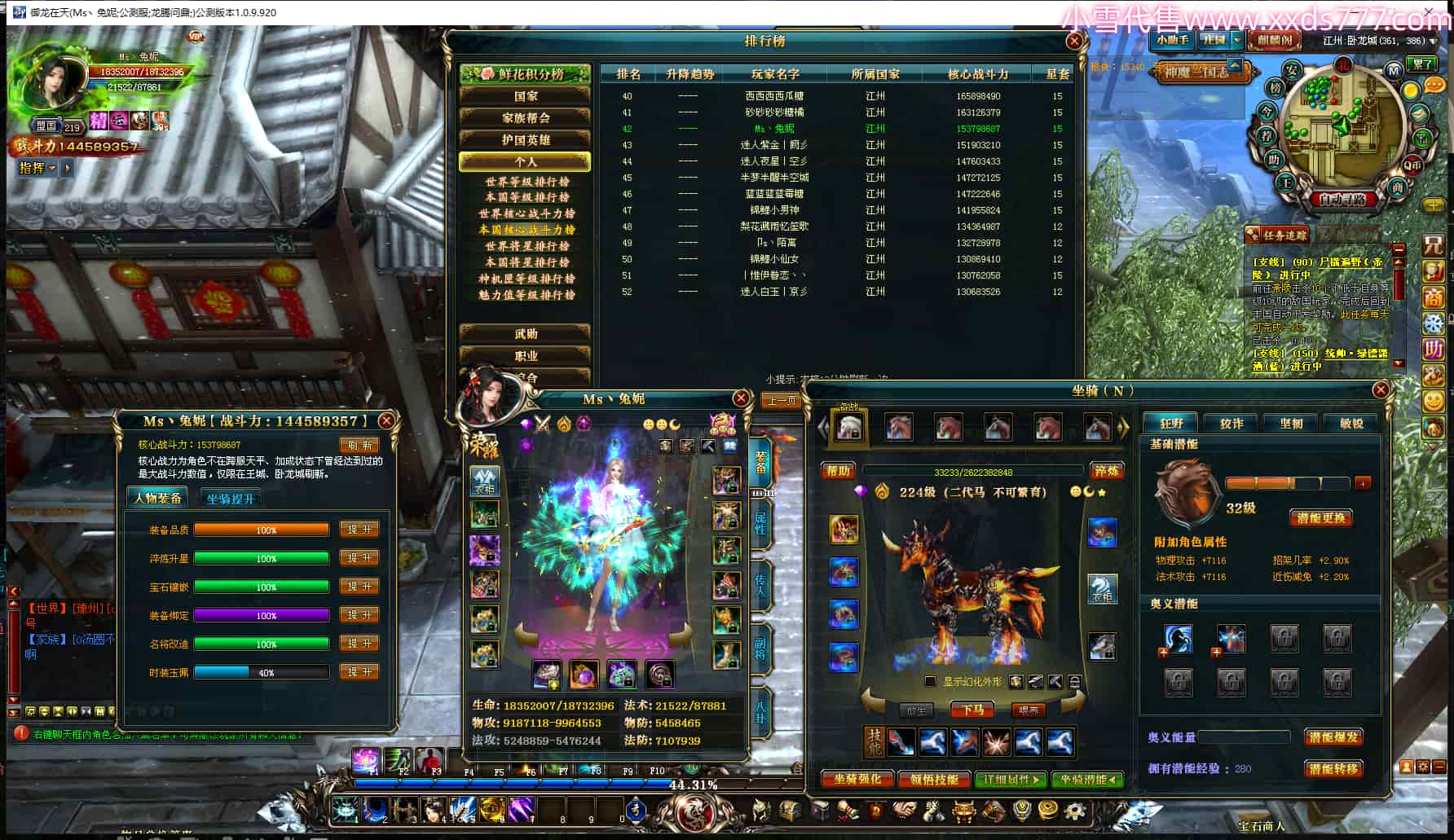 编号Y24163 钓鱼佬头王老三 龙耀狂飙 扬州 本国排名11名 2359W战力 人物黄金极品橙12X(4件15X5件混沌) 马普通橙10X 人物绿龙印 马黄龙印(1件绿龙印) 六等单双属性石头