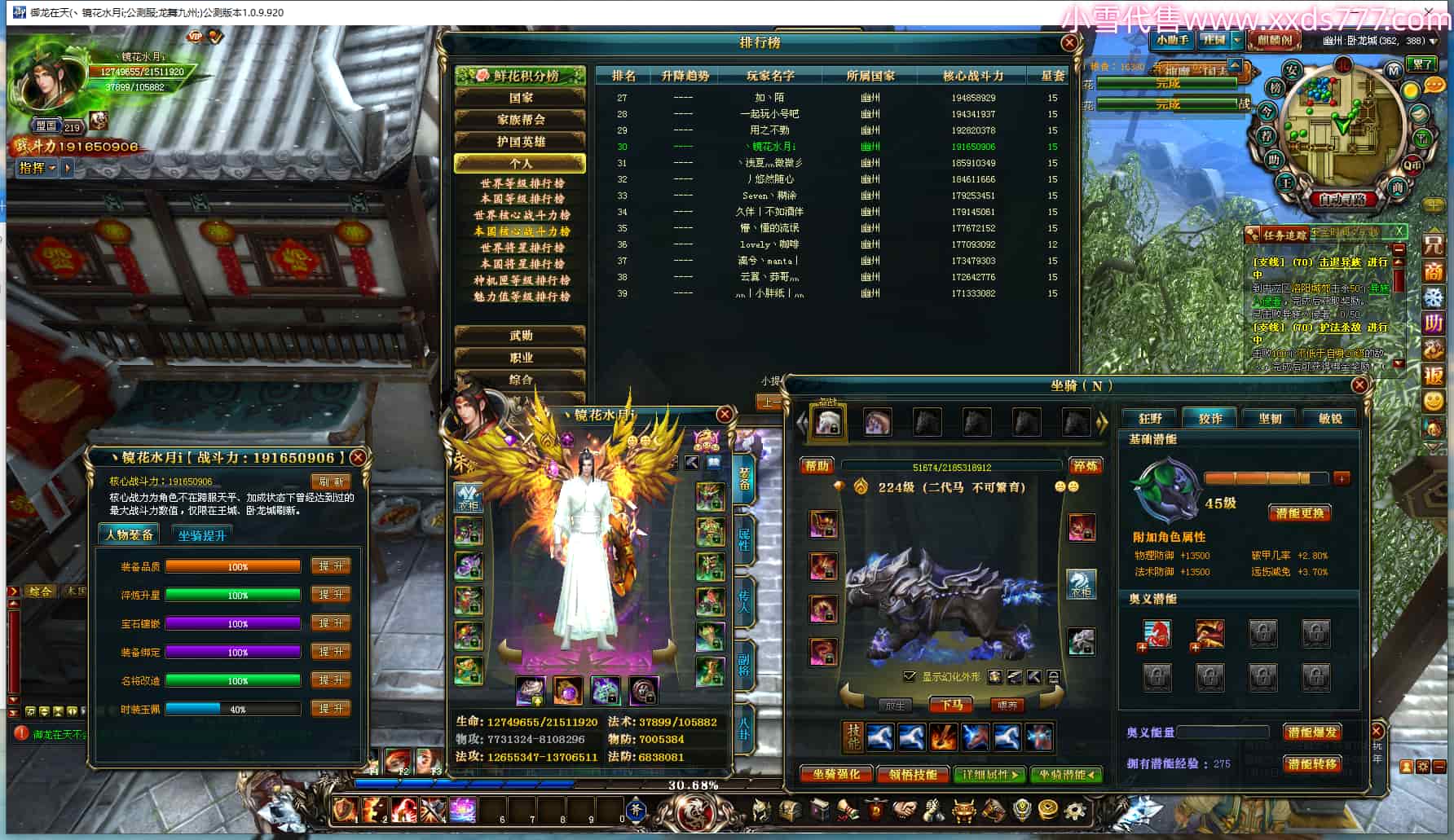编号Q23051 SmileFairy 群龙纵横 青州 本国排名30名 3750W战力 人物黄金普通橙12X(9件15X4件混沌) 马史诗紫10X 人物绿龙印(2件紫龙印) 马黄龙印 六等单双属性石头 已开启永久15星套 可以转移百分百安全