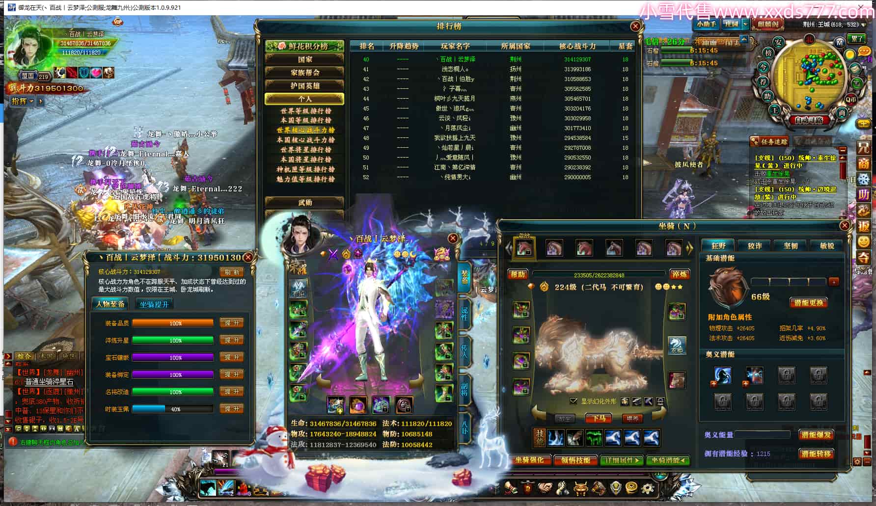 编号X23233 小别兔别又别i 龙啸风云 幽州 世界排名21名 32417W战力 人物混沌极品橙15X(4件18X) 传人普通橙15X 副将史诗紫15X 马黄金加强橙14X(双潜能50级40级) 极品紫16披风 人物星魂16级 传人星魂16级 副将星魂13级 马星魂16级 人物铭刻2件18级2件16级其余15级 人物点亮2件18星其余16星 马铭刻14级 点亮14星 人绿龙印(3件紫龙印) 马绿龙印 六等单双属性神圣完美优秀石头 绿紫孔 已开启永久18星套