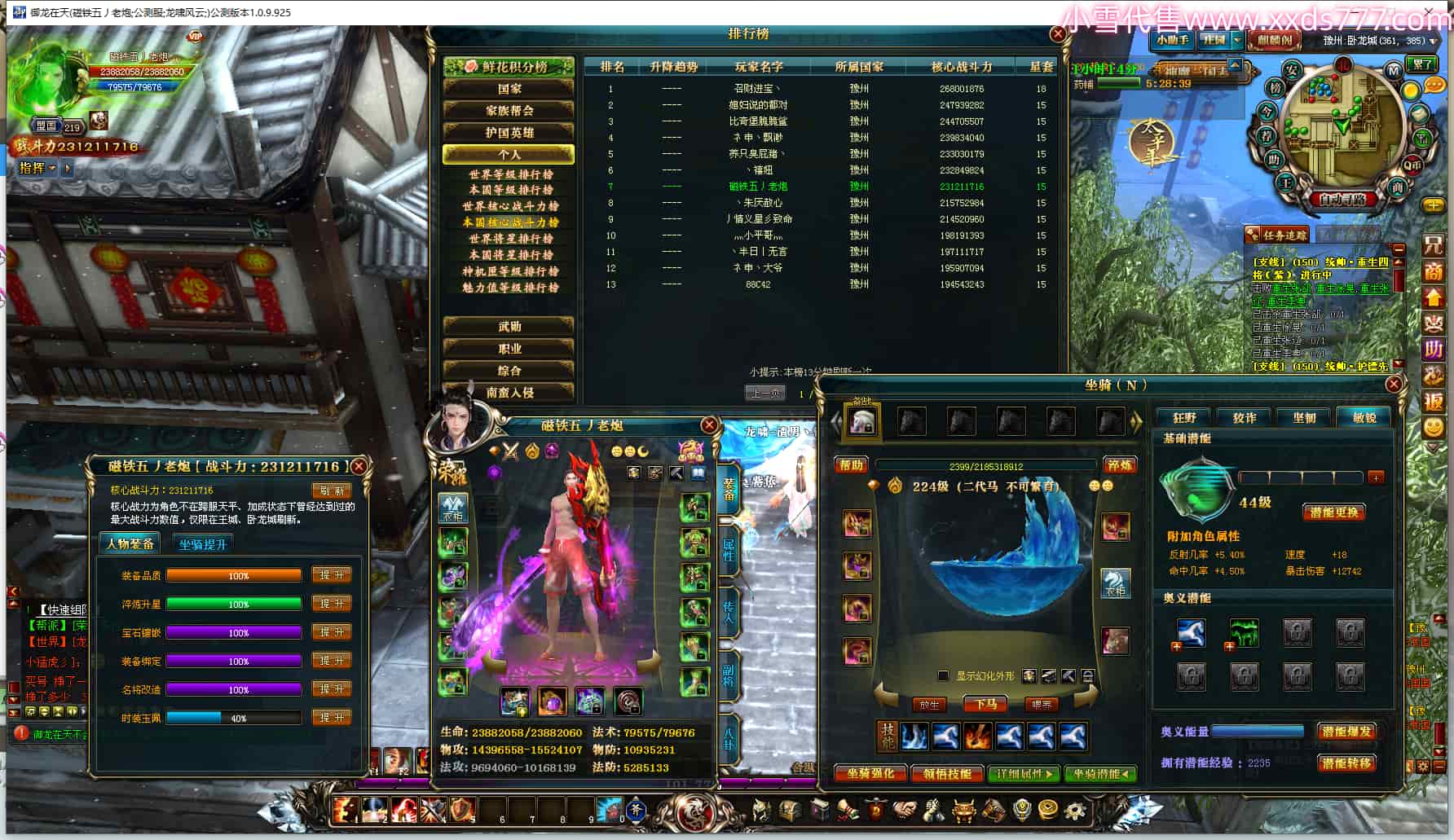 编号W24709 隔壁老王灬御龙 龙舞九州 荆州 11744W战力 人物黄金史诗紫15X(5件混沌) 传人精良紫12X 副将加强紫12X 马精良紫9X 加强紫13披风 人物星魂14级 传人6级 副将4级 马星魂7级 人物铭刻5件15级其余14级 点亮1件16星其余14星 马铭刻12级 点亮10星 人物绿龙印(1件紫龙印) 马蓝龙印(2件黄龙印) 五等单双属性神圣完美无瑕石头 蓝白孔