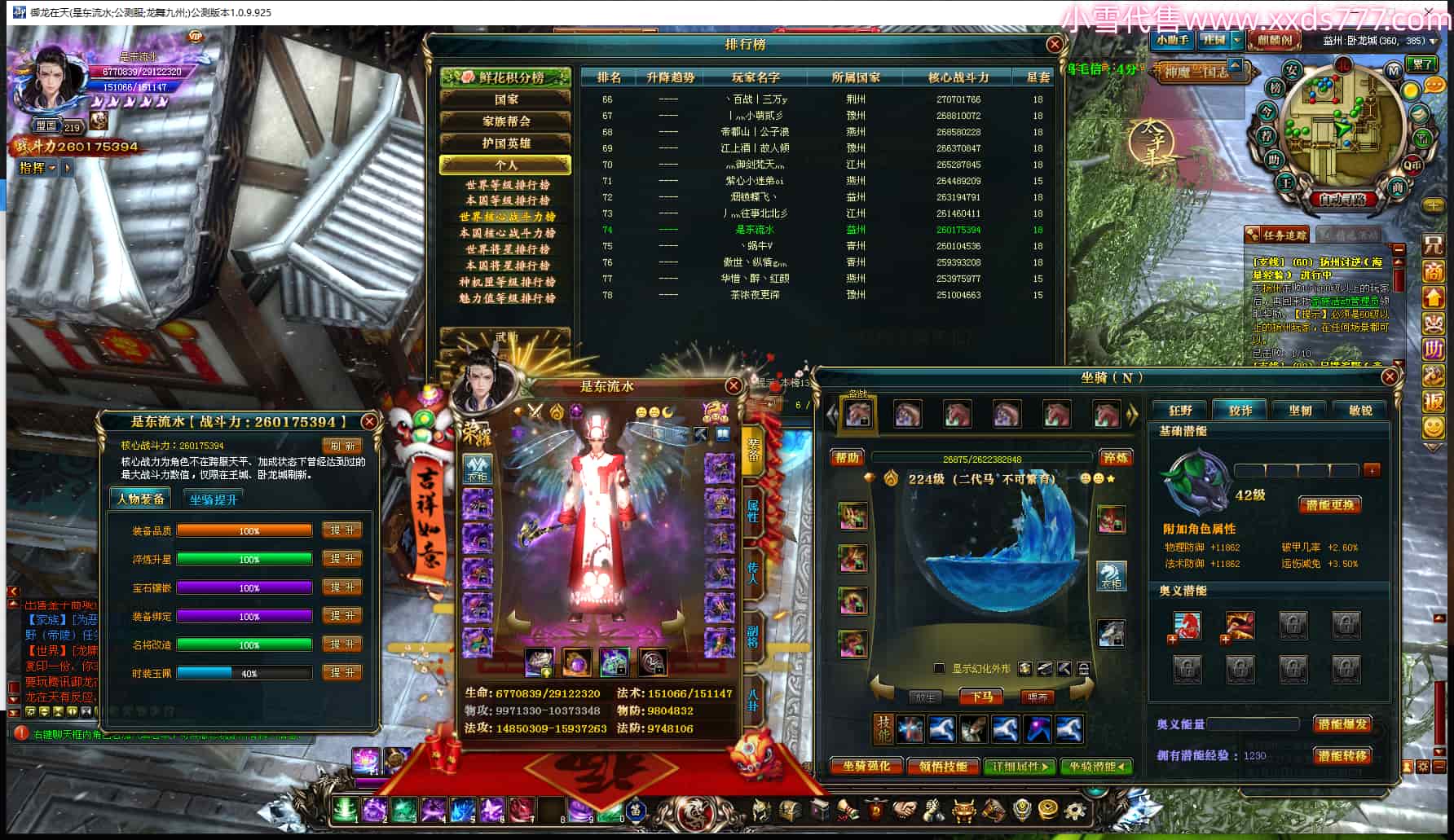 编号W24703 是东流水 龙舞九州 益州 世界排名74名 26017W战力 人物黄金极品橙15X(1件17X7件混沌) 传人精良紫15X 副将精良紫15X 马加强橙13X 极品紫15披风 人物星魂16级 传人星魂10级 副将星魂6级 马星魂16级 人物铭刻1件16级其余15级 点亮16星 马铭刻14级 点亮12星 人物紫龙印 马绿龙印 六等单双属性完美神圣石头 黄绿孔 已开启永久18星套