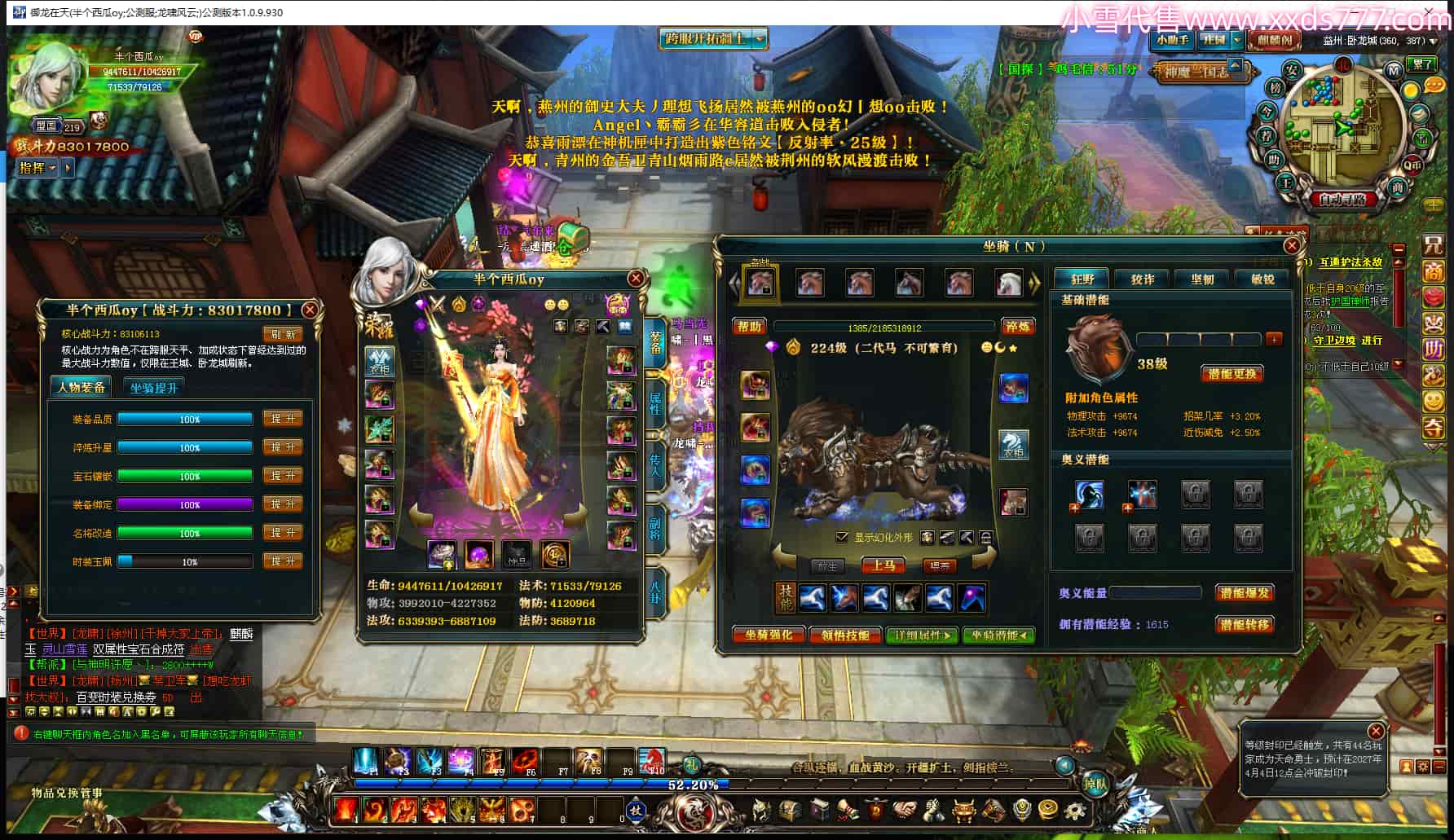 编号X25147 半个西瓜oy 龙啸风云 益州 8301W战力 人物精良紫12X(1件15X) 传人精良紫12X 副将精良紫12X 马极品紫9X 加强紫14披风 人物星魂10级 传人星魂3级 马星魂5级 人物铭刻1件15级4件14级2件13级其余12级 人物点亮1件14星其余12星 马铭刻1件14级其余12级 点亮12星 人物绿龙印 马蓝龙印(2件黄龙印) 五等单双属性神圣完美优秀石头 白孔