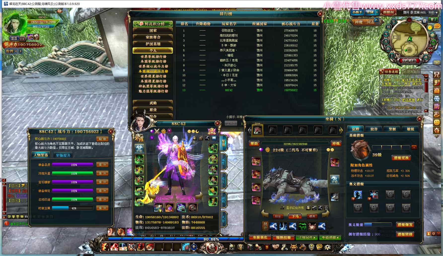 编号Q24004 小孤隐oi丶 群龙纵横 青州 世界排名82名 5000W战力 人物黄金加强橙15X(6件混沌) 马黄金史诗紫12X 人物绿龙印(1件紫龙印) 马绿龙印 六等单双属性石头 已开完永久15星套 可以转移百分百安全