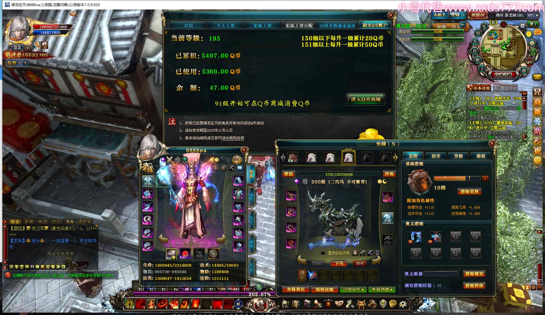 编号T24424 8888na 龙腾问鼎 燕州 195级 人物12X点星号 铭刻12级 马9X 号内Q币47个 人物高淬9个 坐骑中淬20个