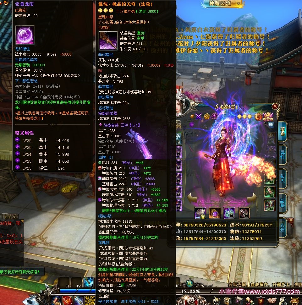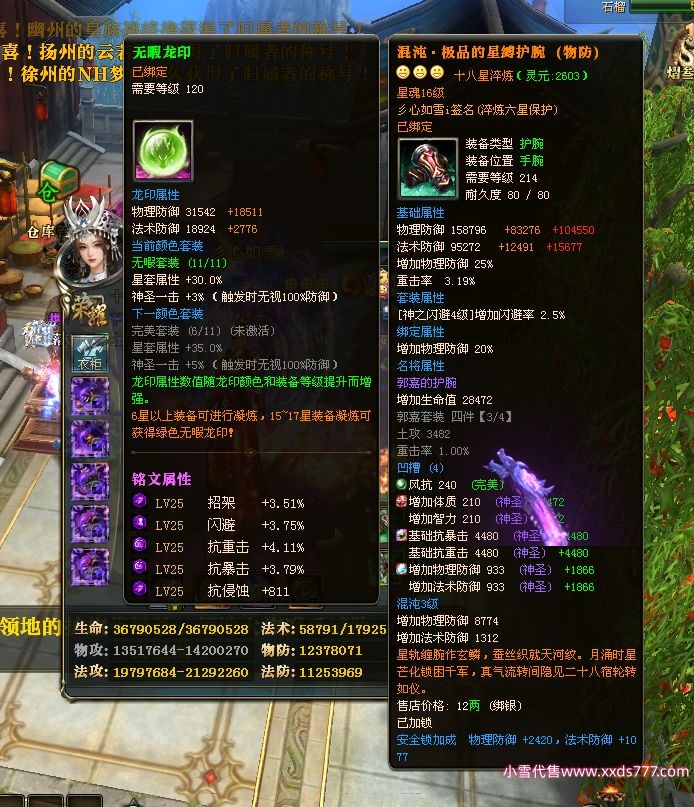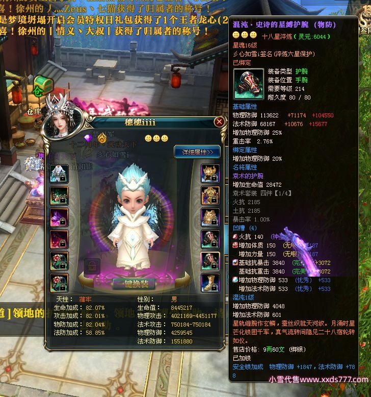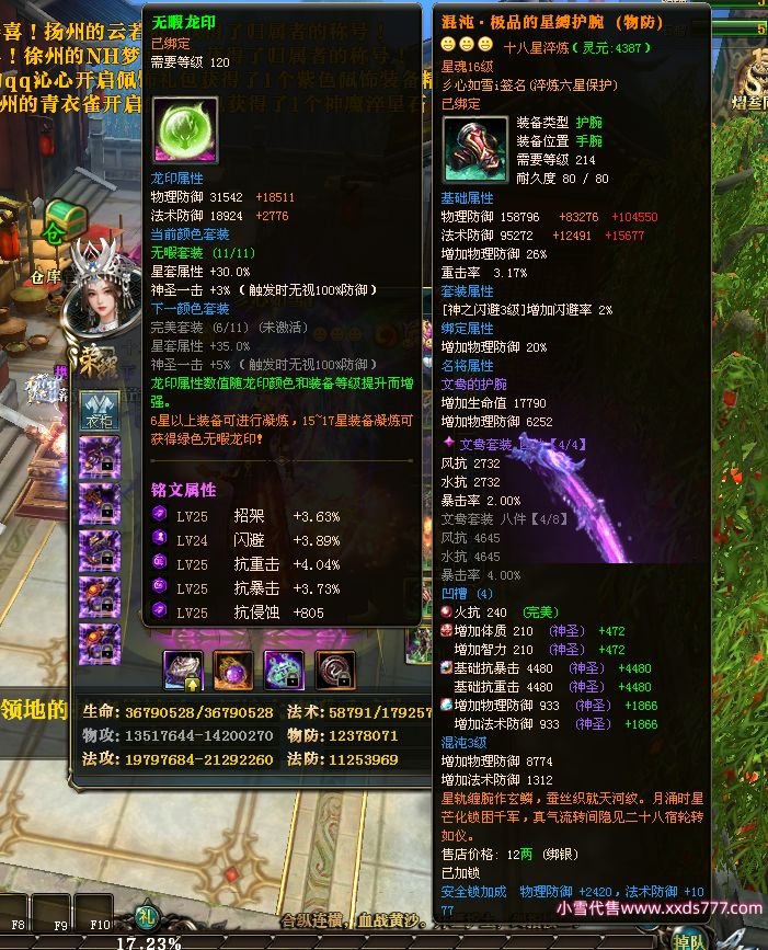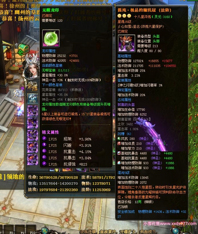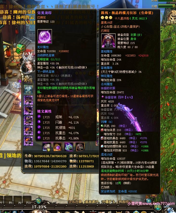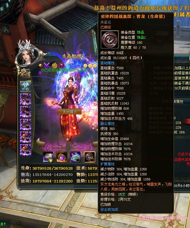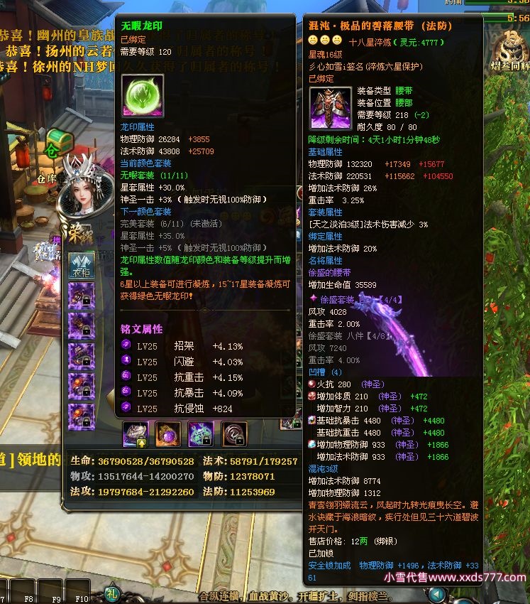 编号T22544 彡心如雪i 龙腾问鼎 江州 世界排名25名 36375W战力 人物混沌极品橙18X 传人黄金史诗紫18X(6件混沌) 副将史诗紫12X 马黄金极品橙13X(双潜能74级63级) 极品紫17披风 人物星魂16级 传人星魂16级 副将星魂6级 马星魂16级 人物铭刻18级 人物点亮18星 马铭刻13级 点亮14星 人物绿龙印(6件紫龙印) 马绿龙印 六等单双属性神圣完美石头 绿紫孔 已开1次永久18星套 可以转移百分百安全