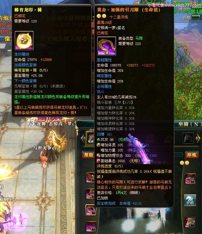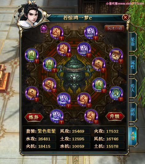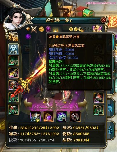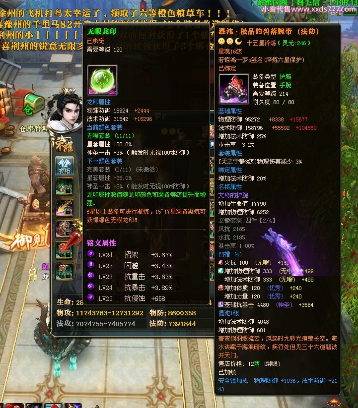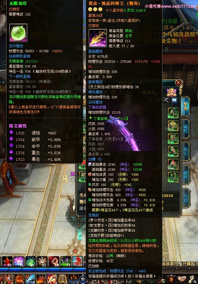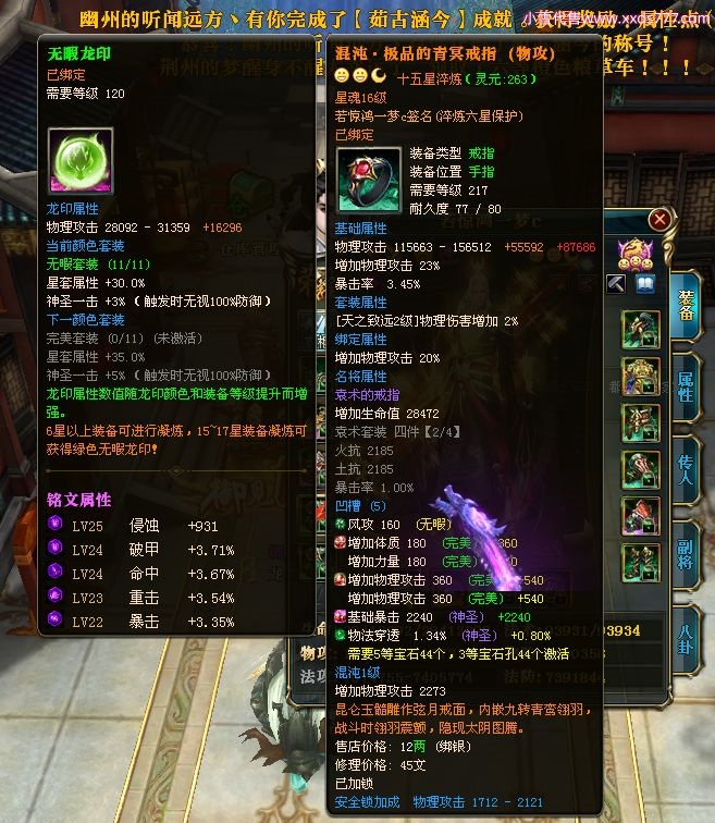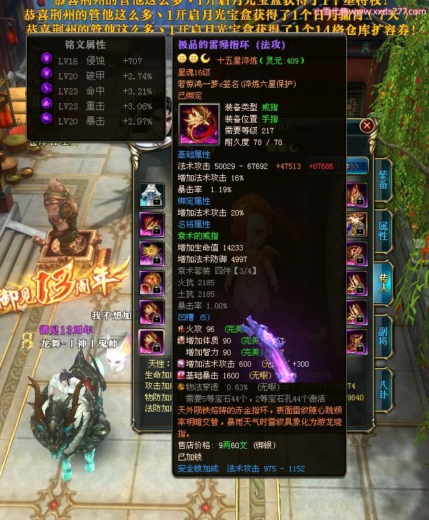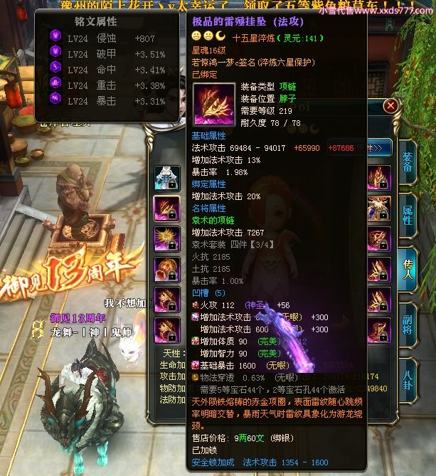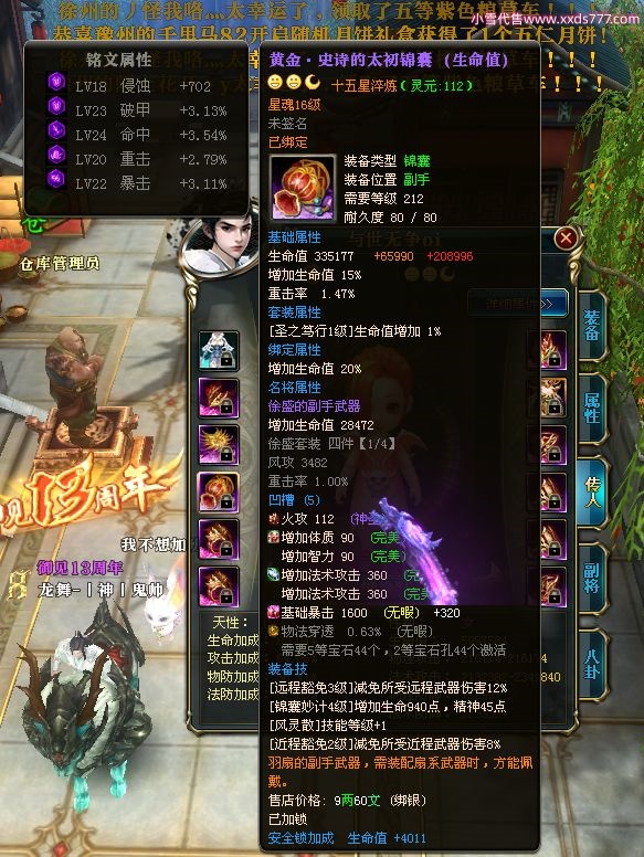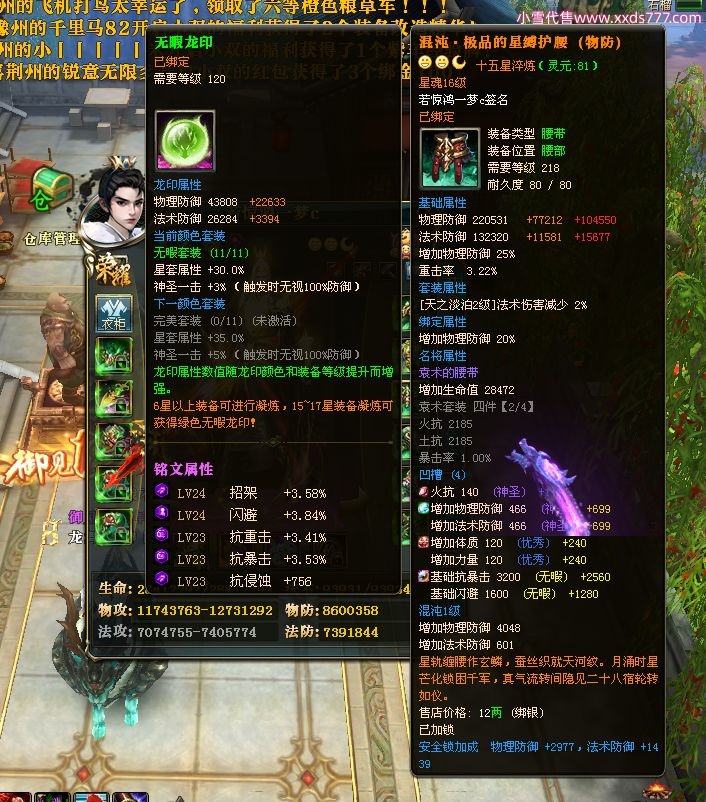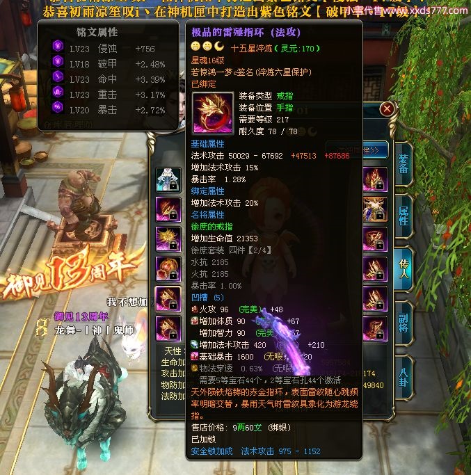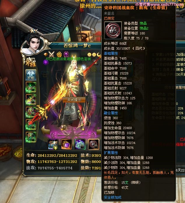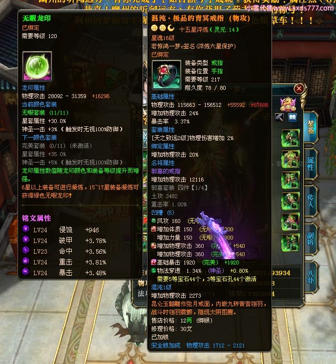 编号W22967 若惊鸿一梦c 龙舞九州 益州 本国排名12名 20547W战力 人物黄金极品紫15X(1件18X9件混沌) 传人史诗紫15X 副将精良紫12X 马黄金加强橙12X 极品紫15披风 人物星魂16级 传人星魂12级 副将星魂6级 马星魂16级 人物铭刻15级 点亮16星 马铭刻4件14级其余13级 点亮12星 人物绿龙印 马黄龙印 六等单双属性神圣完美无暇石头 黄绿孔 已开1次永久15星套