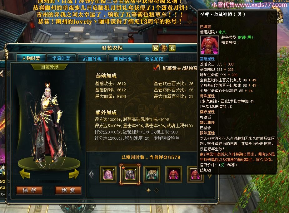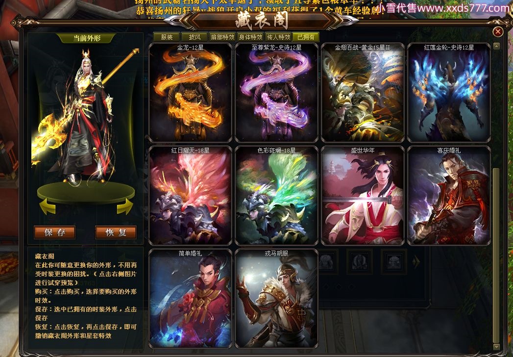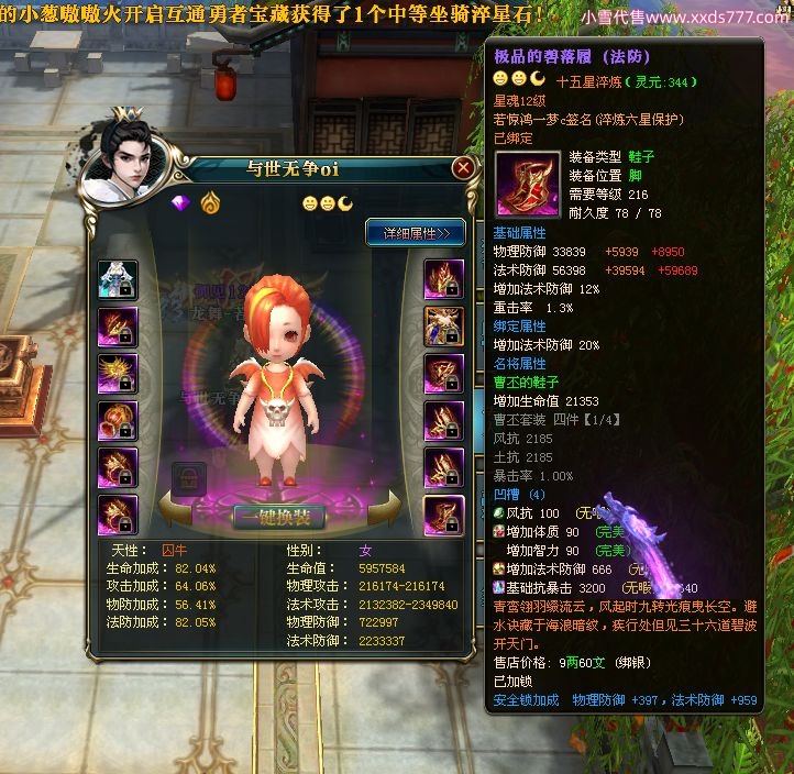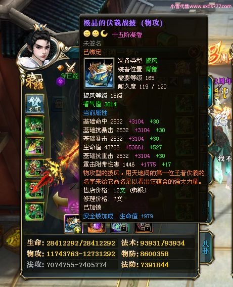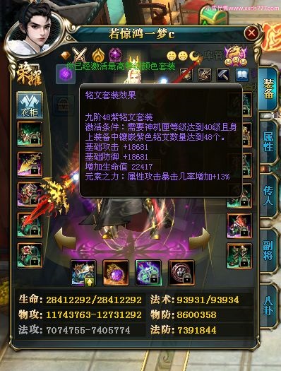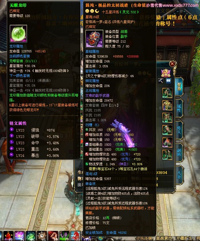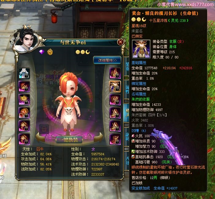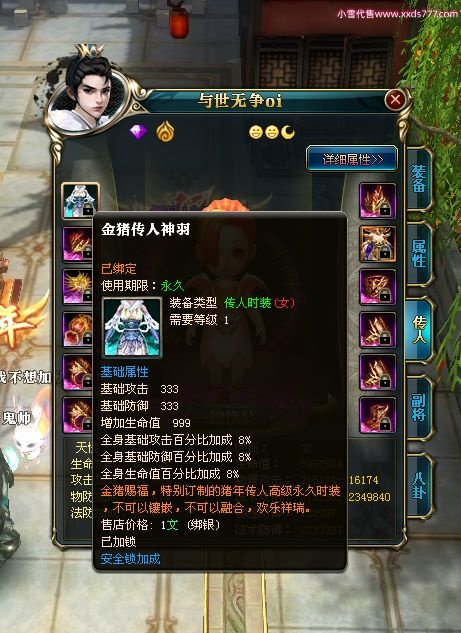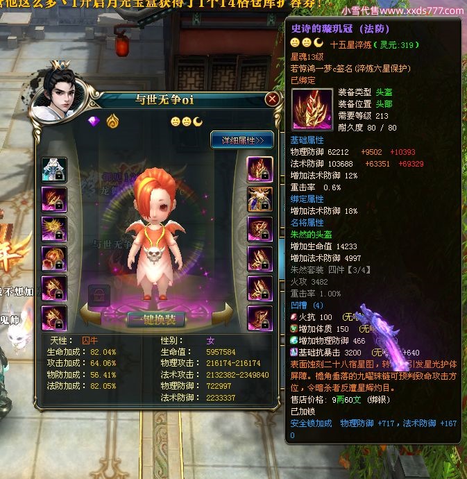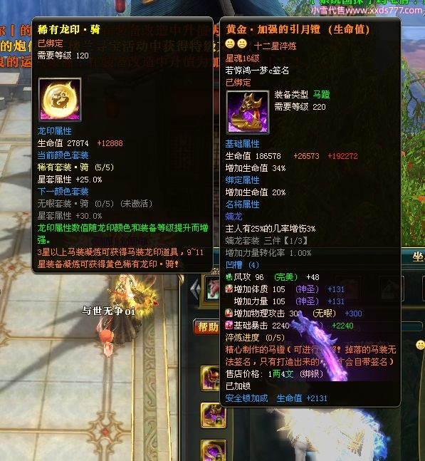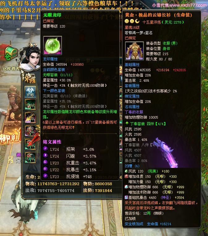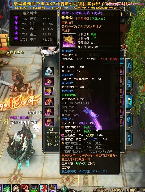 编号W22967 若惊鸿一梦c 龙舞九州 益州 本国排名12名 20547W战力 人物黄金极品紫15X(1件18X9件混沌) 传人史诗紫15X 副将精良紫12X 马黄金加强橙12X 极品紫15披风 人物星魂16级 传人星魂12级 副将星魂6级 马星魂16级 人物铭刻15级 点亮16星 马铭刻4件14级其余13级 点亮12星 人物绿龙印 马黄龙印 六等单双属性神圣完美无暇石头 黄绿孔 已开1次永久15星套