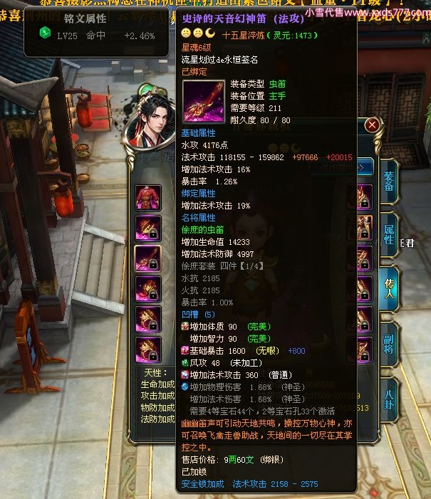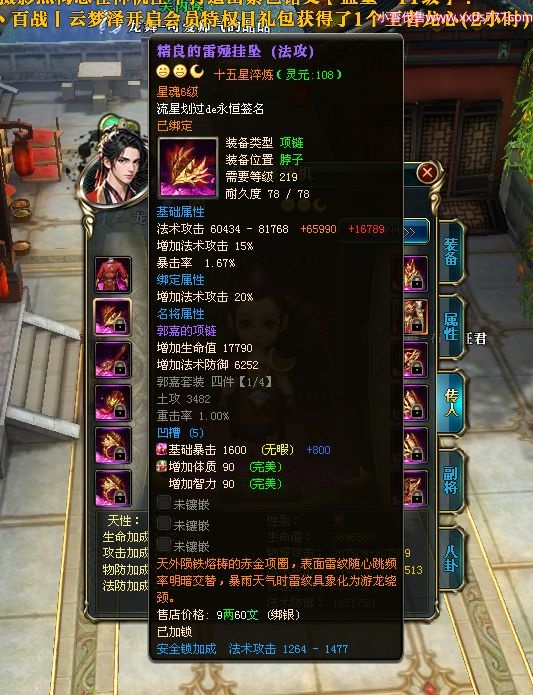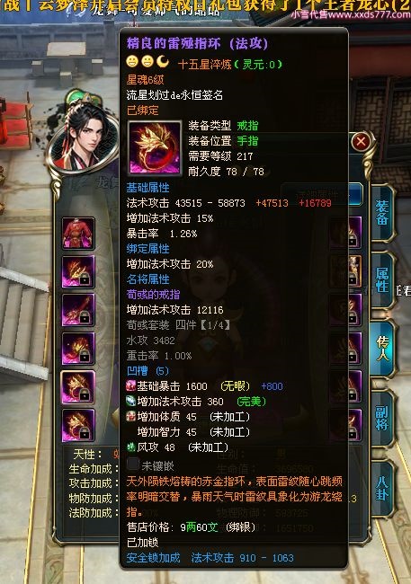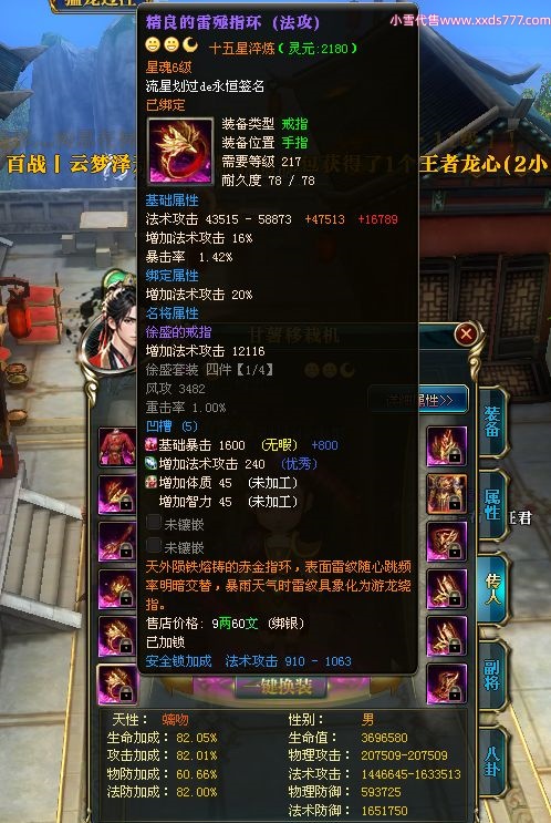 编号W23190 流星划过de永恒 龙舞九州 有州 本国排名46名 14523W战力 人物黄金史诗紫15X(4件混沌) 传人精良紫15X 副将精良紫12X 马史诗紫10X 精良紫14披风 人物星魂15级 传人星魂6级 副将星魂6级 马星魂10级 人物铭刻15级 点亮16星 马铭刻15级 点亮10星 人物绿龙印 马黄龙印 五六等单双属性神圣完美无暇石头 蓝孔