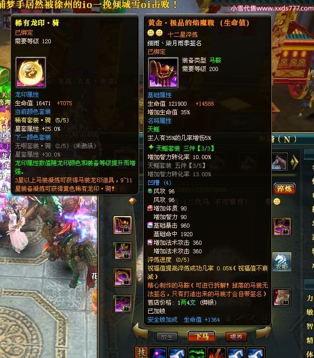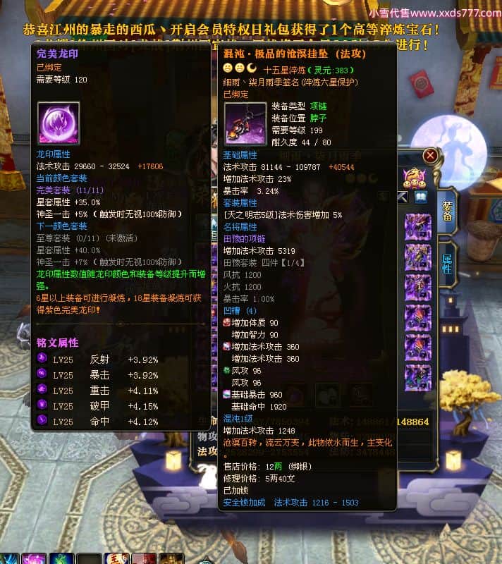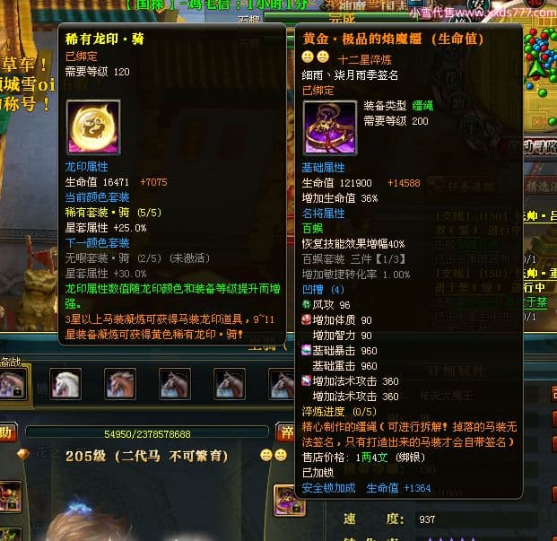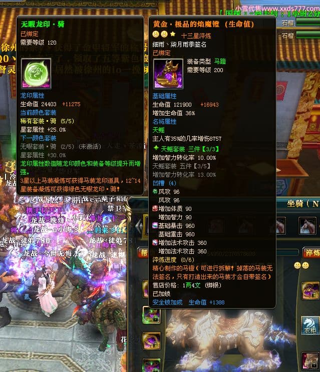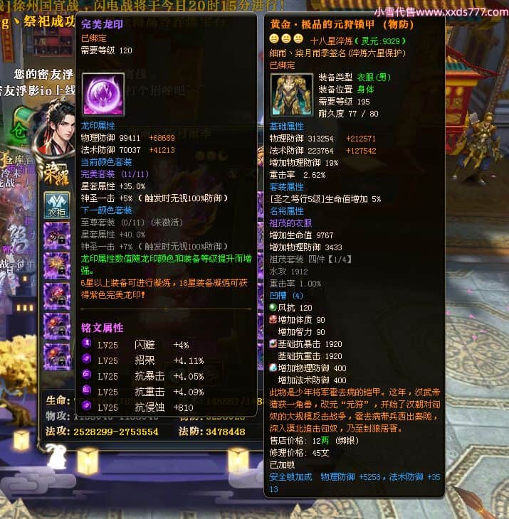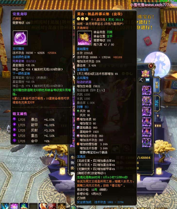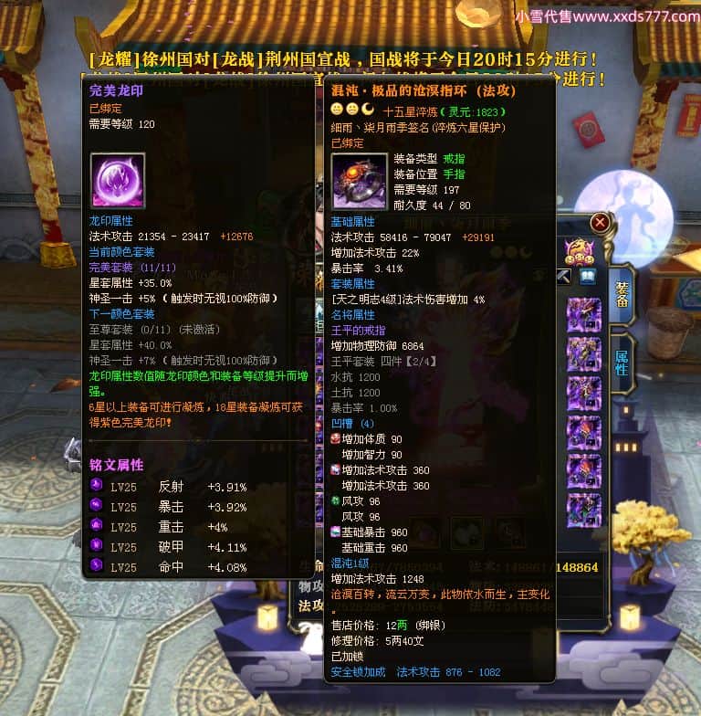编号L23247 细雨丶柒月雨季 龙战王者 燕州 世界排名31名 6965W战力 人物黄金极品橙15X(3件18X9件混沌) 马黄金极品橙12X(双潜能74级67级) 人物紫龙印 马黄龙印(2件绿龙印) 六等单双属性石头 已开2次永久15星套 可以转移百分百安全