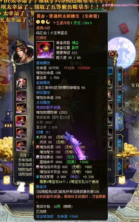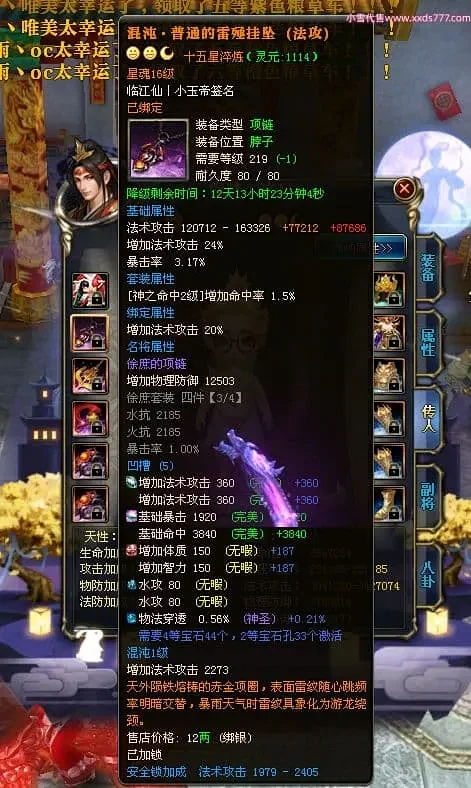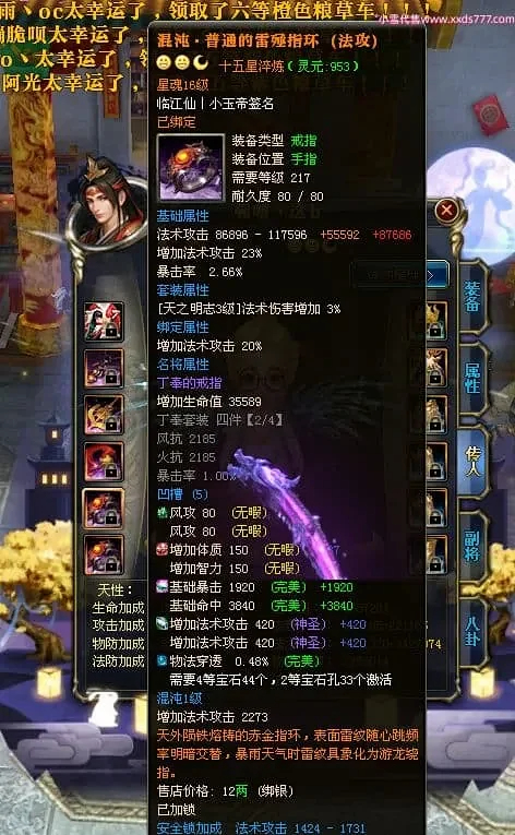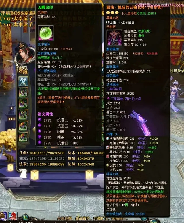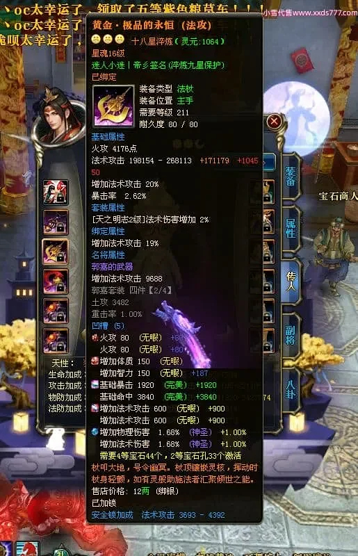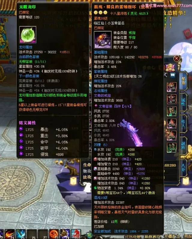 编号T23243 迷人小迷丨帝彡 龙腾问鼎 江州 世界排名40名 32224W战力 人物混沌极品橙15X(7件18X) 传人黄金普通橙15X(1件18X4件混沌) 副将史诗紫15X 马黄金精良橙13X(双潜能50级32级) 极品紫16披风 人物星魂16X 传人星魂16级 副将星魂7级 马星魂16级 人物铭刻5件18级其余15级 点亮1件18星其余16星 马铭刻3件14级其余13级 点亮14星 人物绿龙印 马绿龙印 六等单双属性神圣完美石头 黄绿孔 可以转移百分百安全