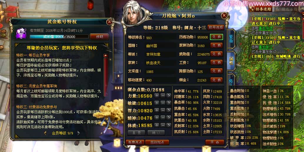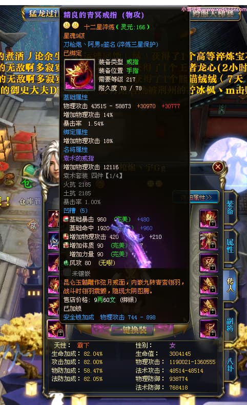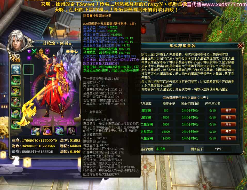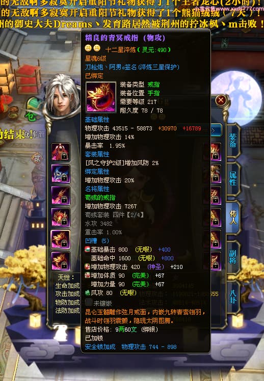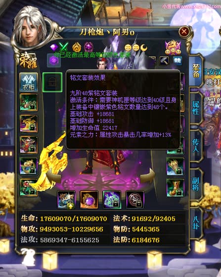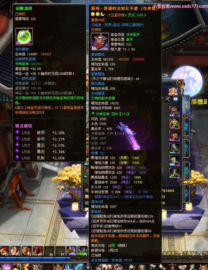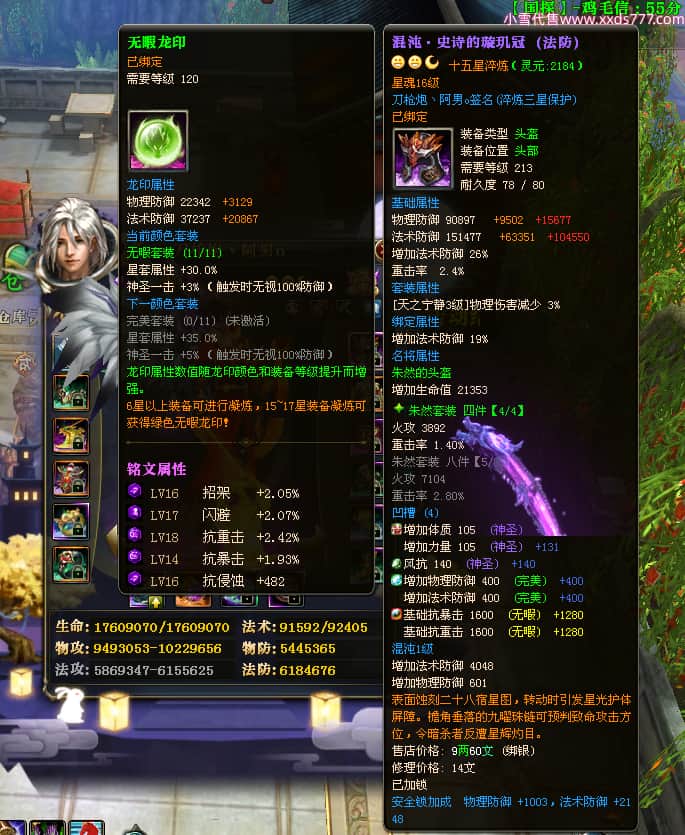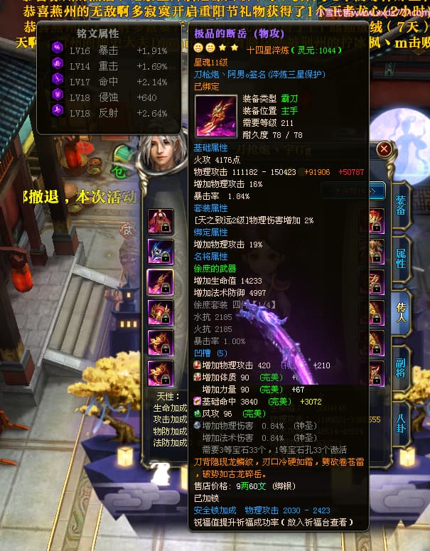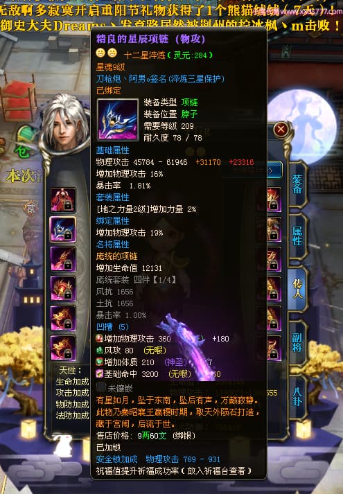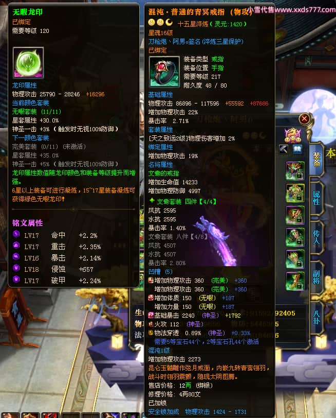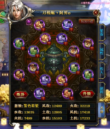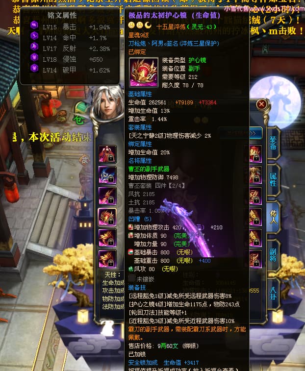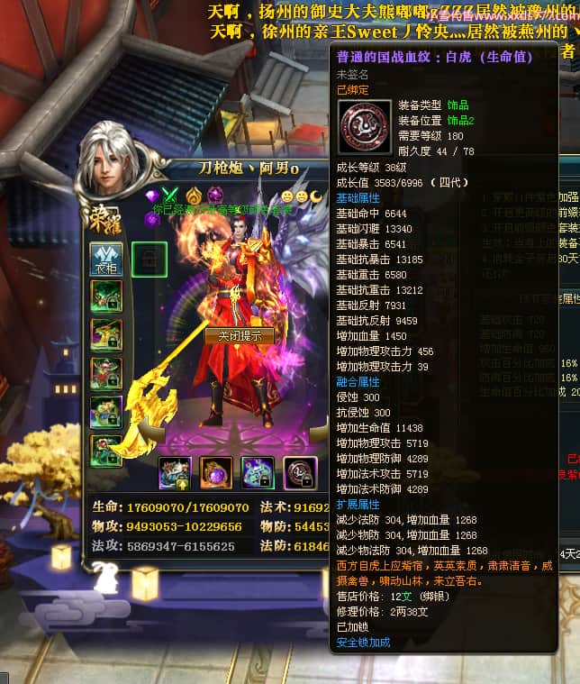 编号X23347 刀枪炮丶阿男o 龙啸风云 幽州 本国排名29名 13796W战力 人物黄金精良紫15X(5件混沌) 传人精良紫12X 副将精良紫12X 马极品紫12X 精良紫15披风 人物星魂16级 传人星魂6级 副将星魂6级 马星魂11级 人物铭刻15级 人物点亮16星 马铭刻2件13级其余12级 点亮2件14星其余12星 人物绿龙印 马黄龙印(1件绿龙印) 六等单双属性神圣完美优秀石头 蓝黄孔
