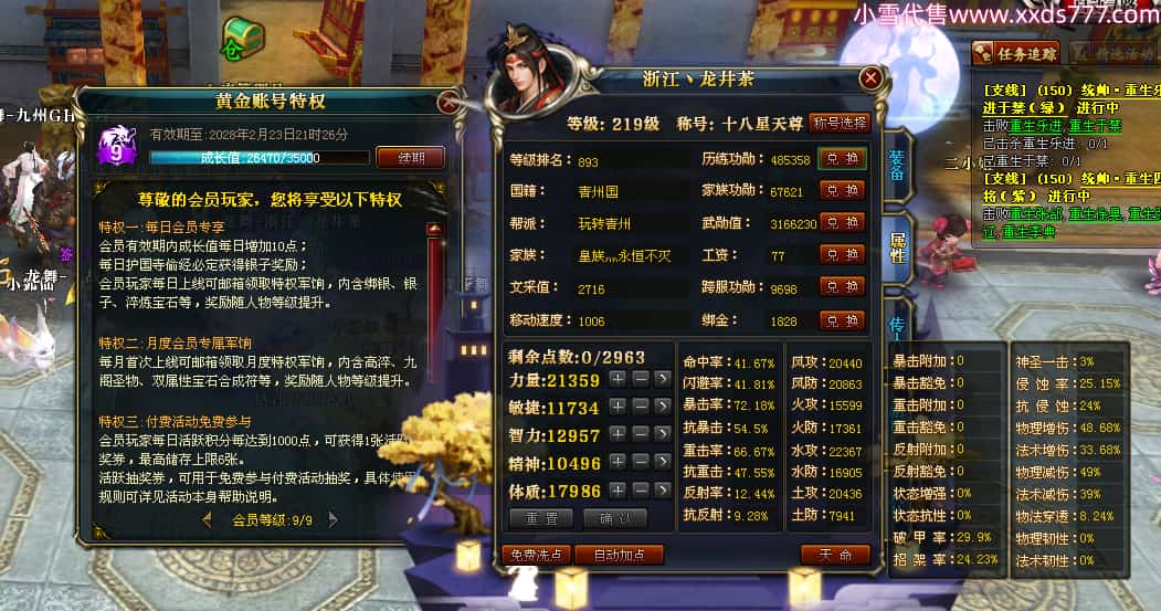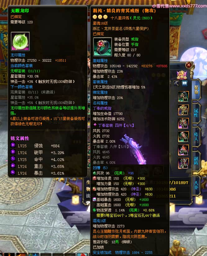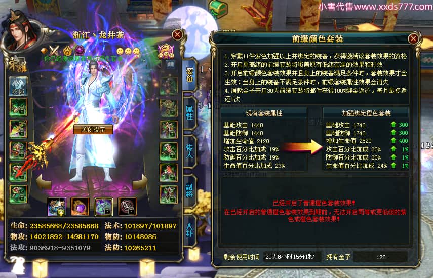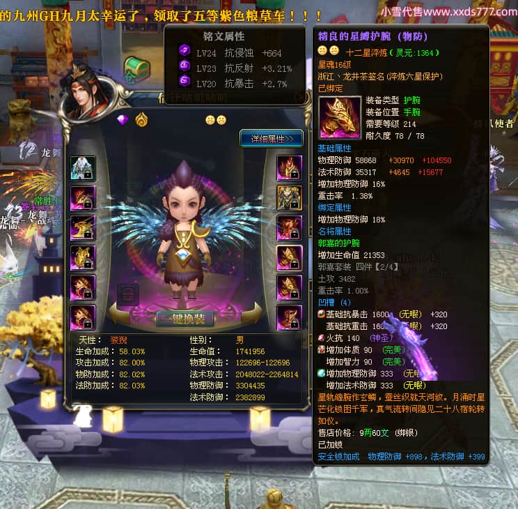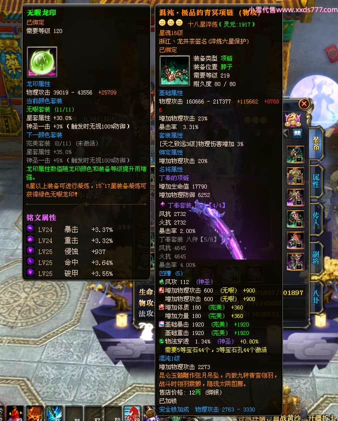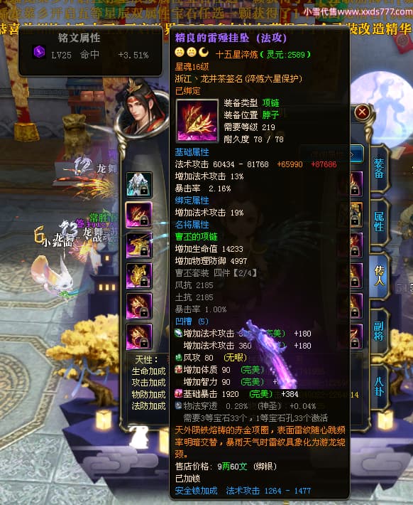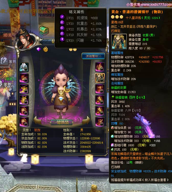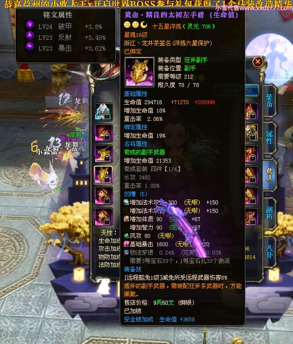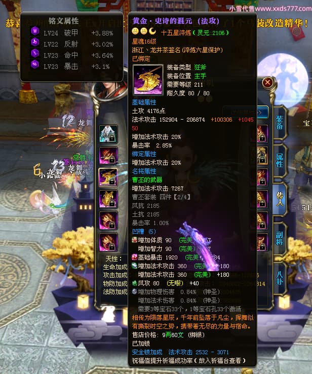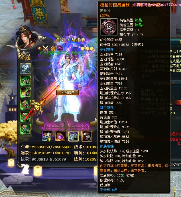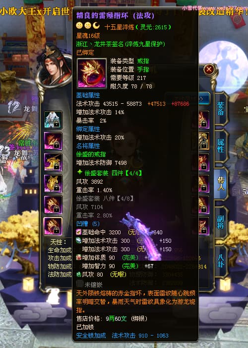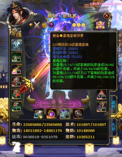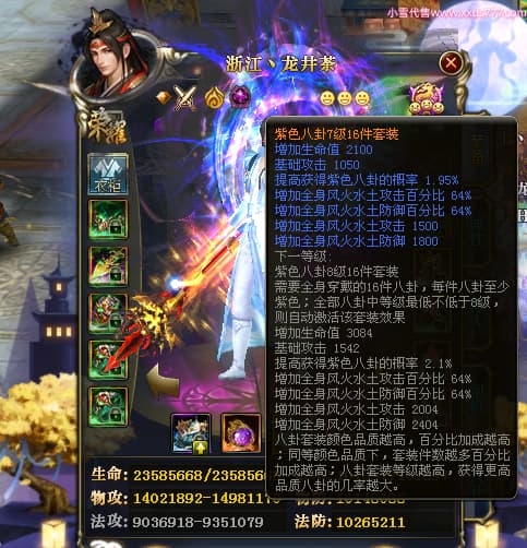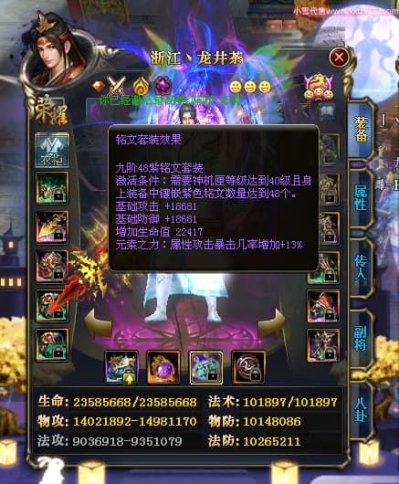 编号W23358 浙江丶龙井茶 龙舞九州 青州 世界排名85名 22821W战力 人物黄金普通橙18X(9件混沌) 传人精良紫12X 副将精良紫12X 马普通橙12X 极品紫15披风 人物星魂16级 传人星魂16级 副将星魂6级 马星魂15级 人物铭刻3件18级1件17级4件6级其余15级 点亮2件18星其余16星 马铭刻2件13级其余12级 点亮12星 人物绿龙印 马黄龙印 五六等单双属性神圣完美无暇石头 黄绿孔 已开3次永久18星套