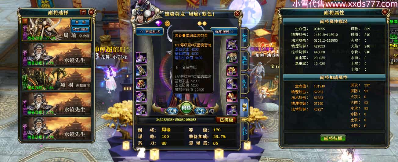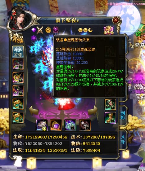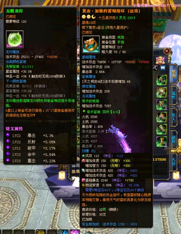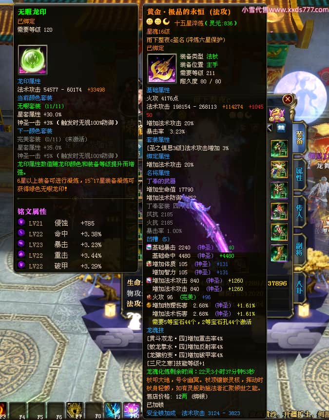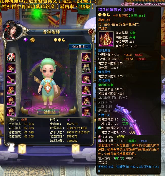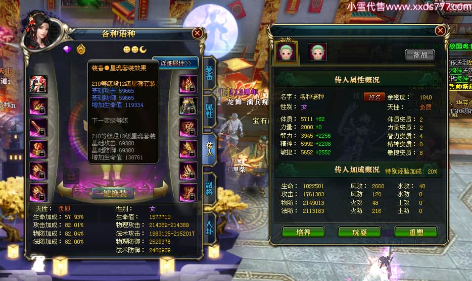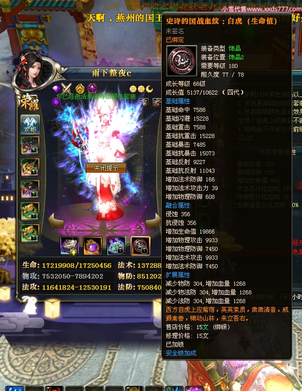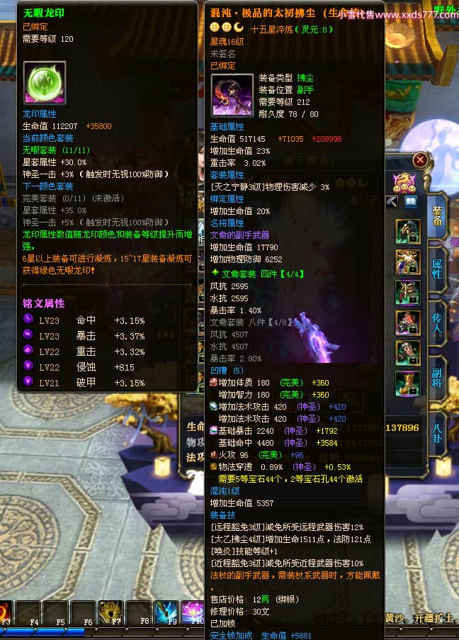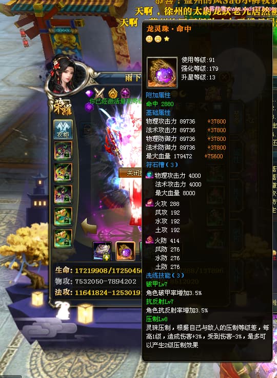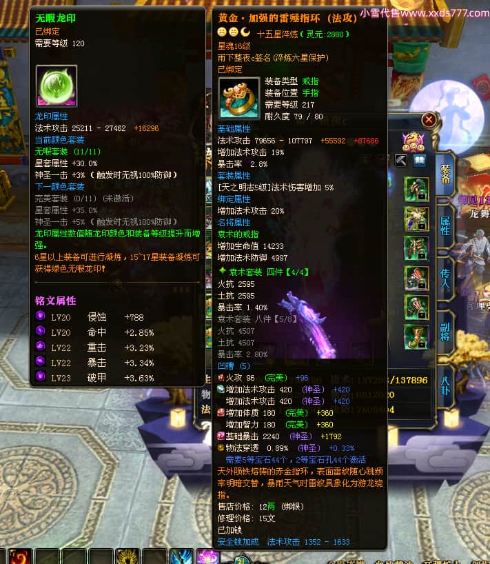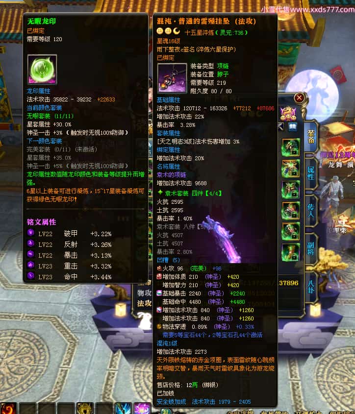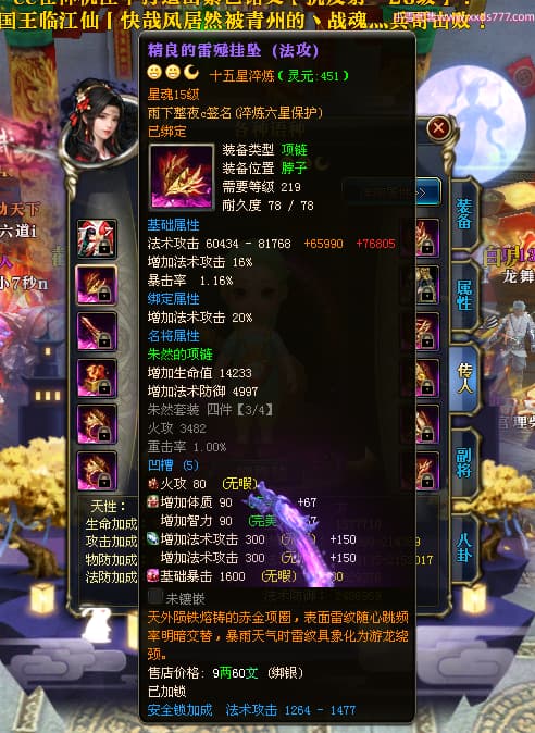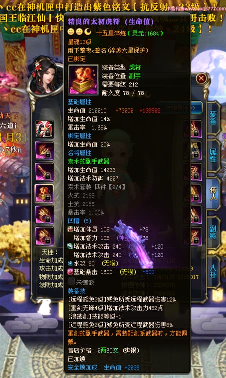 编号W23383 雨下整夜c 龙舞九州 扬州 本国排名20名 17821W战力 人物黄金普通橙15X(6件混沌) 传人精良紫15X 副将精良紫12X 马普通橙12X 极品紫15披风 人物星魂16级 传人星魂12级 副将星魂6级 马星魂13级 人物铭刻15级 人物点亮7件16星其余14星 马铭刻13级 点亮12星 人物绿龙印 马黄龙印 五六等单双属性完美无暇神圣石头 蓝黄孔 世界花榜第五