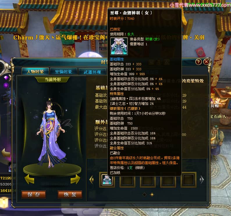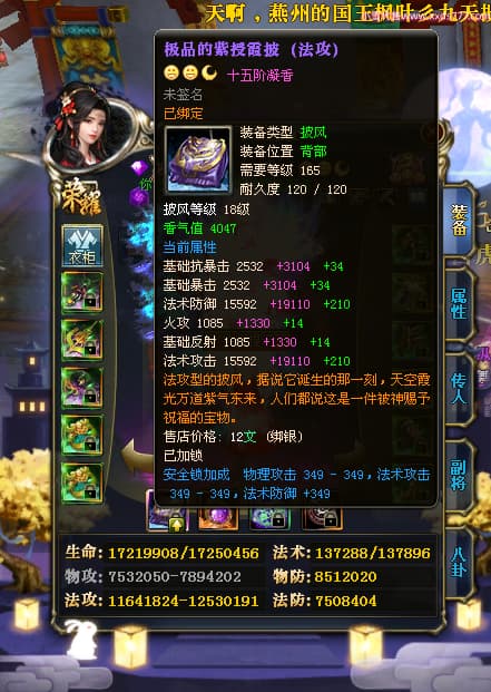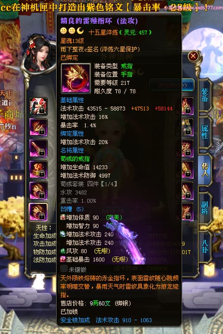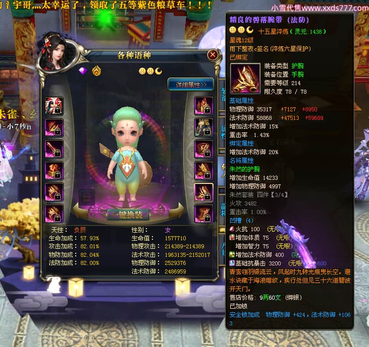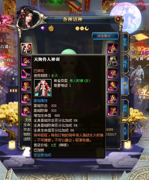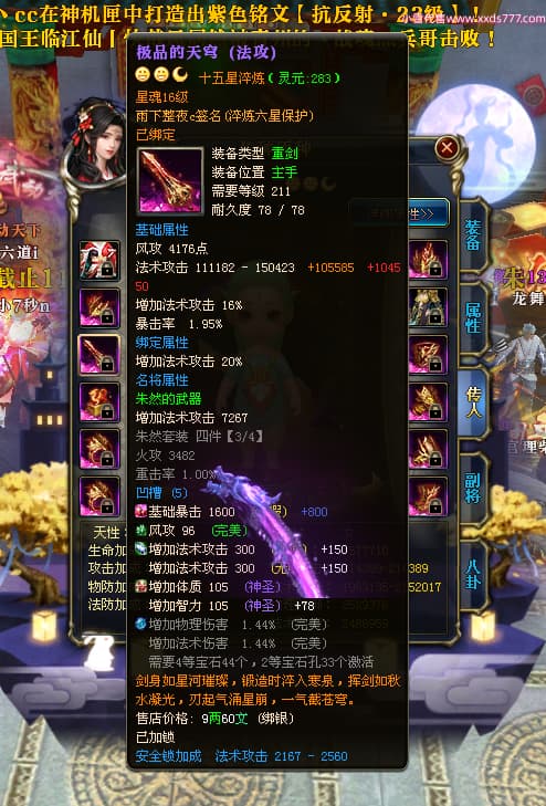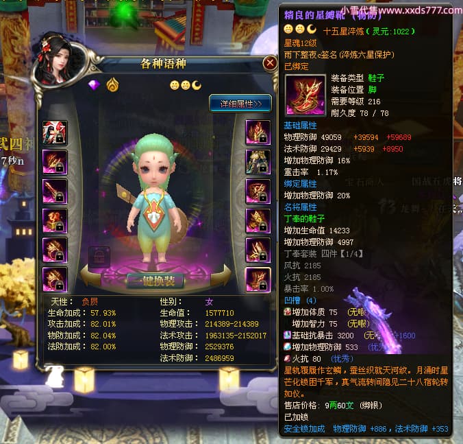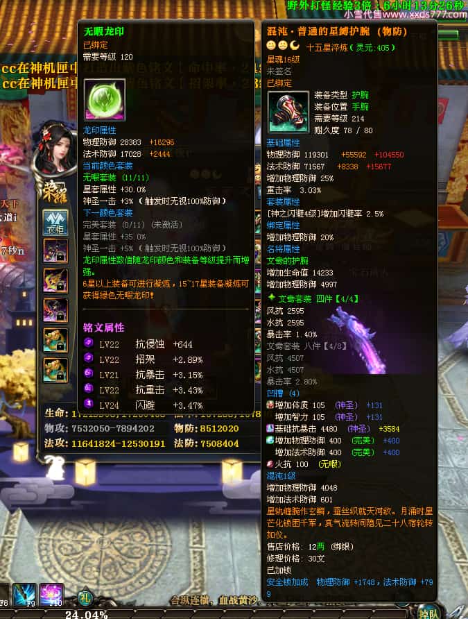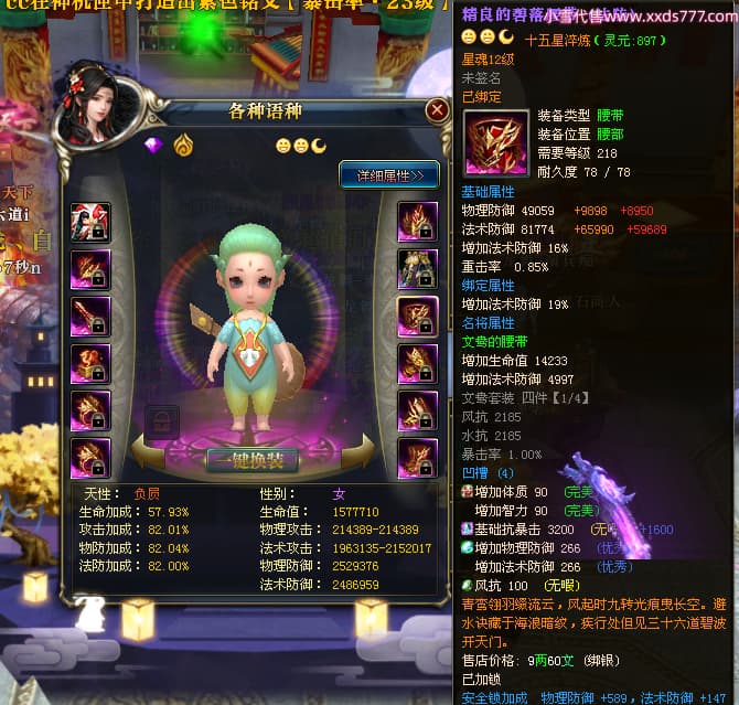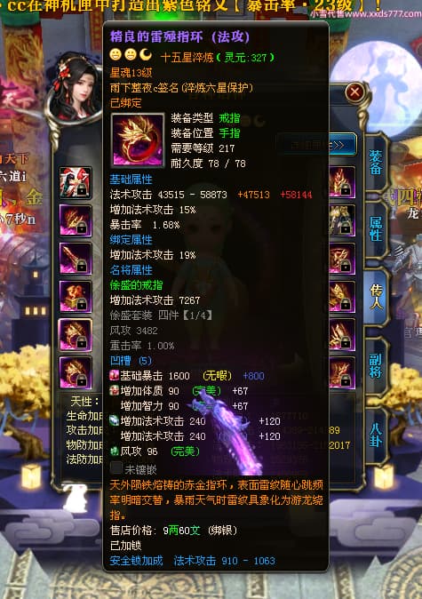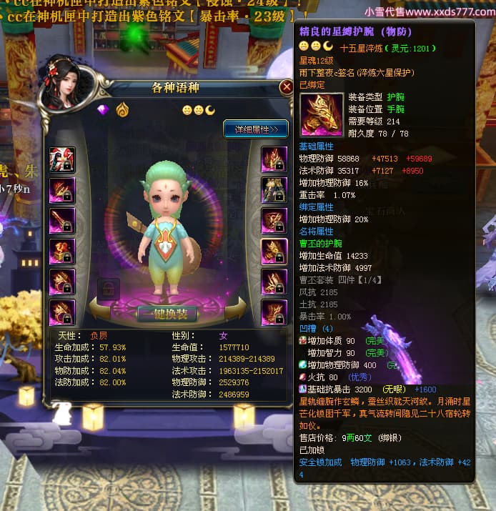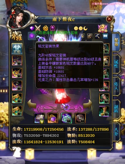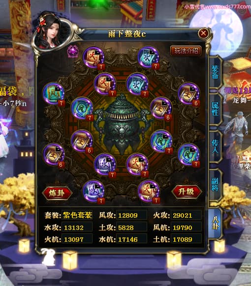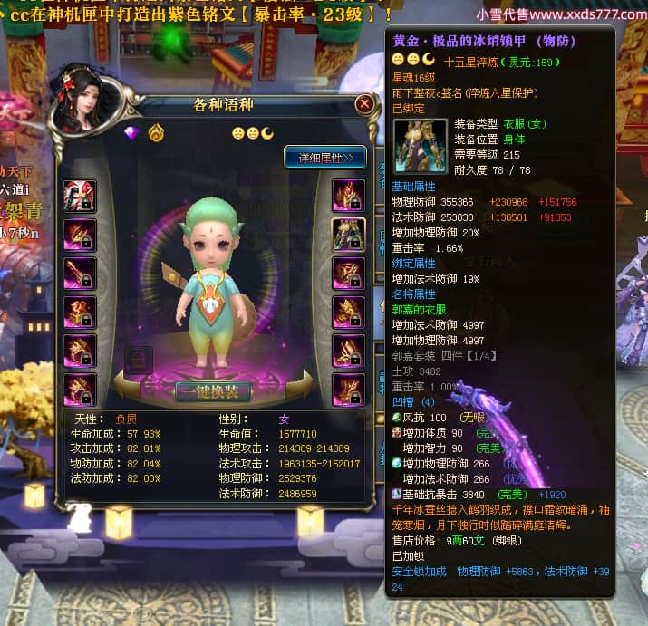 编号W23383 雨下整夜c 龙舞九州 扬州 本国排名20名 17821W战力 人物黄金普通橙15X(6件混沌) 传人精良紫15X 副将精良紫12X 马普通橙12X 极品紫15披风 人物星魂16级 传人星魂12级 副将星魂6级 马星魂13级 人物铭刻15级 人物点亮7件16星其余14星 马铭刻13级 点亮12星 人物绿龙印 马黄龙印 五六等单双属性完美无暇神圣石头 蓝黄孔 世界花榜第五