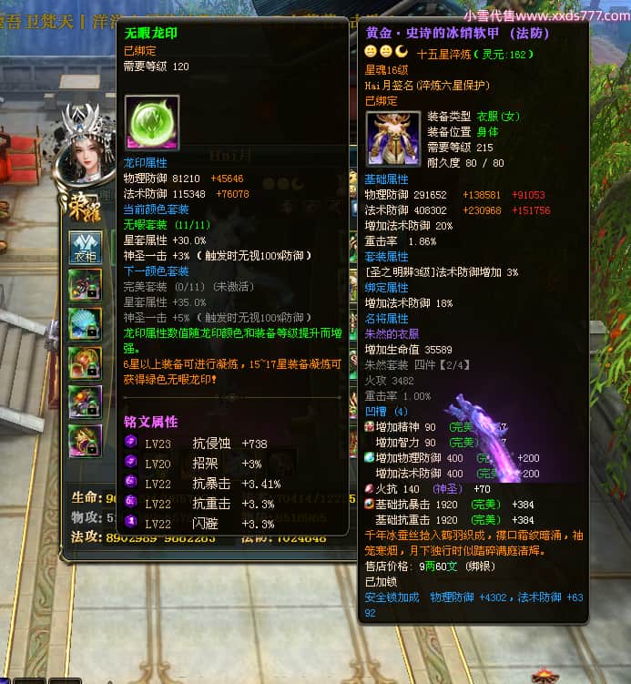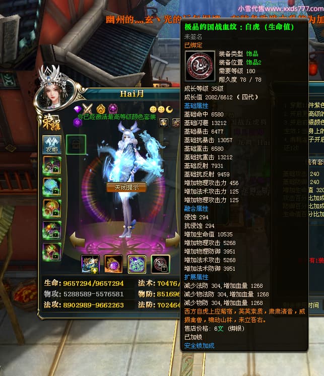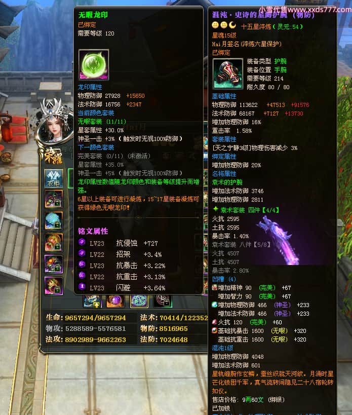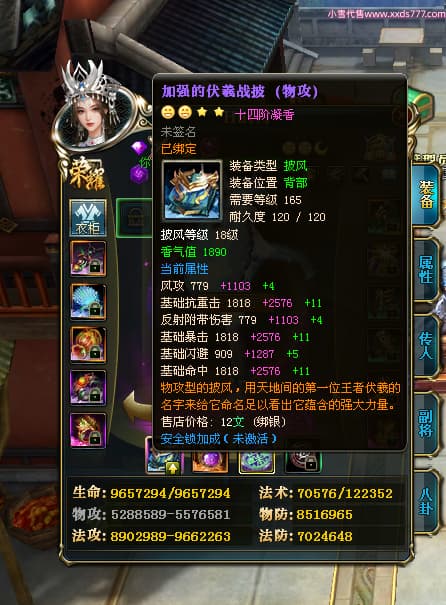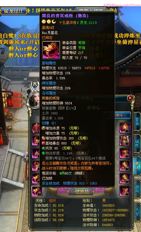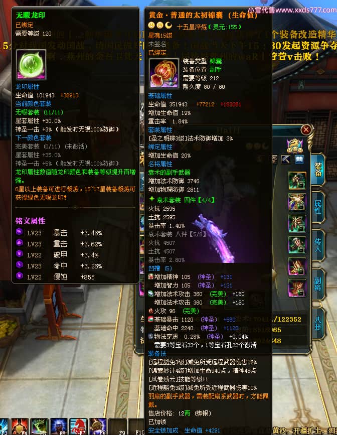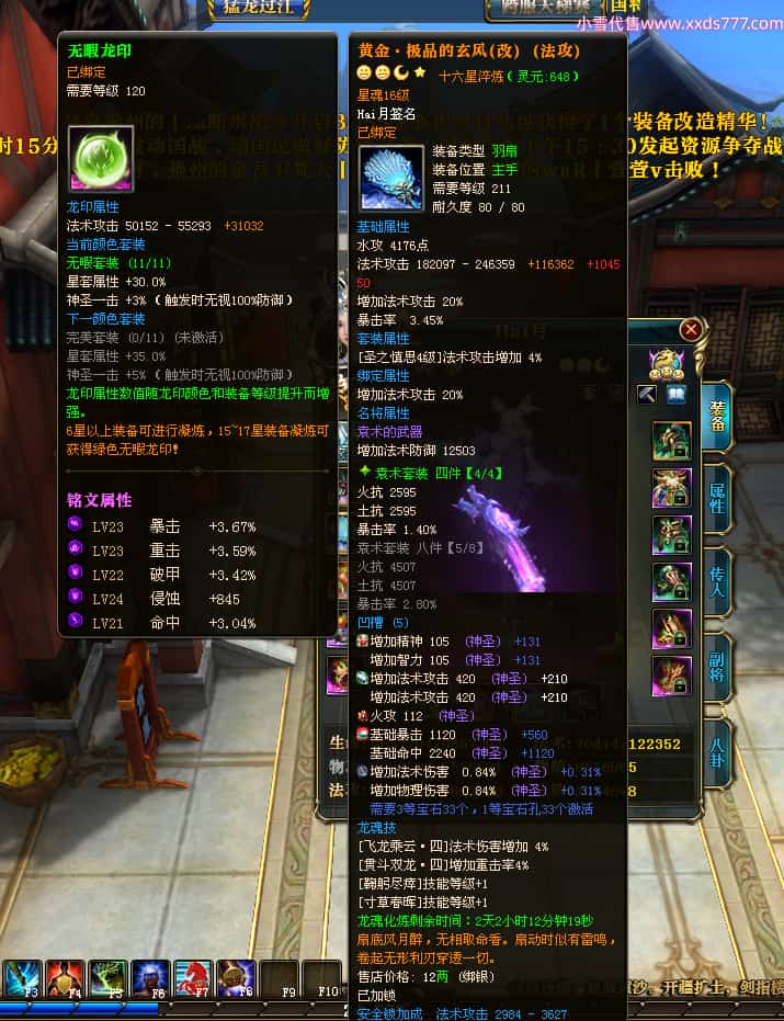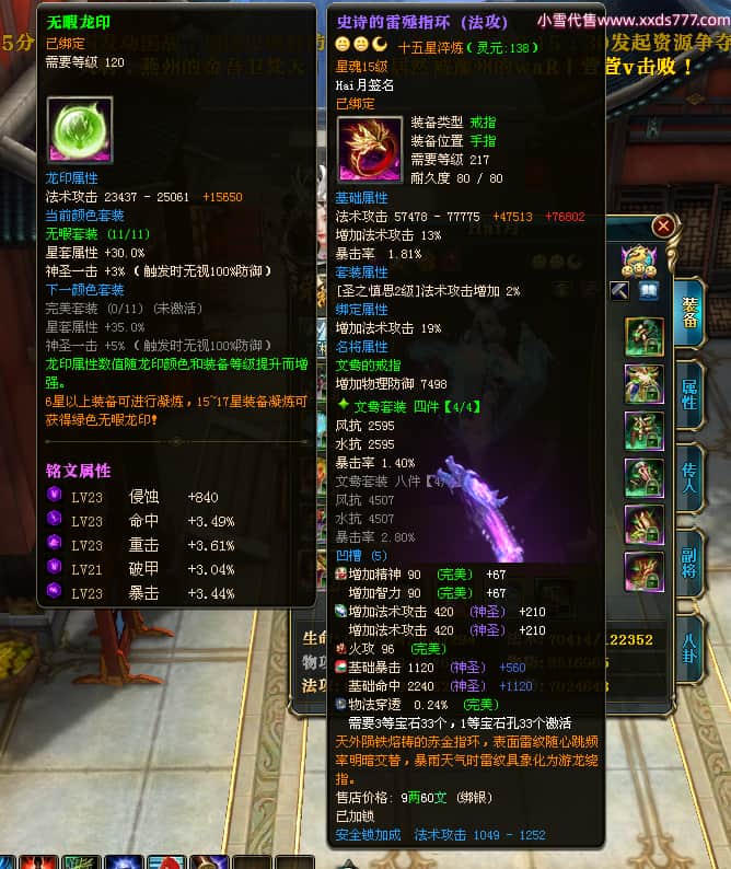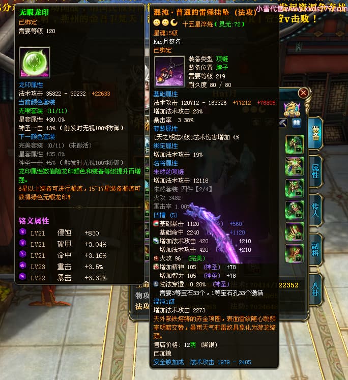 编号W23407 Hai月 龙舞九州 徐州 本国排名第33名 13033W战力 人物史诗紫15X(5件混沌) 传人精良紫15X 副将精良紫12X 马史诗紫10X 加强紫14披风 人物星魂15级 传人6级 副将6级 马星魂8级 人物铭刻15级 差一件戒指点亮16星 马铭刻14级 点亮10星 人物绿龙印 马黄龙印 五等单双属性神圣完美无瑕石头 蓝白孔 神魔装备12星套(2件14星,2件13星)