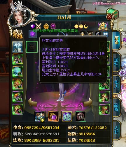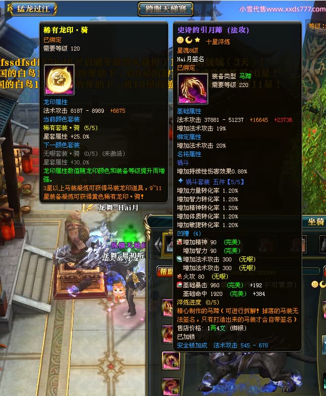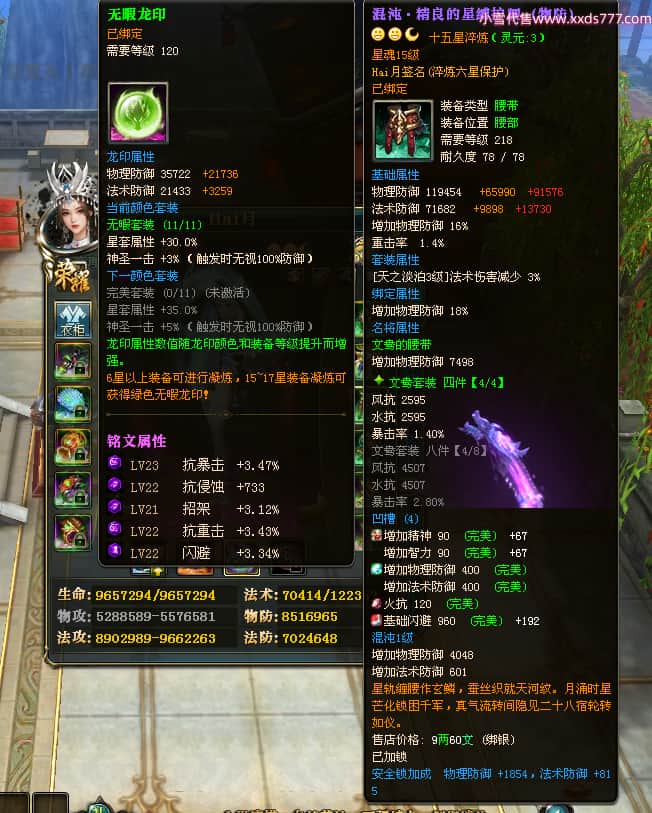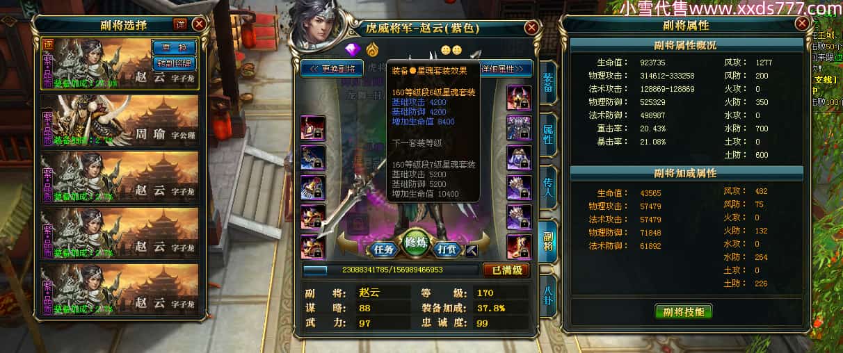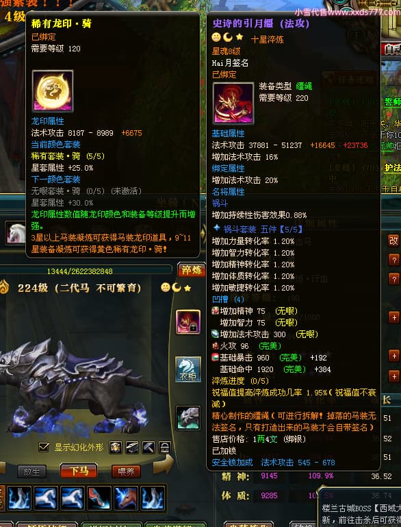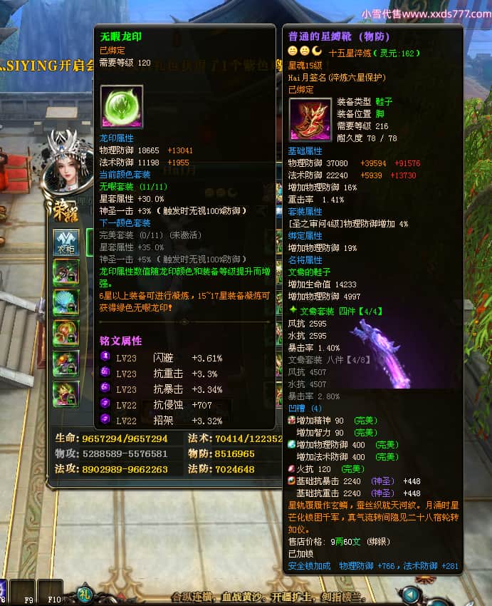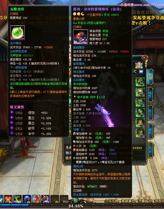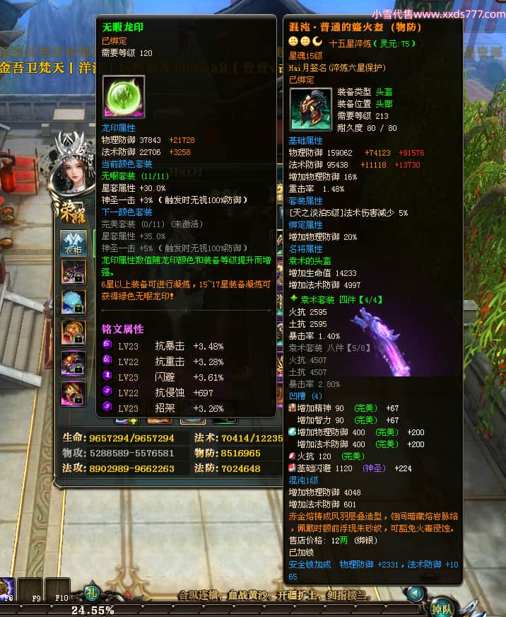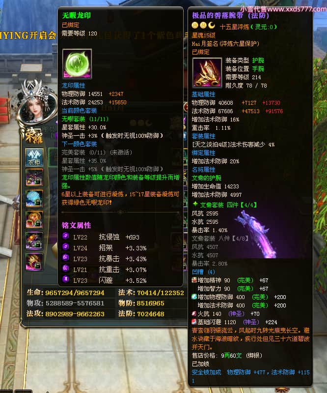 编号W23407 Hai月 龙舞九州 徐州 本国排名第33名 13033W战力 人物史诗紫15X(5件混沌) 传人精良紫15X 副将精良紫12X 马史诗紫10X 加强紫14披风 人物星魂15级 传人6级 副将6级 马星魂8级 人物铭刻15级 差一件戒指点亮16星 马铭刻14级 点亮10星 人物绿龙印 马黄龙印 五等单双属性神圣完美无瑕石头 蓝白孔 神魔装备12星套(2件14星,2件13星)