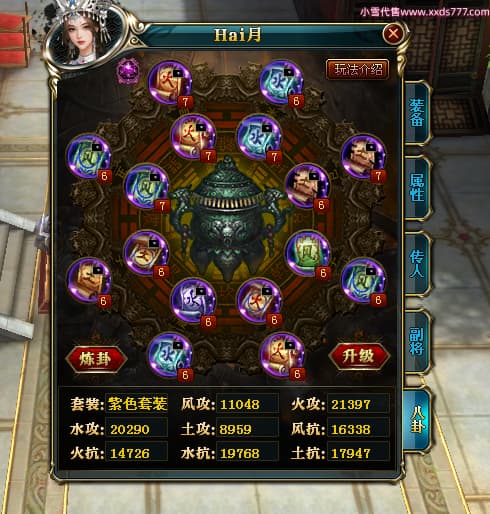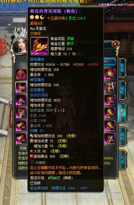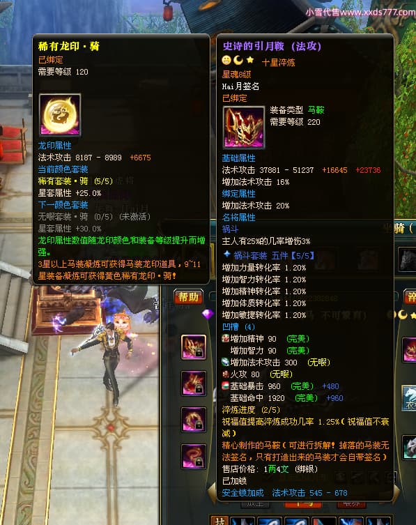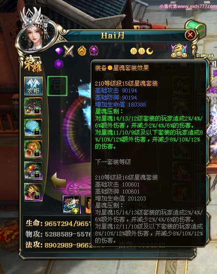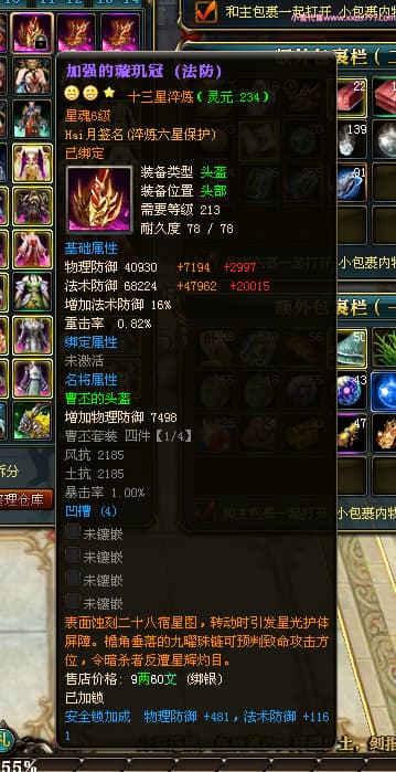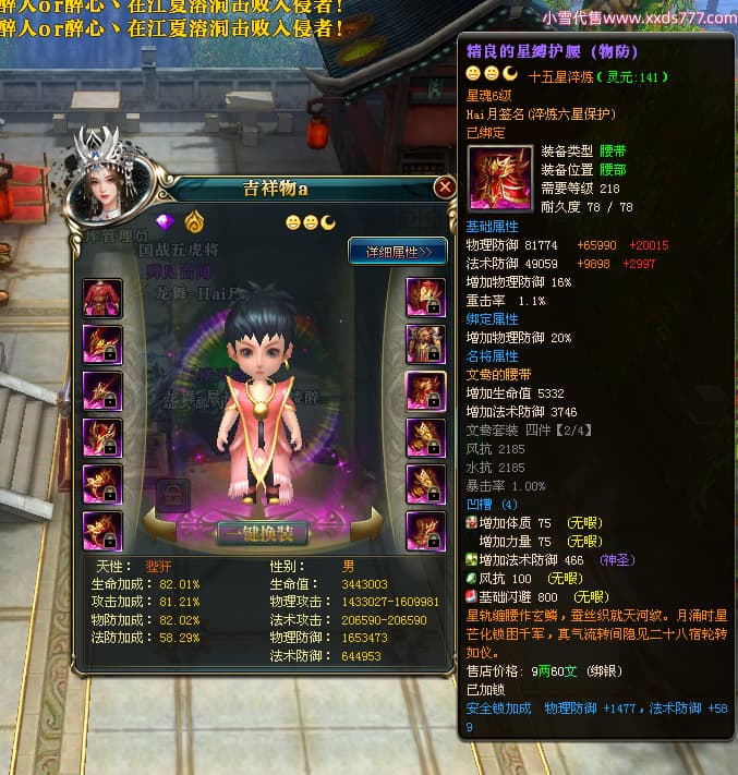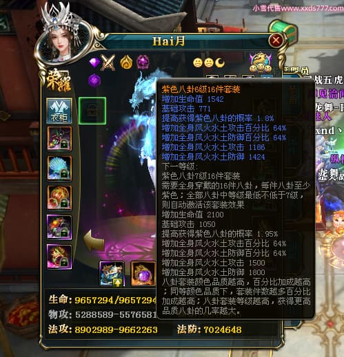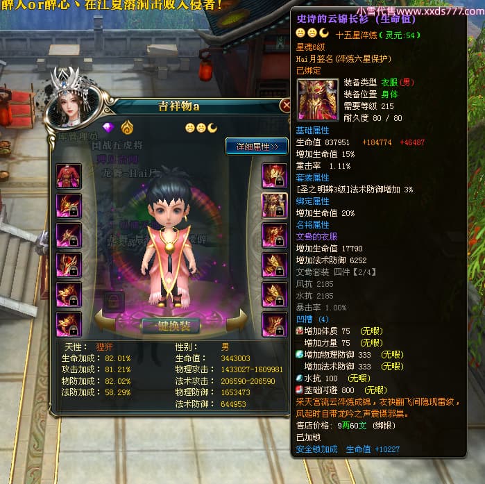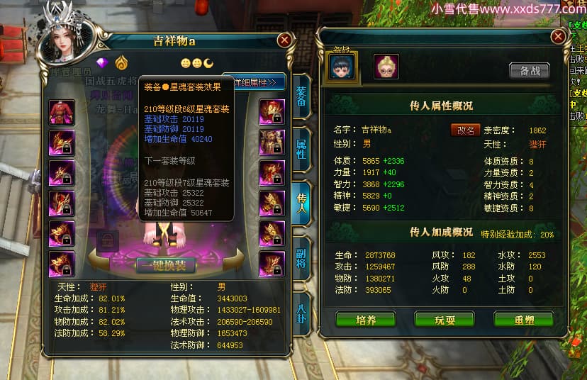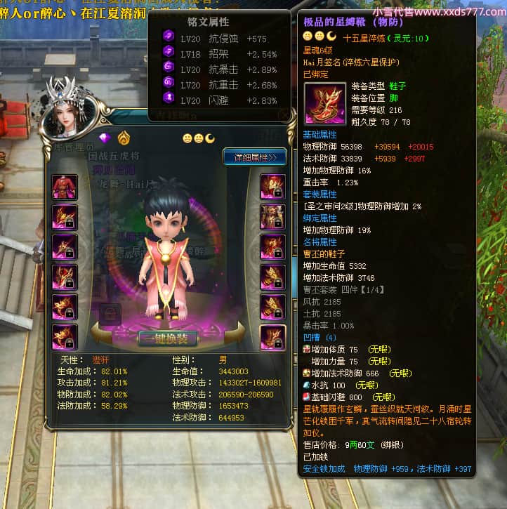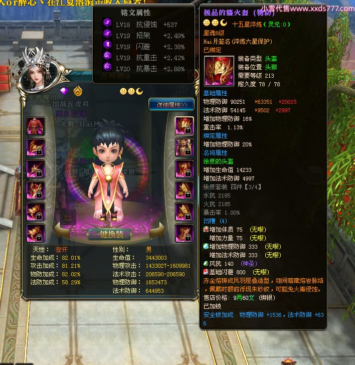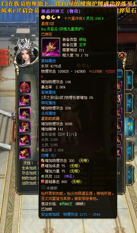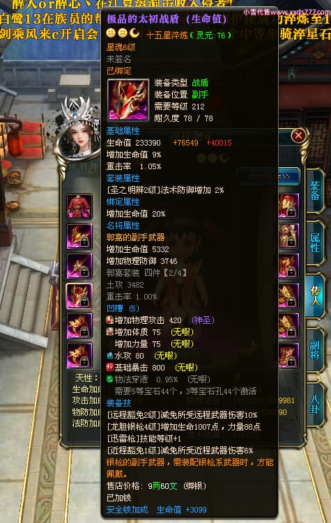 编号W23407 Hai月 龙舞九州 徐州 本国排名第33名 13033W战力 人物史诗紫15X(5件混沌) 传人精良紫15X 副将精良紫12X 马史诗紫10X 加强紫14披风 人物星魂15级 传人6级 副将6级 马星魂8级 人物铭刻15级 差一件戒指点亮16星 马铭刻14级 点亮10星 人物绿龙印 马黄龙印 五等单双属性神圣完美无瑕石头 蓝白孔 神魔装备12星套(2件14星,2件13星)