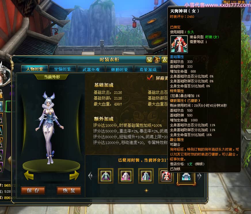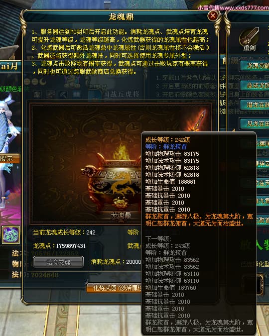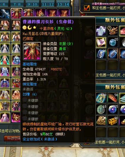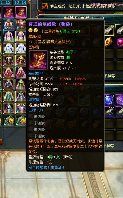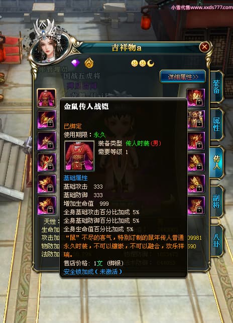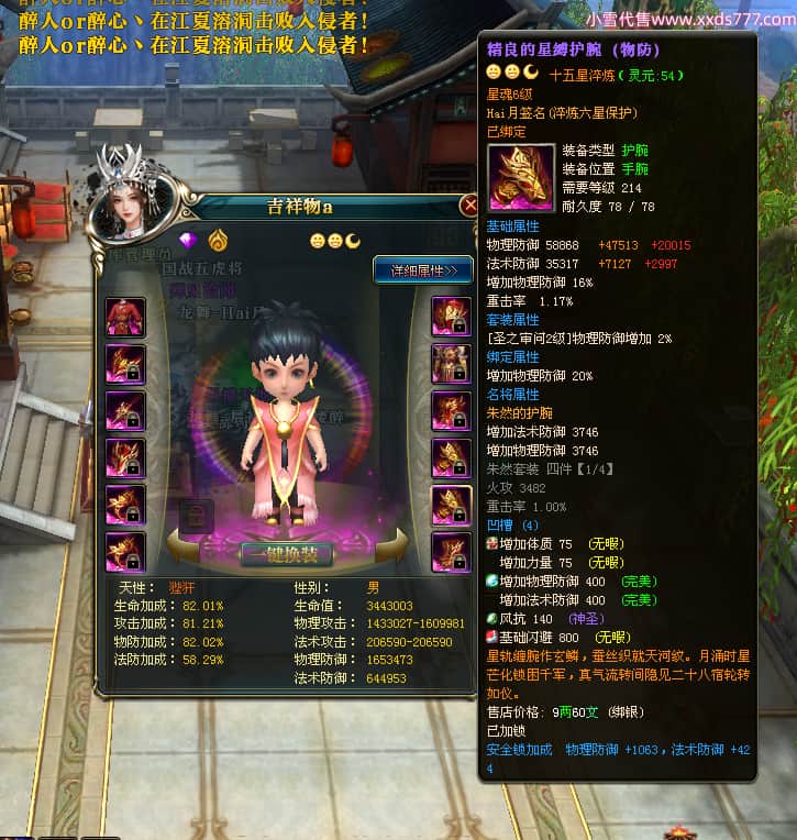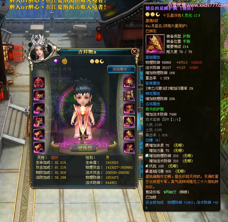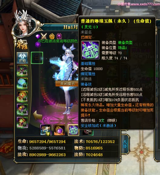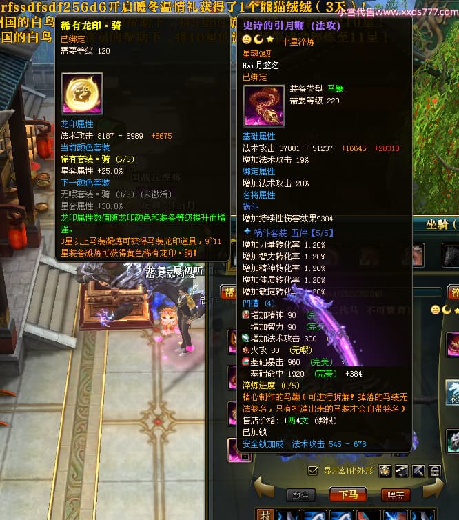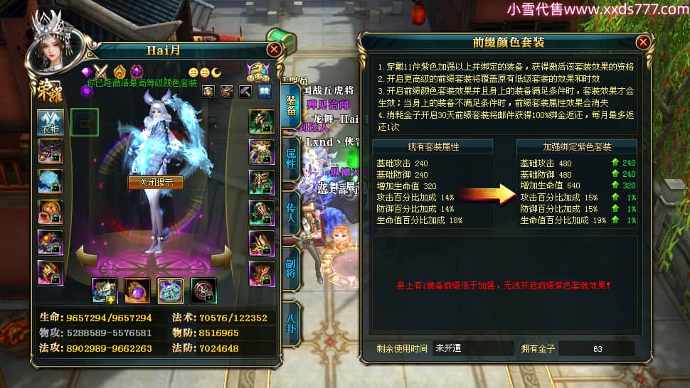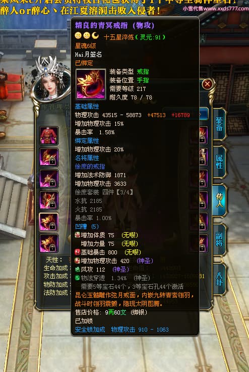 编号W23407 Hai月 龙舞九州 徐州 本国排名第33名 13033W战力 人物史诗紫15X(5件混沌) 传人精良紫15X 副将精良紫12X 马史诗紫10X 加强紫14披风 人物星魂15级 传人6级 副将6级 马星魂8级 人物铭刻15级 差一件戒指点亮16星 马铭刻14级 点亮10星 人物绿龙印 马黄龙印 五等单双属性神圣完美无瑕石头 蓝白孔 神魔装备12星套(2件14星,2件13星)