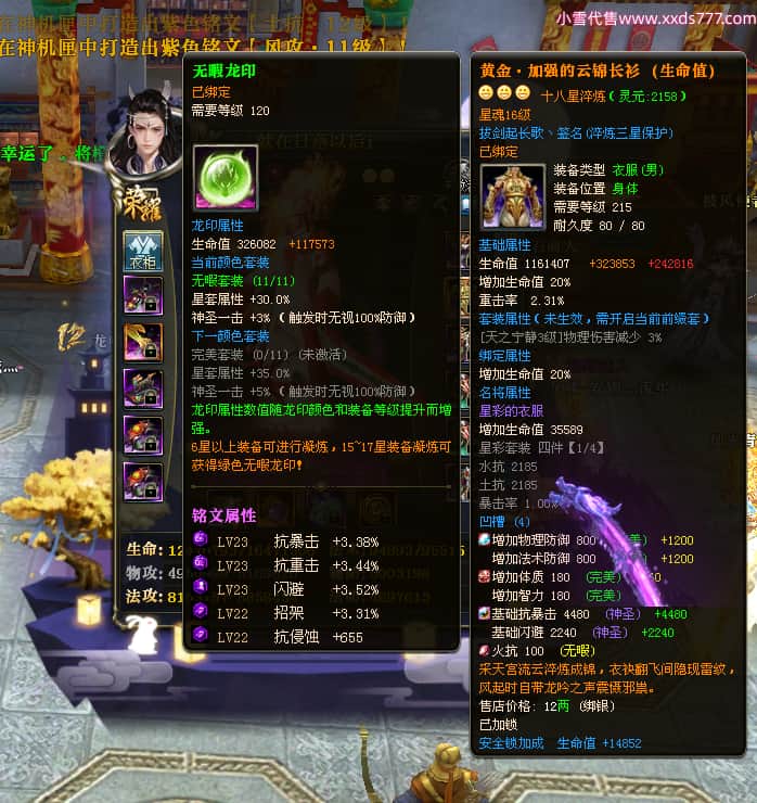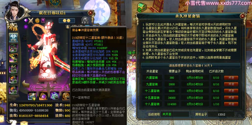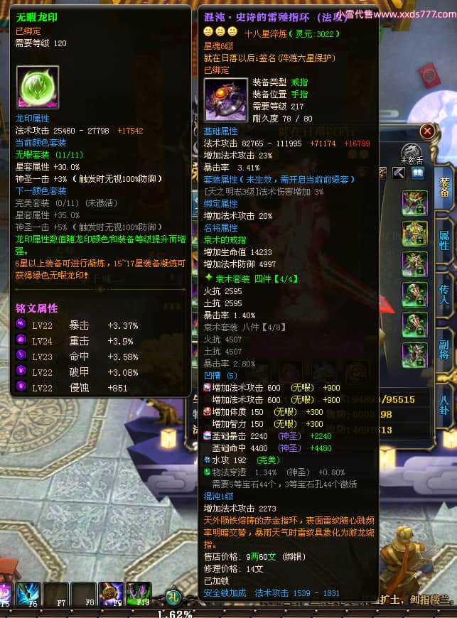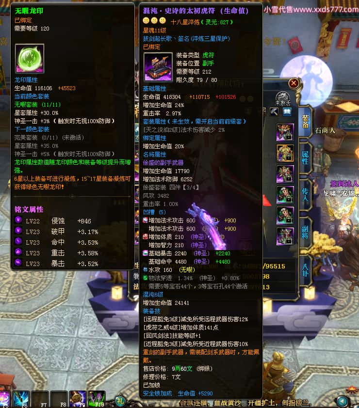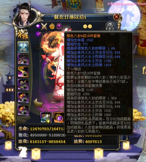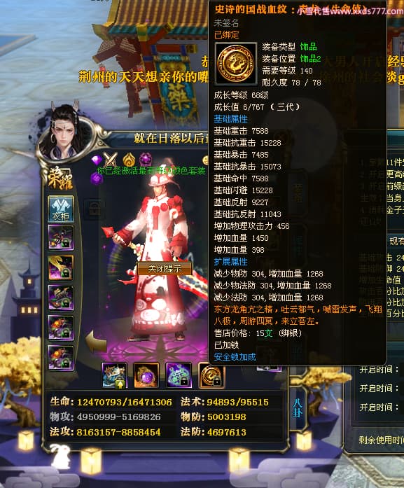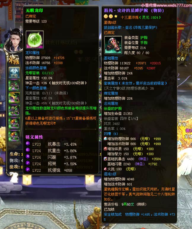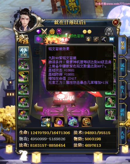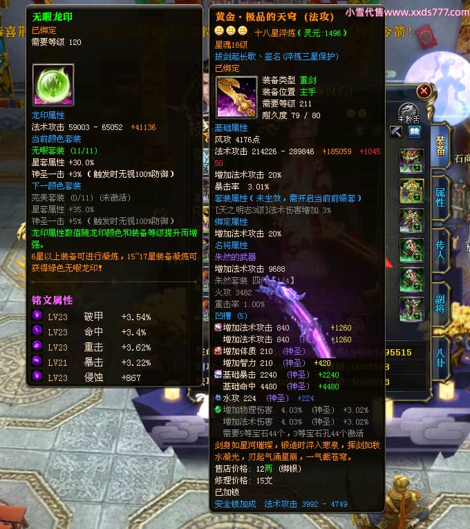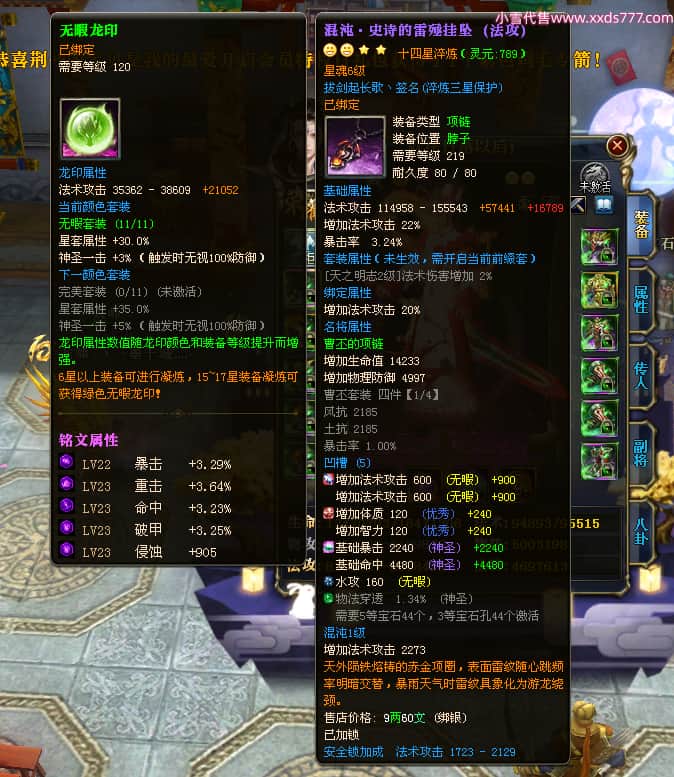 编号X23431 就在日落以后i 龙啸风云 江州 本国排名46名 13272W战力 人物黄金史诗紫12X(4件18X3件15X9件混沌) 传人精良紫12X(5件18X) 马史诗紫12X 精良紫14披风 人物星魂6级 传人星魂6级 马星魂8级 人物铭刻3件18级1件16级其余15级 人物点亮3件18星4件16星其余14星 马铭刻12级 点亮12星 人物绿龙印 马黄龙印 六等单双属性神圣完美无瑕石头 黄绿孔 已开1次永久18星套 号上15件18