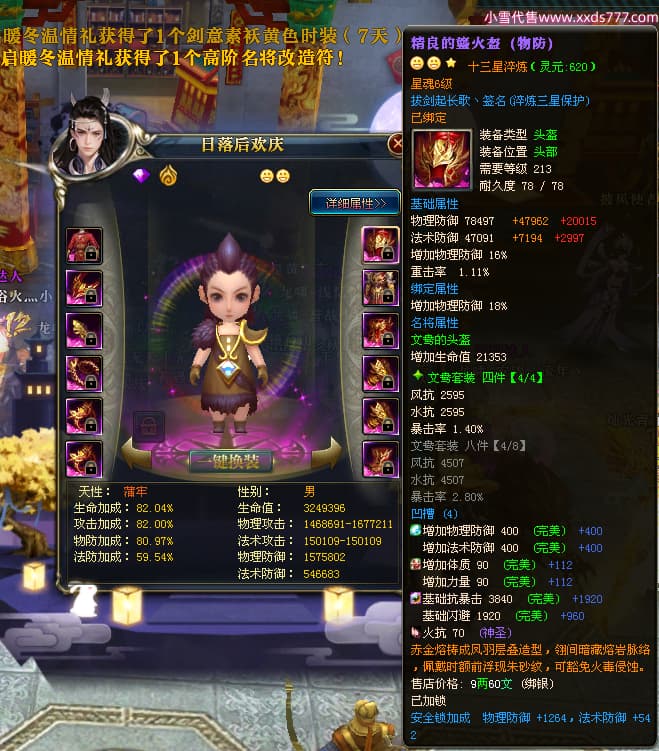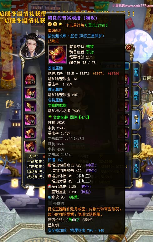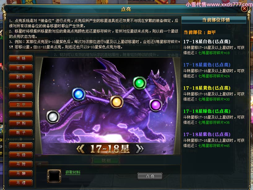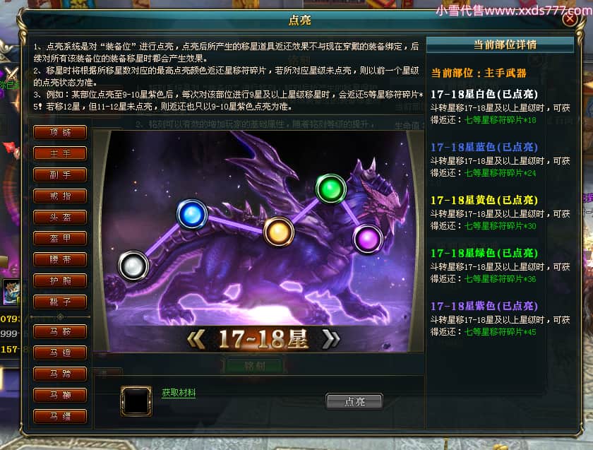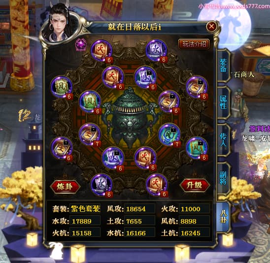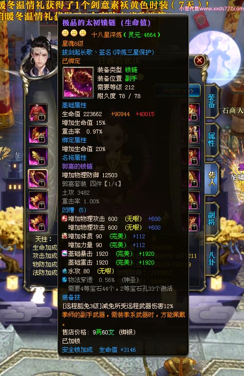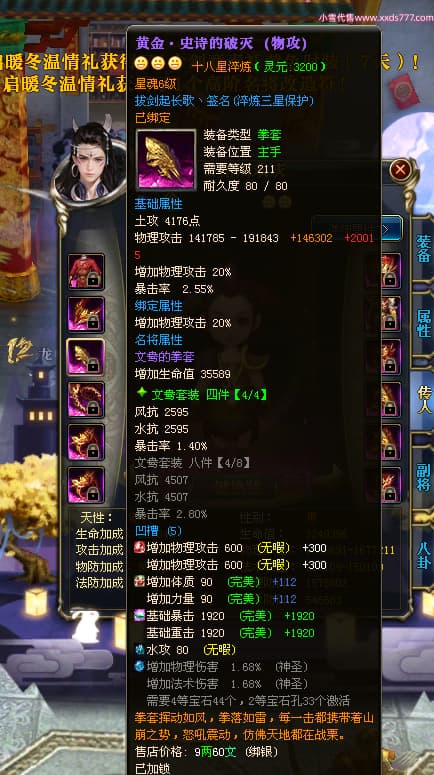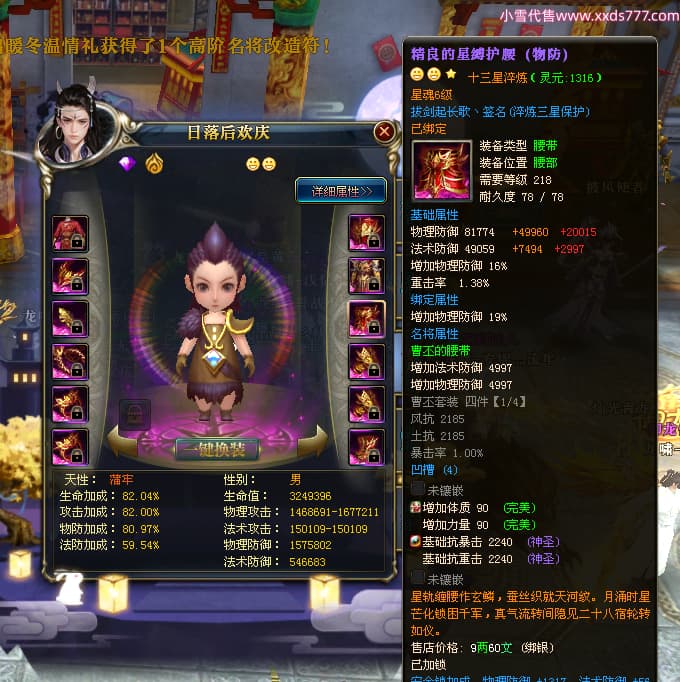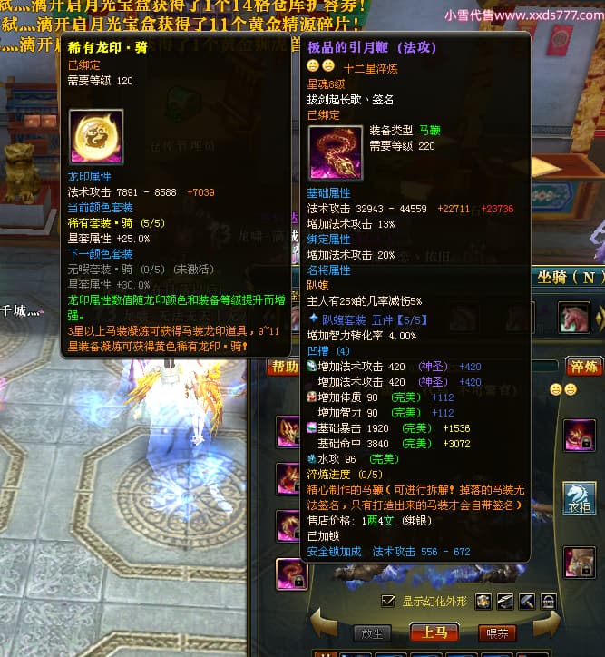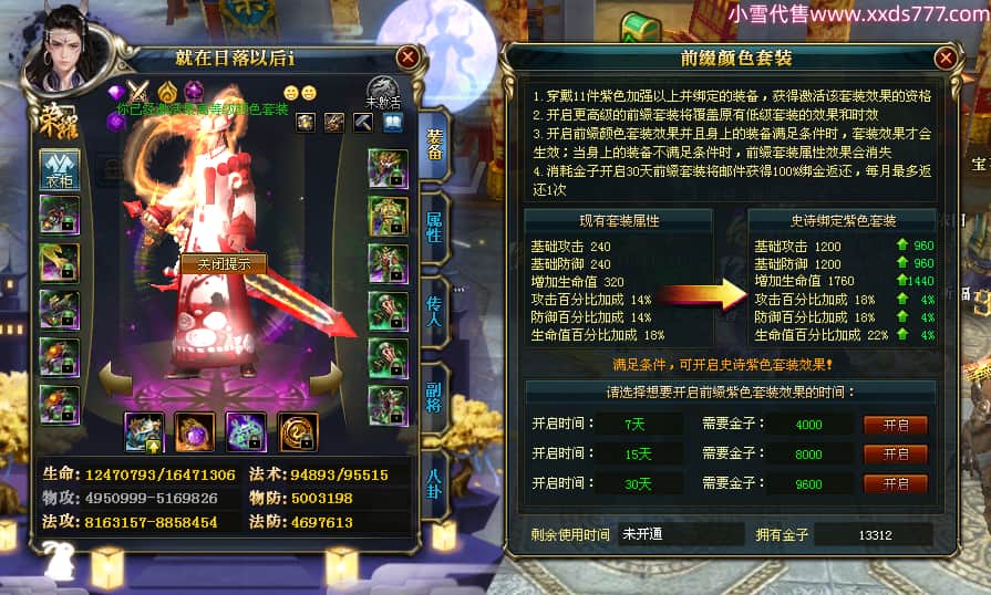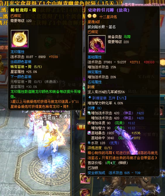 编号X23431 就在日落以后i 龙啸风云 江州 本国排名46名 13272W战力 人物黄金史诗紫12X(4件18X3件15X9件混沌) 传人精良紫12X(5件18X) 马史诗紫12X 精良紫14披风 人物星魂6级 传人星魂6级 马星魂8级 人物铭刻3件18级1件16级其余15级 人物点亮3件18星4件16星其余14星 马铭刻12级 点亮12星 人物绿龙印 马黄龙印 六等单双属性神圣完美无瑕石头 黄绿孔 已开1次永久18星套 号上15件18