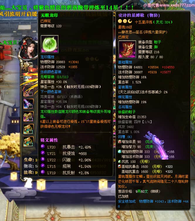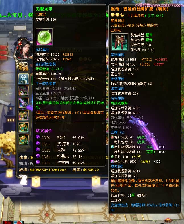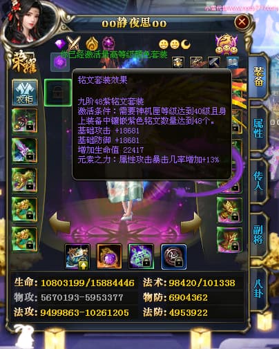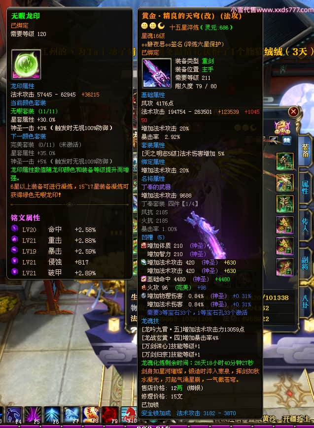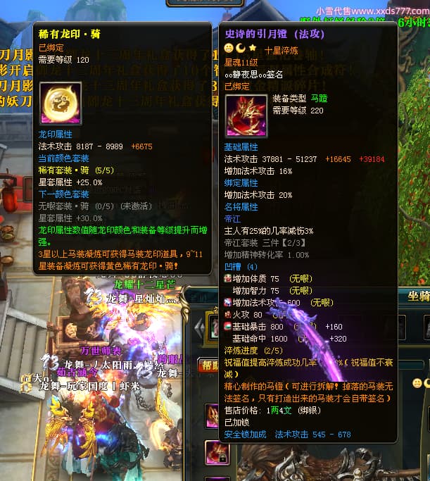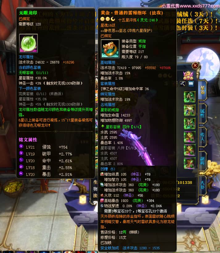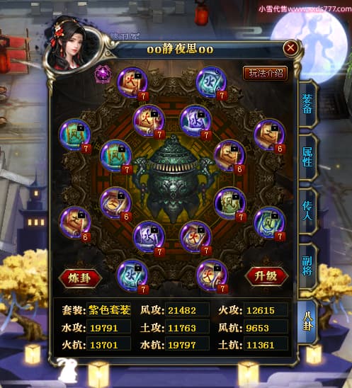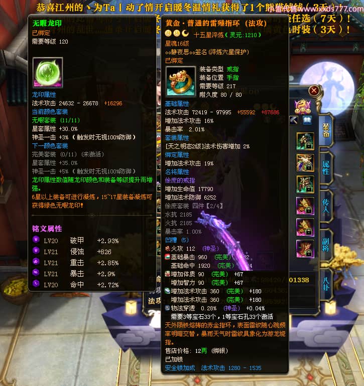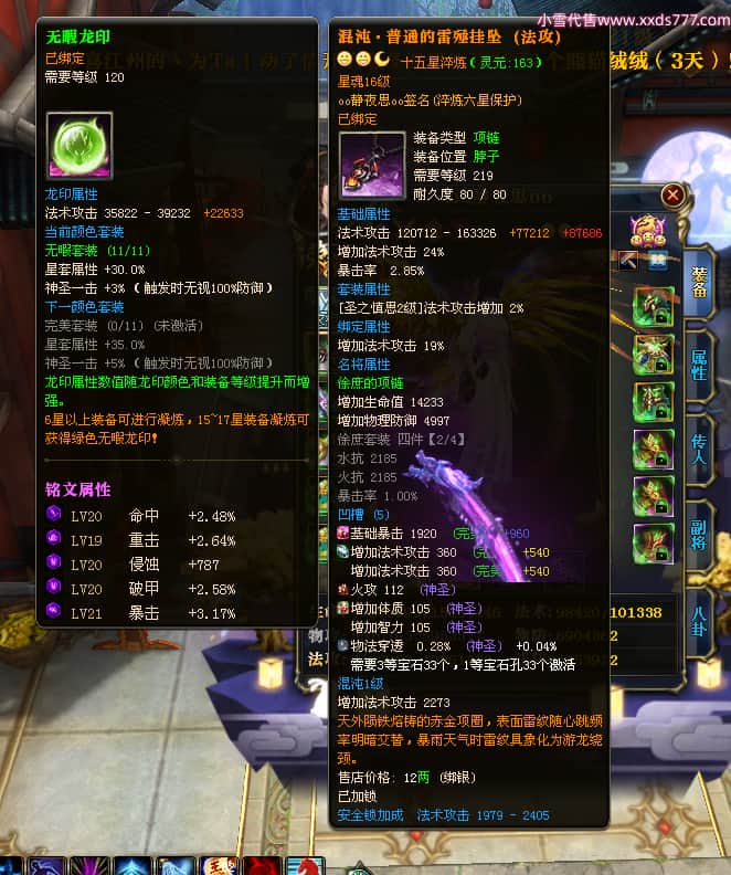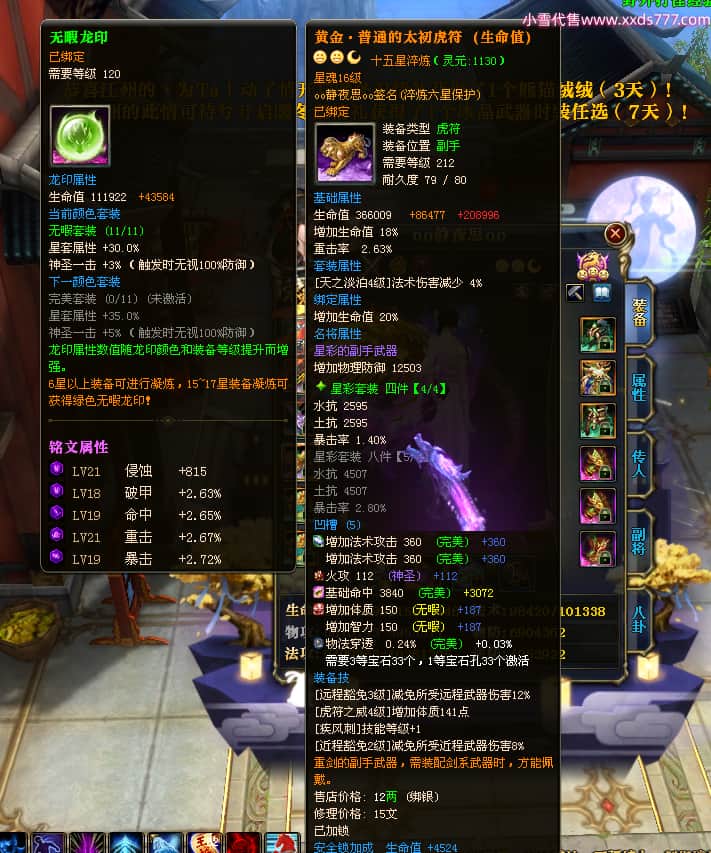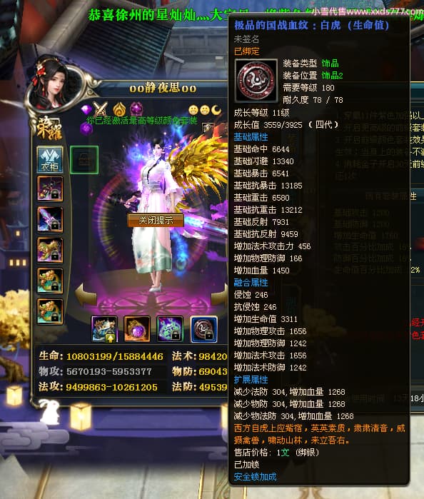 编号W23549 oo静夜思oo 龙舞九州 徐州 本国排名27名 13493W战力 人物史诗紫15X(3件混沌) 传人精良紫14X(5件15X) 副将精良紫12X 马史诗紫10X 精良紫14披风 人物星魂16级 传人星魂8级 副将星魂6级 马星魂11级 人物铭刻15级 点亮5件16星其余14星 马铭刻12级 点亮12星 人物绿龙印 马黄龙印 五六等单双属性神圣完美无暇石头 蓝白孔 已开启永久15星套