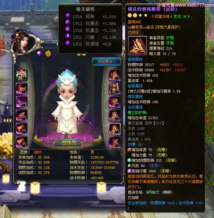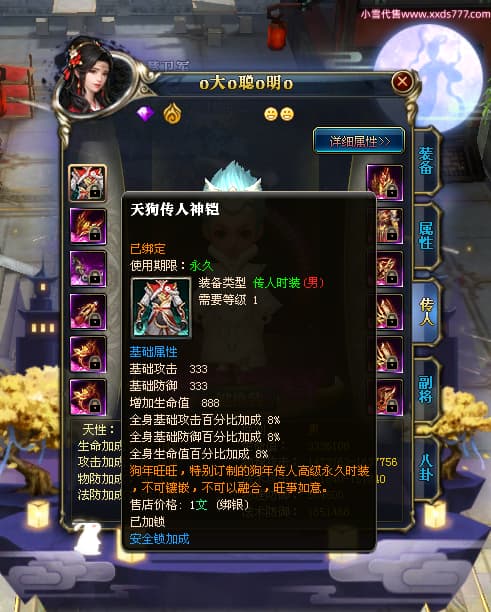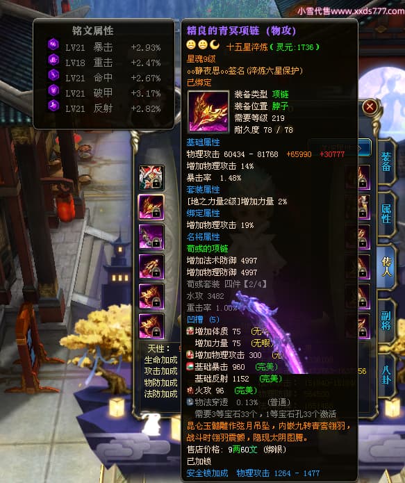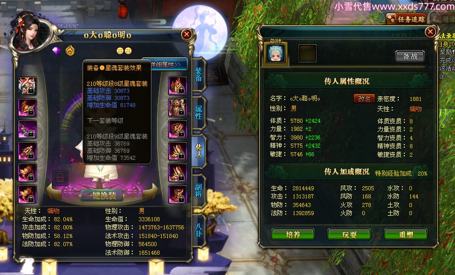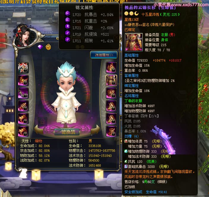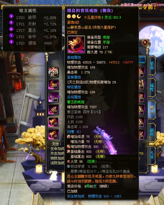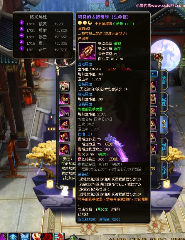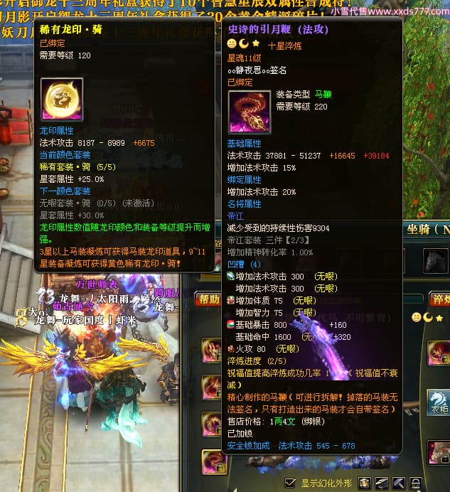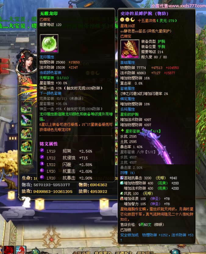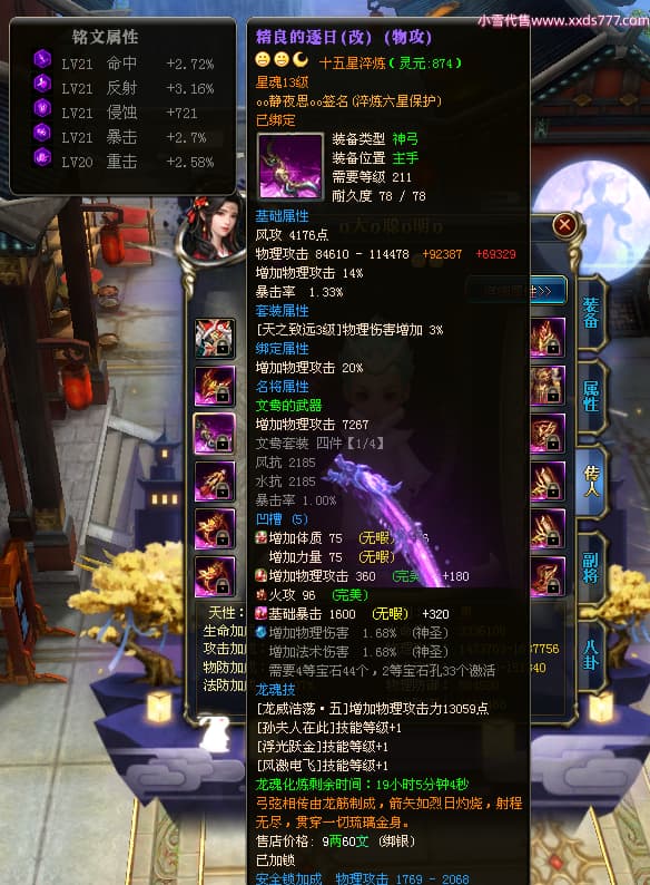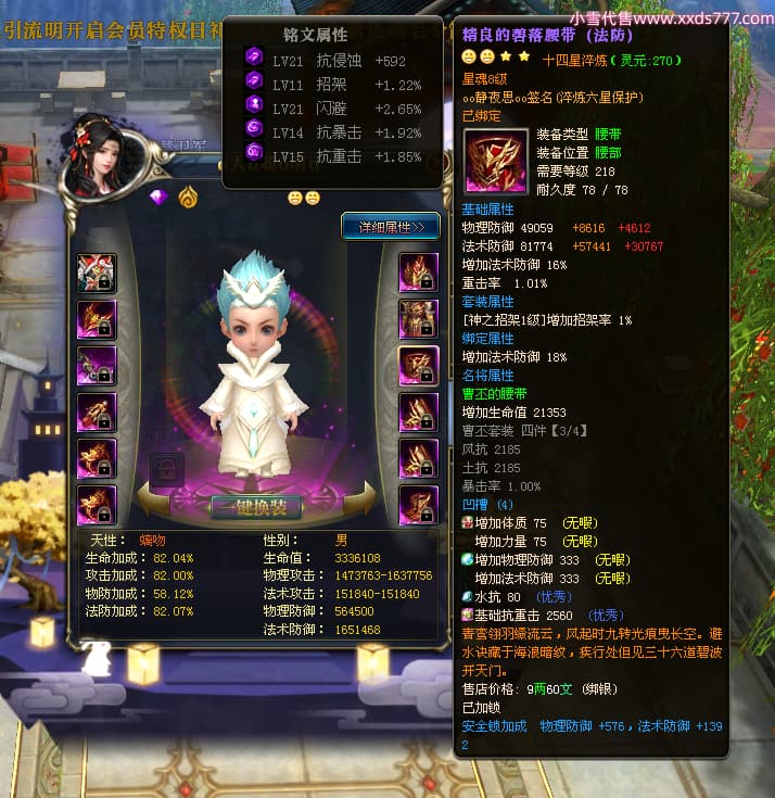 编号W23549 oo静夜思oo 龙舞九州 徐州 本国排名27名 13493W战力 人物史诗紫15X(3件混沌) 传人精良紫14X(5件15X) 副将精良紫12X 马史诗紫10X 精良紫14披风 人物星魂16级 传人星魂8级 副将星魂6级 马星魂11级 人物铭刻15级 点亮5件16星其余14星 马铭刻12级 点亮12星 人物绿龙印 马黄龙印 五六等单双属性神圣完美无暇石头 蓝白孔 已开启永久15星套