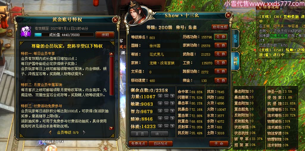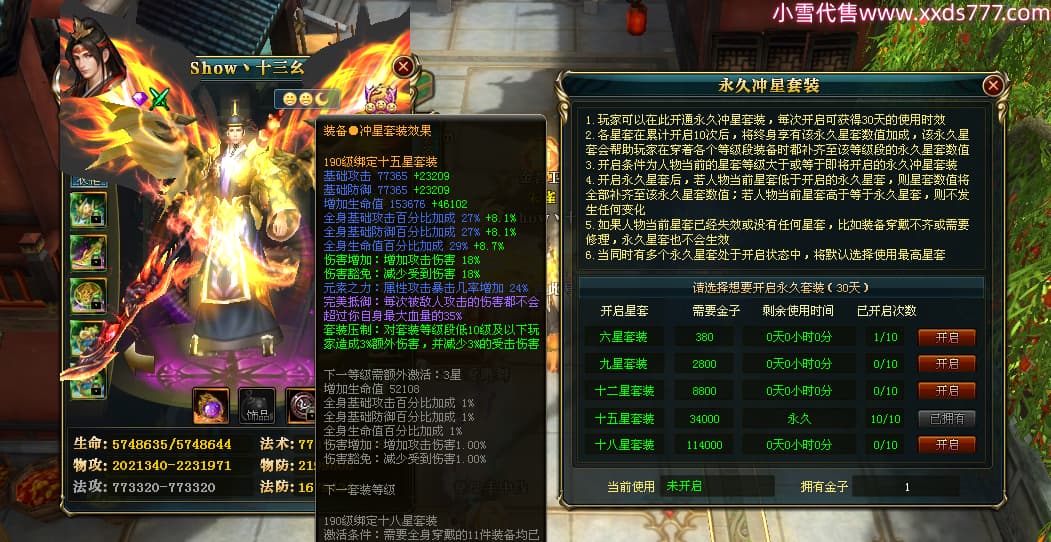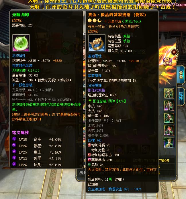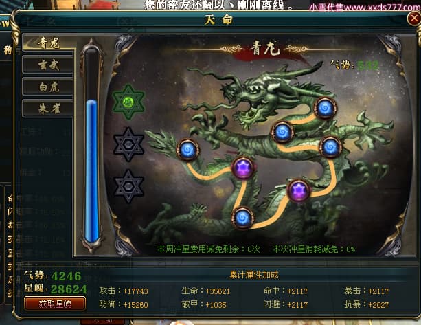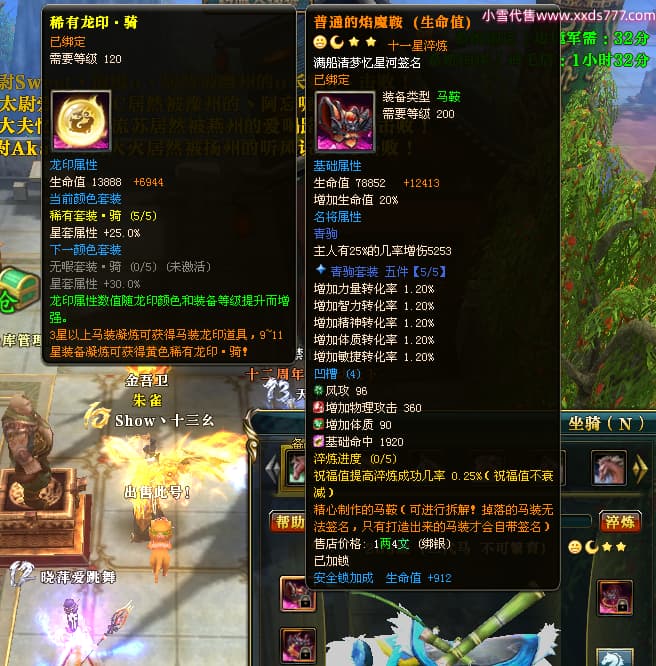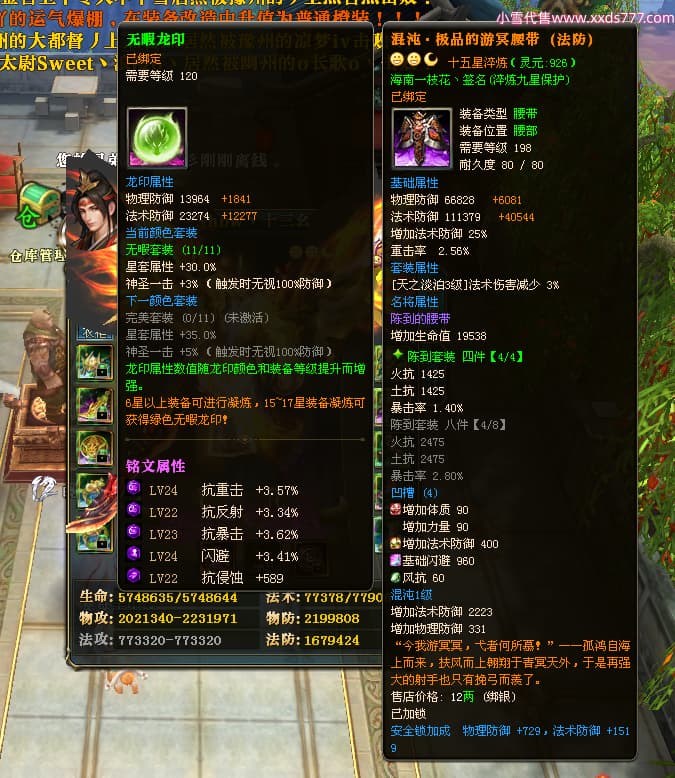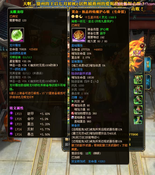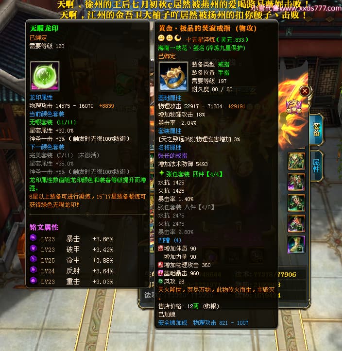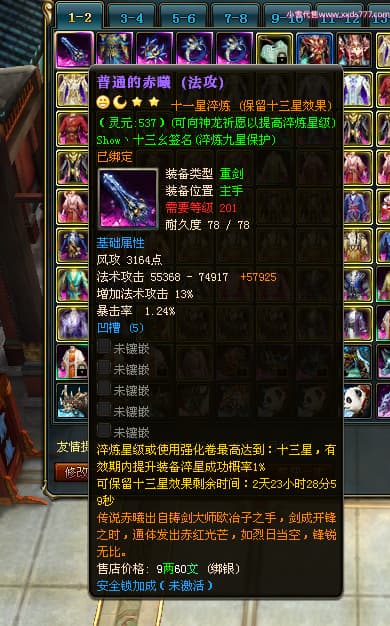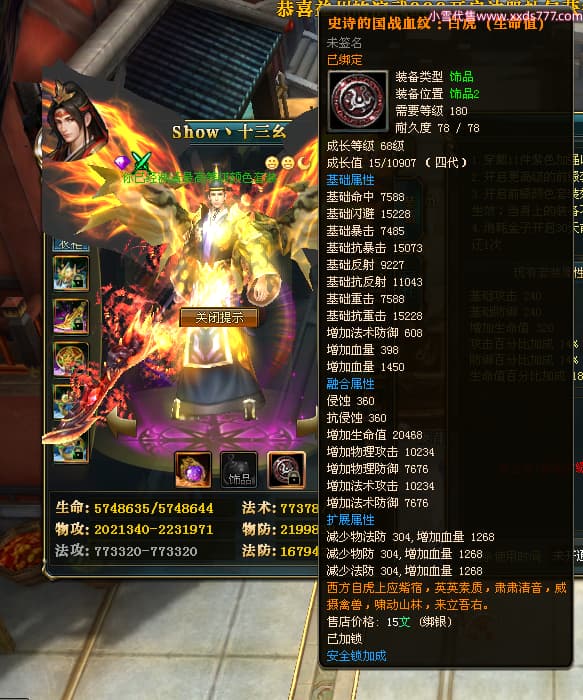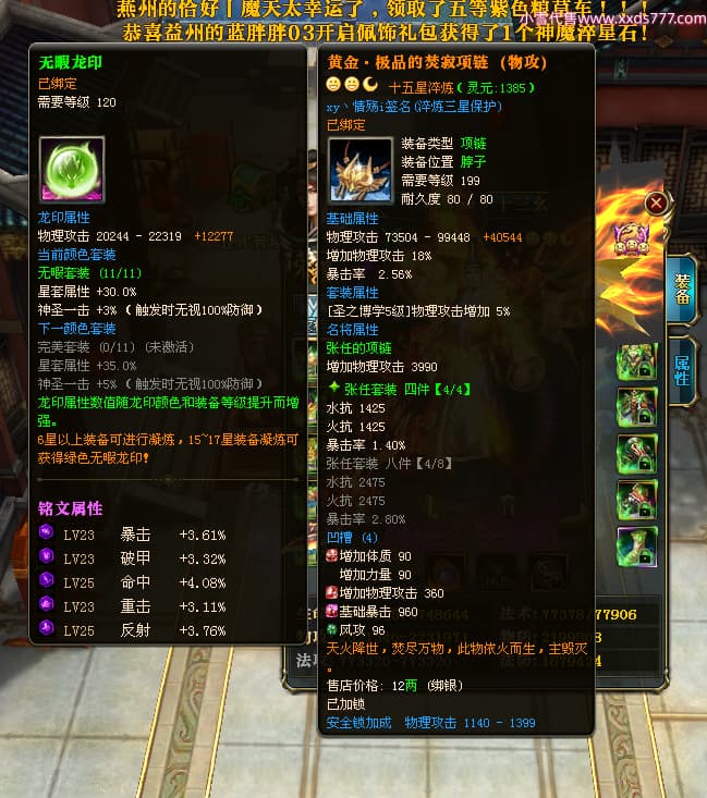 编号L23579 Show丶十三幺 龙战王者 徐州 本国排名14名 4542W战力 人物黄金精良橙15X(4件混沌) 马普通橙11X 人物绿龙印 马黄龙印 六等单双属性石头 已开完永久15星套