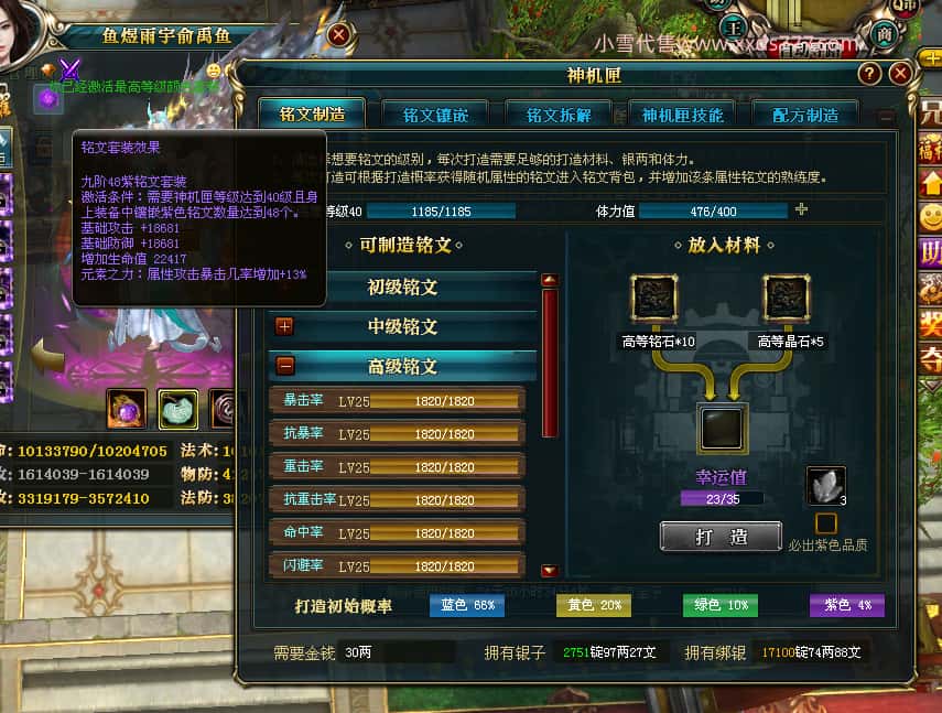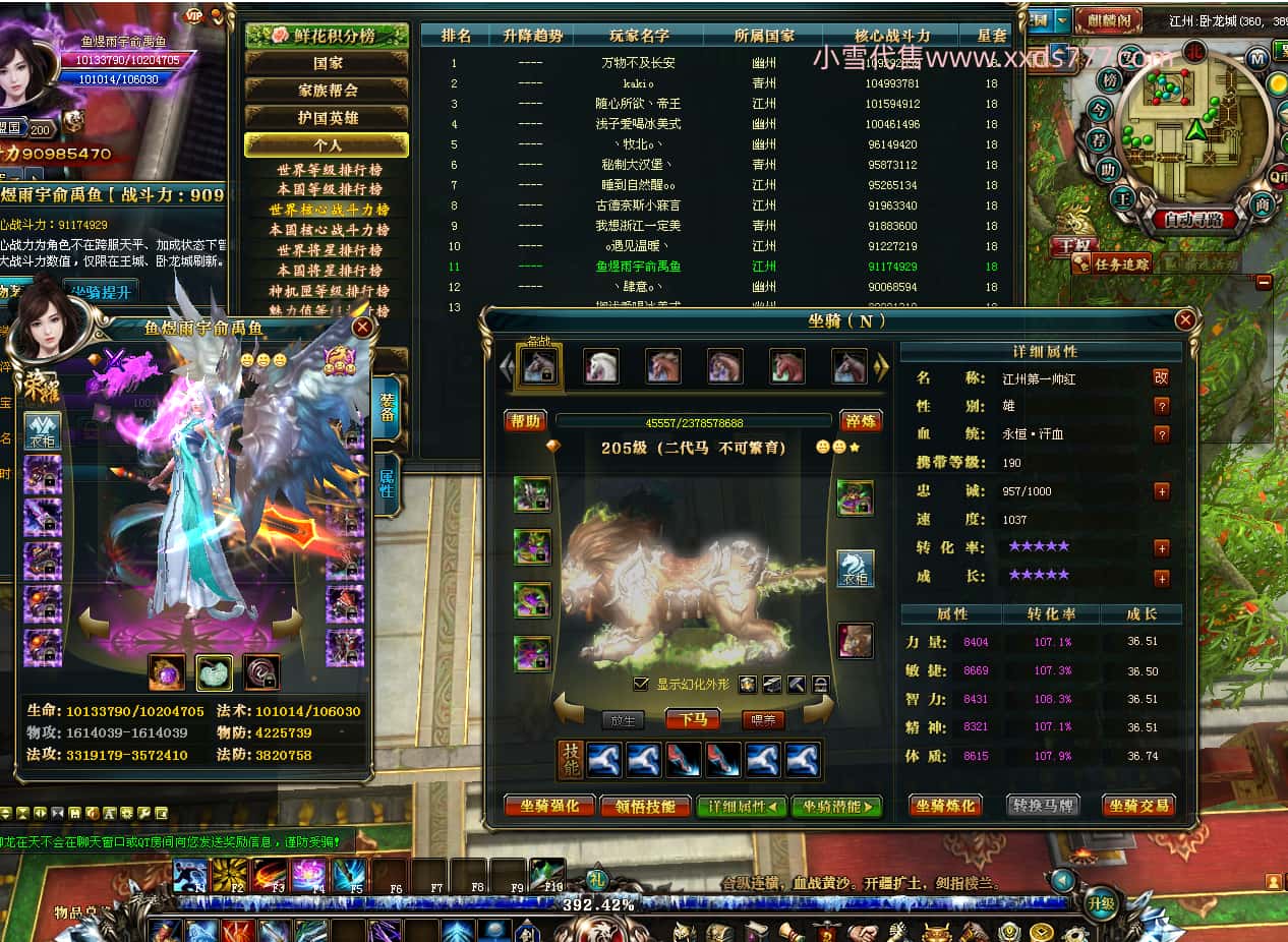 编号L23636 鱼煜雨宇俞禹鱼 龙战王者 江州 世界排名11名 9098W战力 人物黄金极品橙18X(9件混沌) 马黄金极品橙13X(双潜能50级33级) 人物紫龙印 马绿龙印 六等单双属性石头 已开完永久18星套 可以转移百分百安全