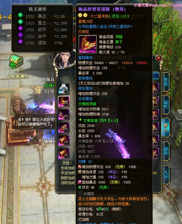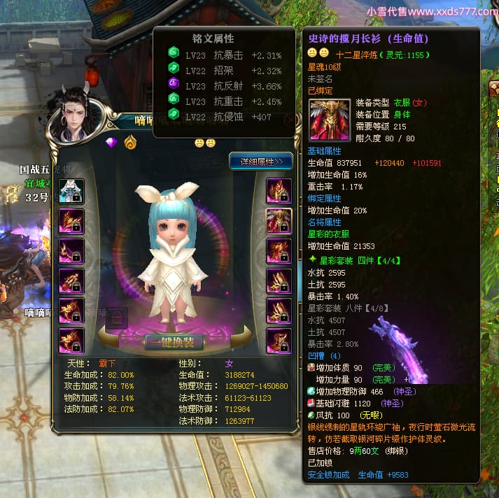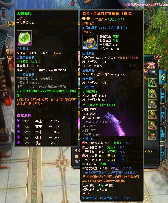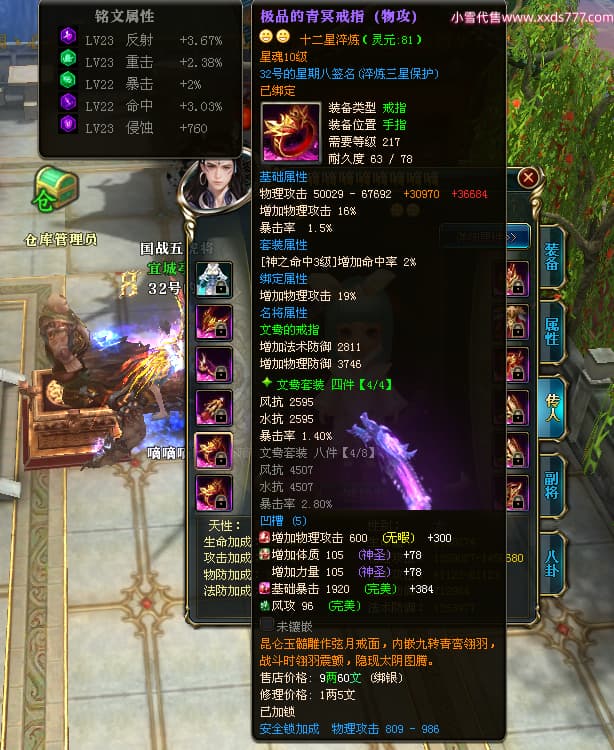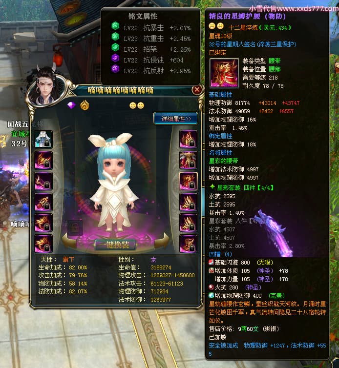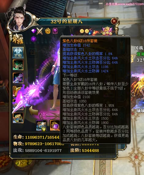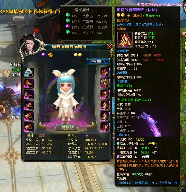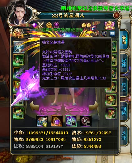 编号W23655 32号的星期八 龙舞九州 燕州 本国排名20名 14123W战力 人物普通橙12X(3件混沌) 传人精良紫12X 副将精良紫12X 马史诗紫12X 精良紫15披风 人物星魂16级 传人星魂10级 副将星魂6级 马星魂10级 人物铭刻4件15级2件14级其余12级 点亮1件16星2件14星其余12星 马铭刻12级 点亮12星 人物绿龙印 马黄龙印 五六等单双属性神圣完美无暇石头 蓝孔 已开启永久15星套