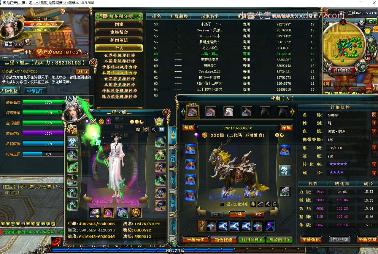 编号T23716 灬猫丶姐灬 龙腾问鼎 青州 本国排58名 8821W战力 人物15X 传人12X 副将12X 马9X 加强紫13披风 人物星魂14级 传人6级 马星魂6级 人物铭刻12级(主手/盔甲2件15级) 点亮12星(主手/盔甲2件16星) 马铭刻4件12级1件11级 点亮10星 号内Q币842个 人物高翠215个 马中萃227个 高翠19个