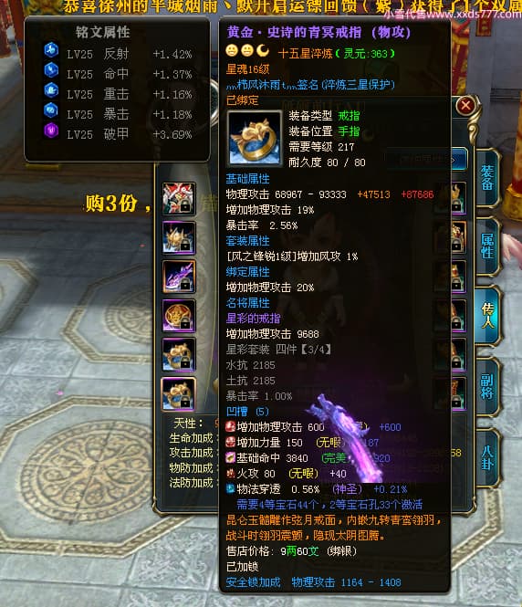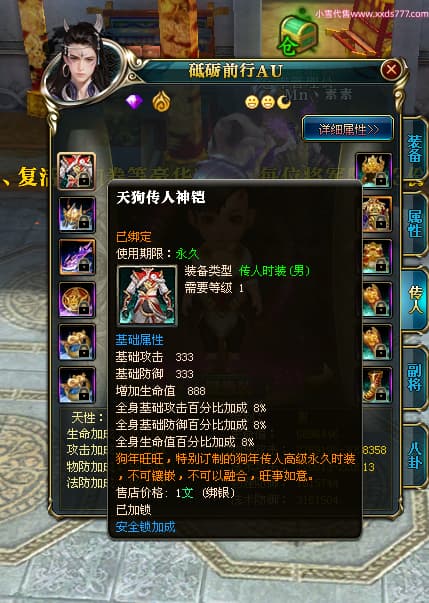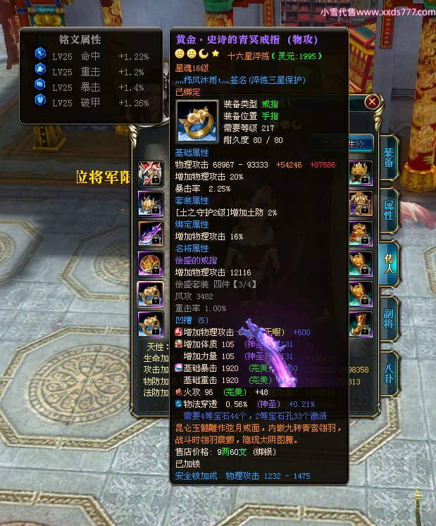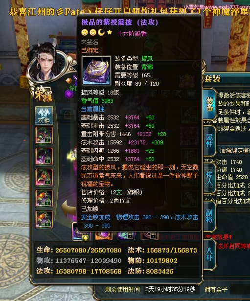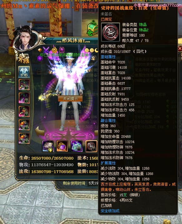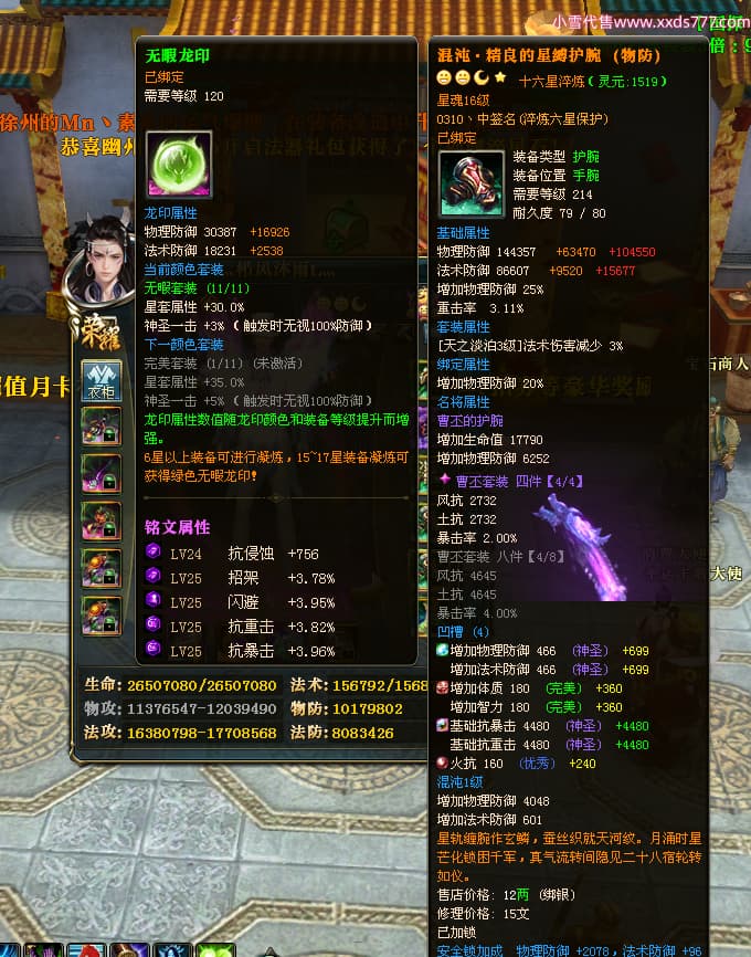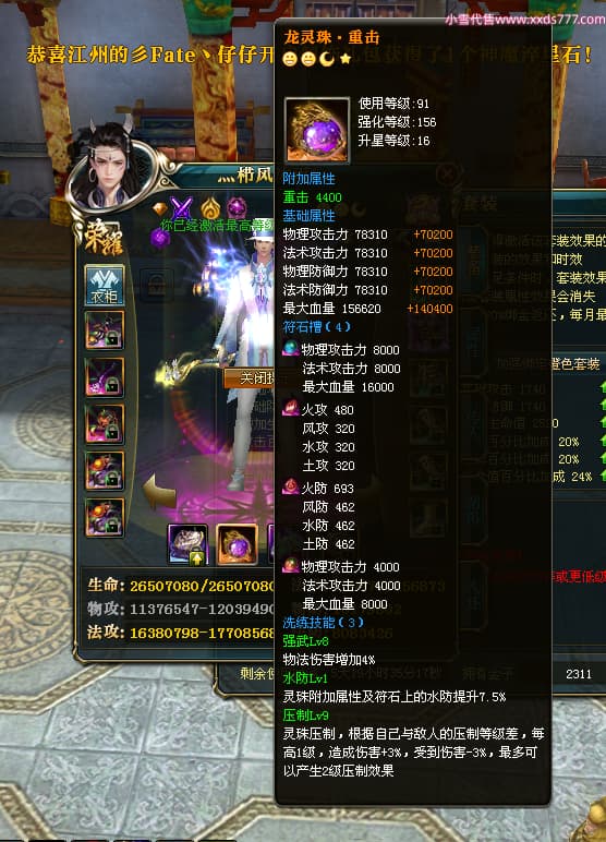 编号Z23724 灬栉风沐雨t灬 逐鹿天下 徐州 世界排名36名 27202W战力 人物黄金极品橙16X(4件18X9件混沌) 传人黄金史诗紫15X 副将精良紫12X 马黄金精良橙13X 极品紫16披风 人物星魂16级 传人星魂16级 副将星魂6级 马星魂16级 人物铭刻2件18级1件17级1件16级其余15级 人物点亮2件18星其余16星 马铭刻4件13级1件12级 点亮3件14星其余12星 人物绿龙印(1件紫龙印) 马黄龙印 六等单双属性神圣完美无暇石头 黄绿孔 已开4次永久15星套