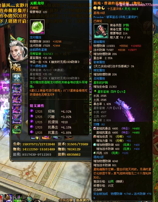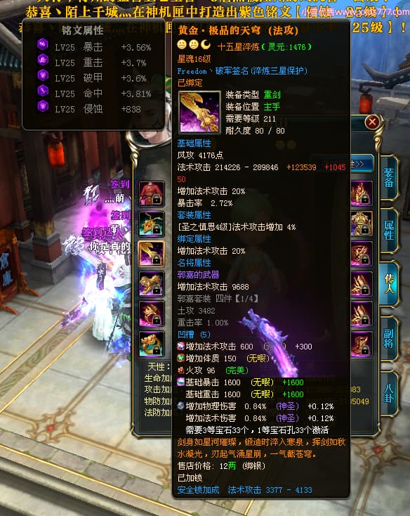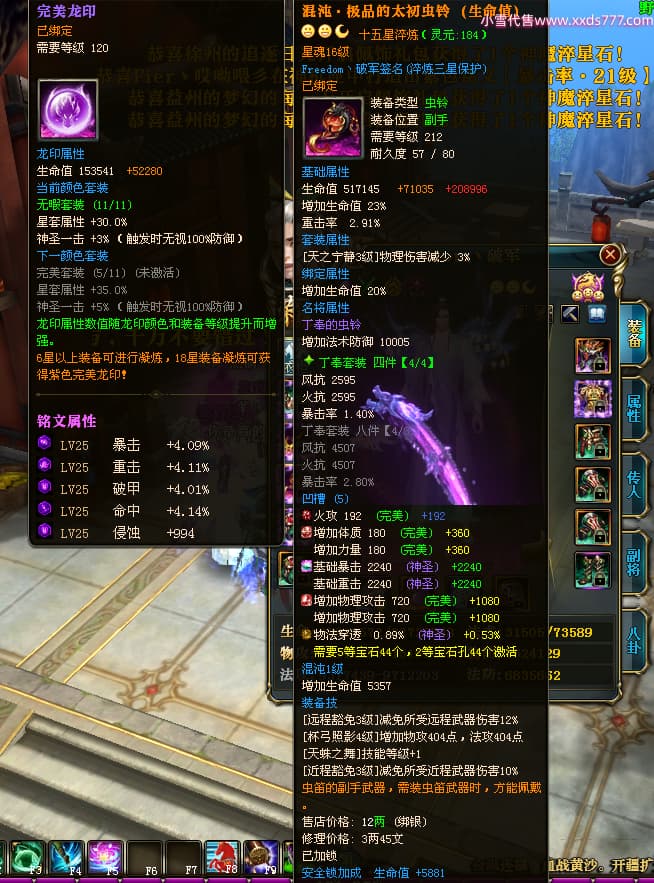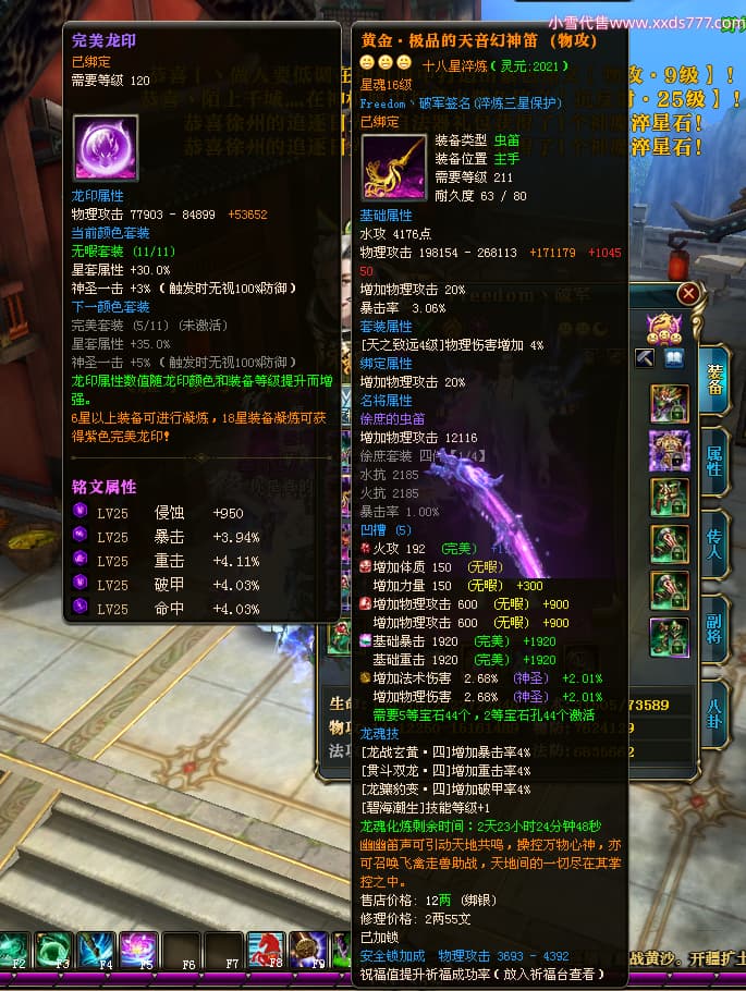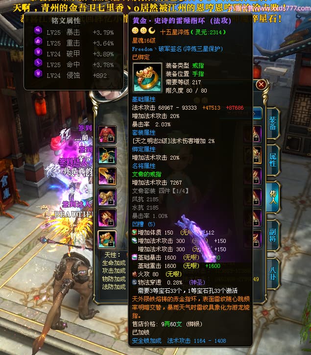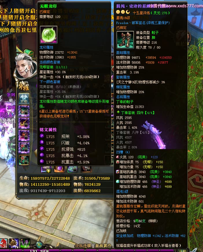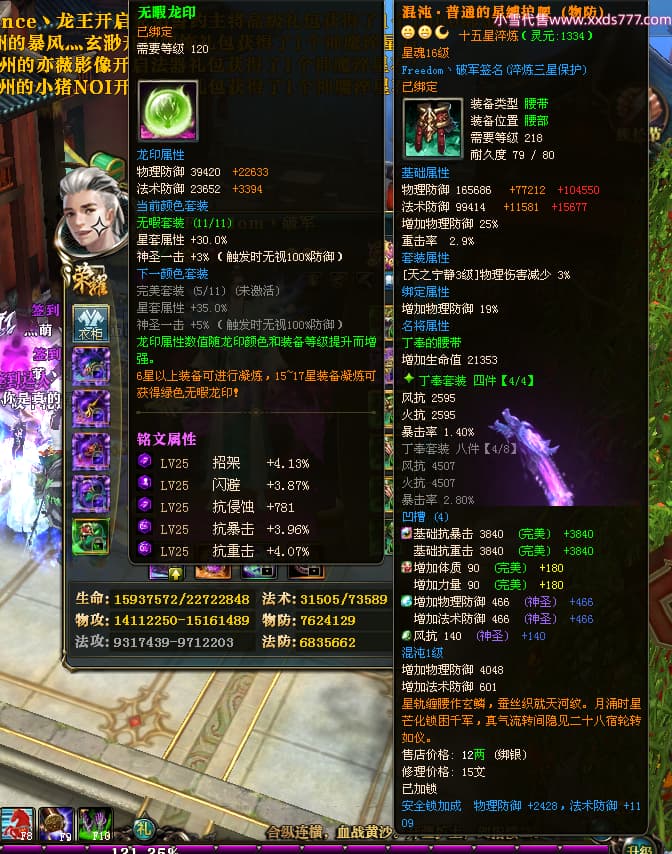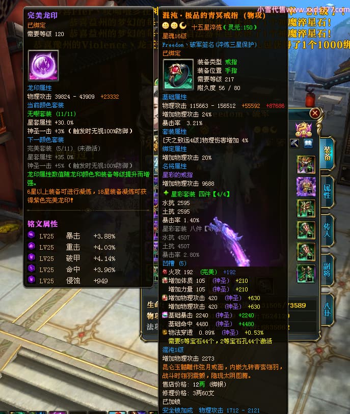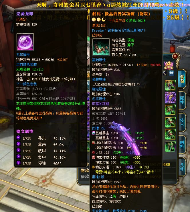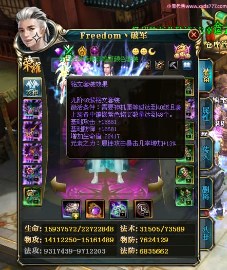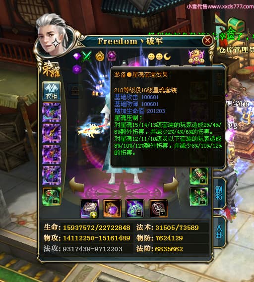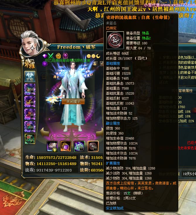 编号X23737 Freedom丶破军 龙啸风云 青州 世界排名83名 22650W战力 人物黄金普通橙15X(1件18X9件混沌) 传人史诗紫12X 副将精良紫12X 马普通橙13X 极品紫15披风 人物星魂16级 传人星魂9级 副将星魂6级 马星魂16级 人物铭刻15级 人物点亮3件16星其余14星 马铭刻13级 点亮1件14星其余12星 人物绿龙印(5件紫龙印) 马黄龙印 五六等单双属性神圣完美无暇石头 蓝黄绿孔 已开启永久15星套