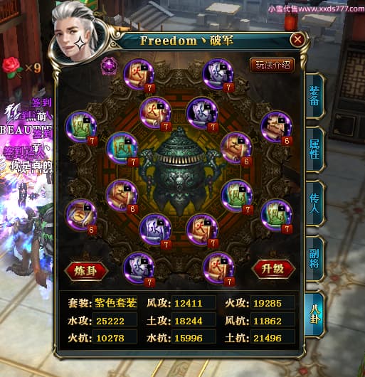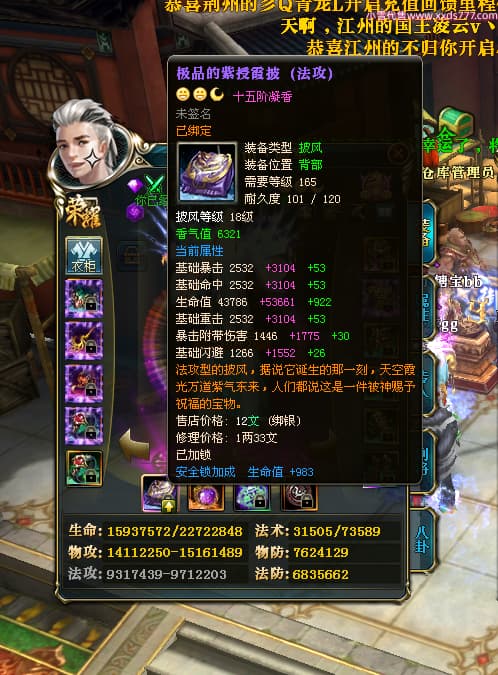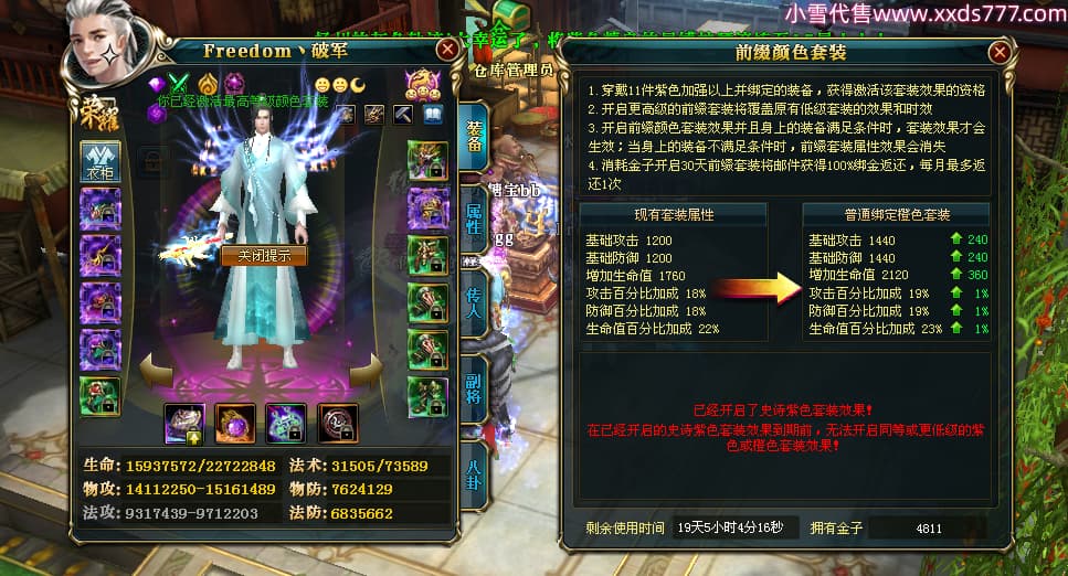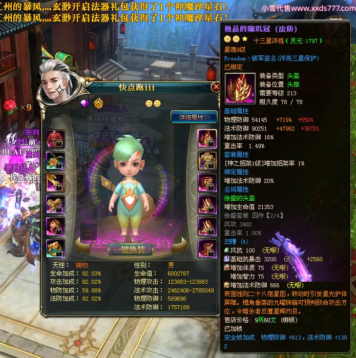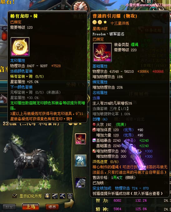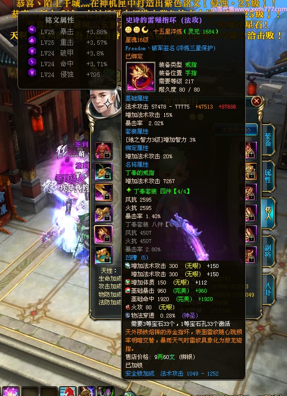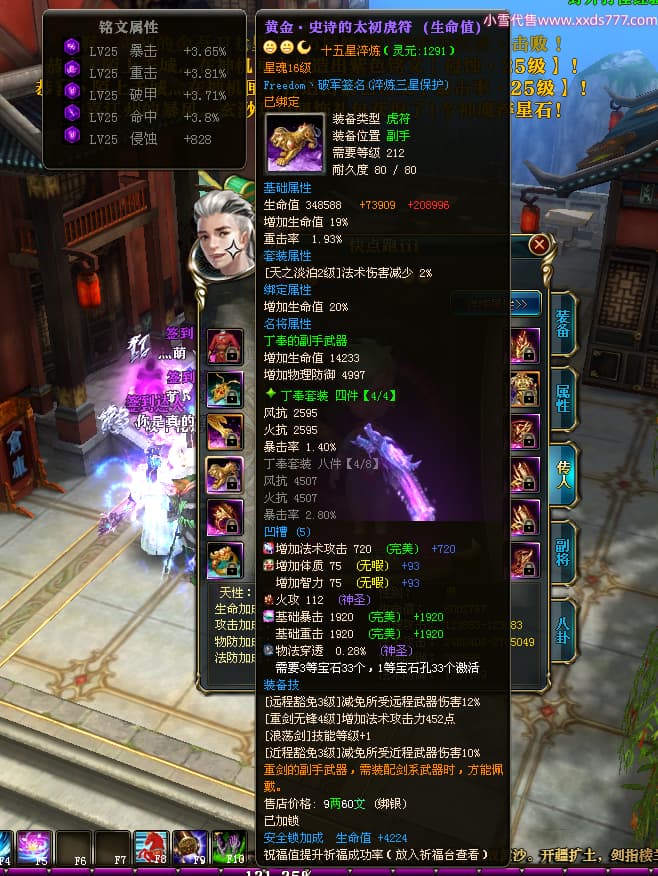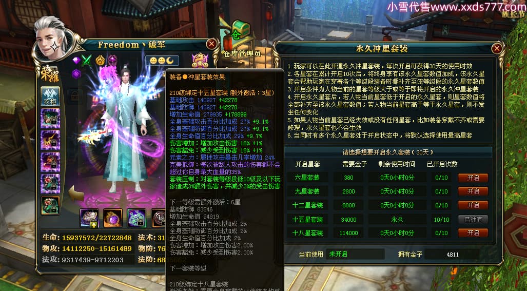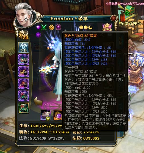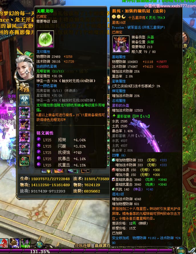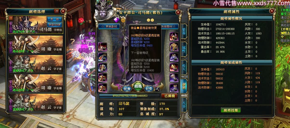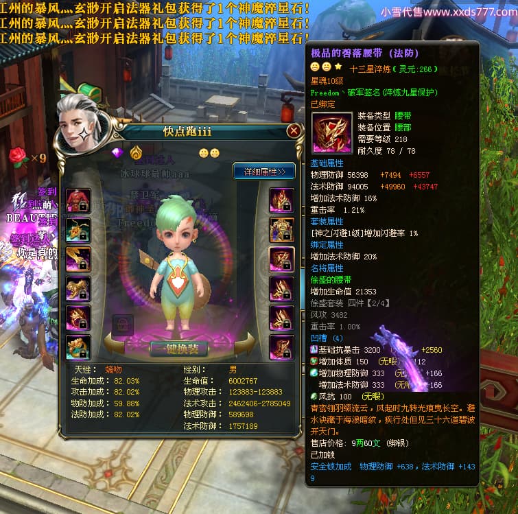 编号X23737 Freedom丶破军 龙啸风云 青州 世界排名83名 22650W战力 人物黄金普通橙15X(1件18X9件混沌) 传人史诗紫12X 副将精良紫12X 马普通橙13X 极品紫15披风 人物星魂16级 传人星魂9级 副将星魂6级 马星魂16级 人物铭刻15级 人物点亮3件16星其余14星 马铭刻13级 点亮1件14星其余12星 人物绿龙印(5件紫龙印) 马黄龙印 五六等单双属性神圣完美无暇石头 蓝黄绿孔 已开启永久15星套