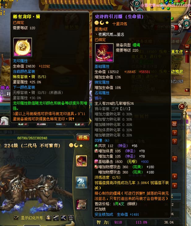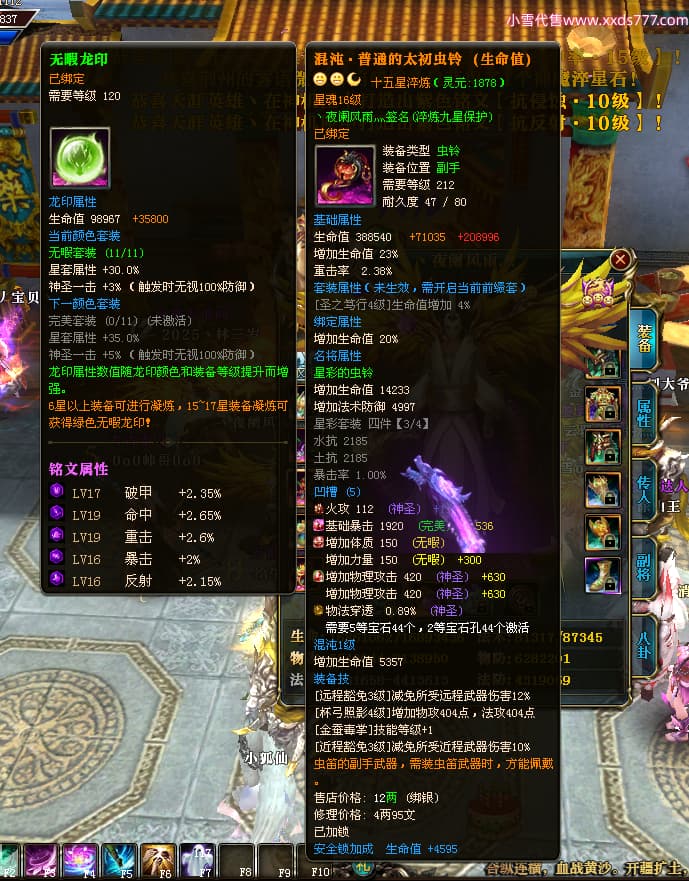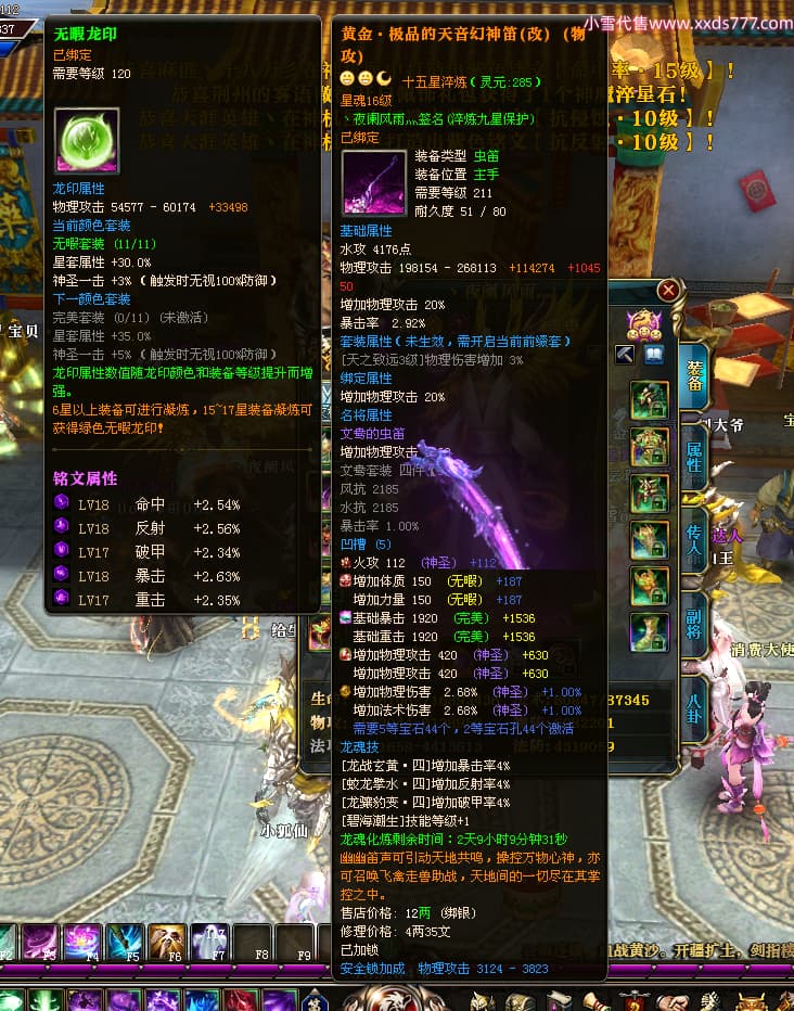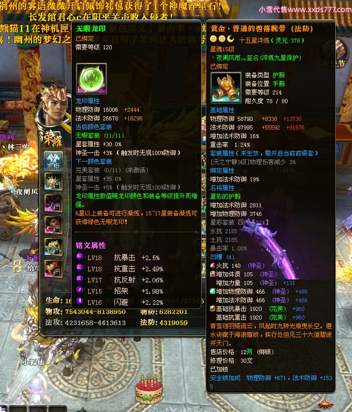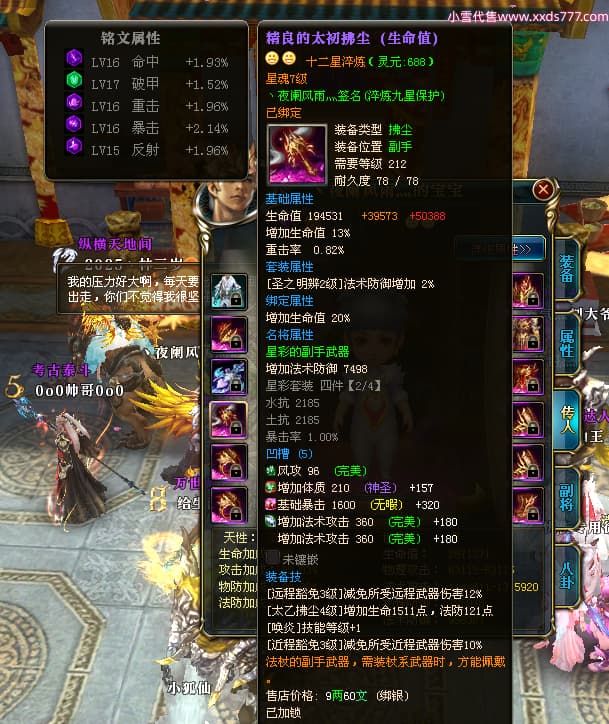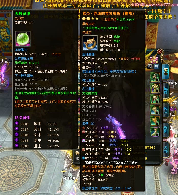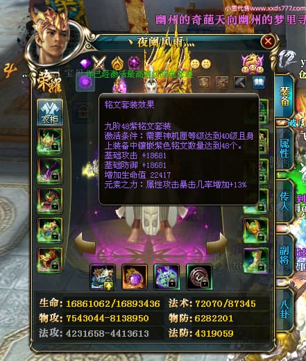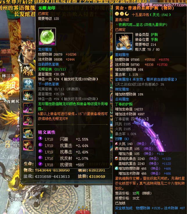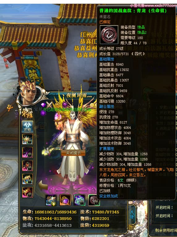 编号W23753 丶夜阑风雨灬 龙舞九州 幽州 本国排名84名 11398W战力 人物黄金普通橙12X(9件15X3件混沌) 传人精良紫12X 副将极品紫12X 马史诗紫10X 精良紫15披风 人物星魂15级 传人星魂6级 副将星魂6级 马星魂8级 人物铭刻15级 人物点亮3件16星其余14星 马铭刻12级 点亮10星 人绿龙印 马黄龙印 五六等单双属性神圣完美优秀石头 蓝黄孔