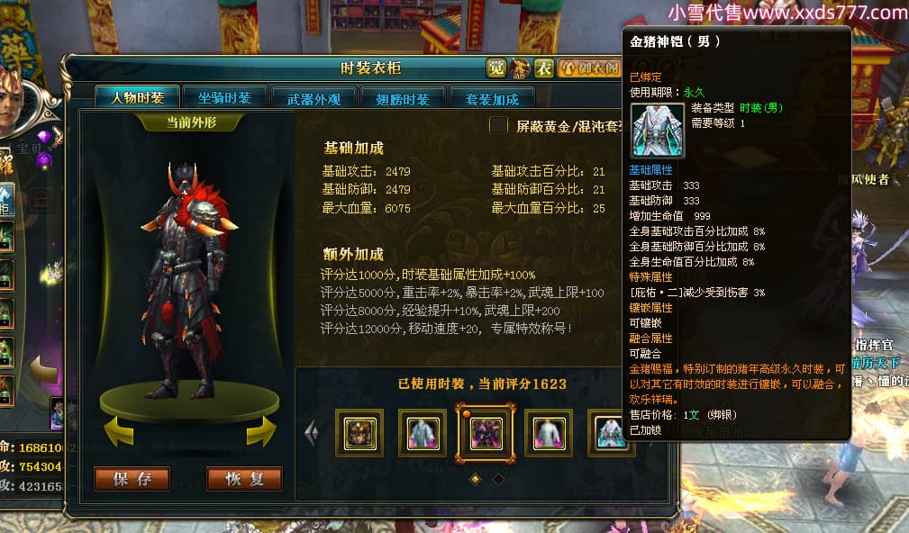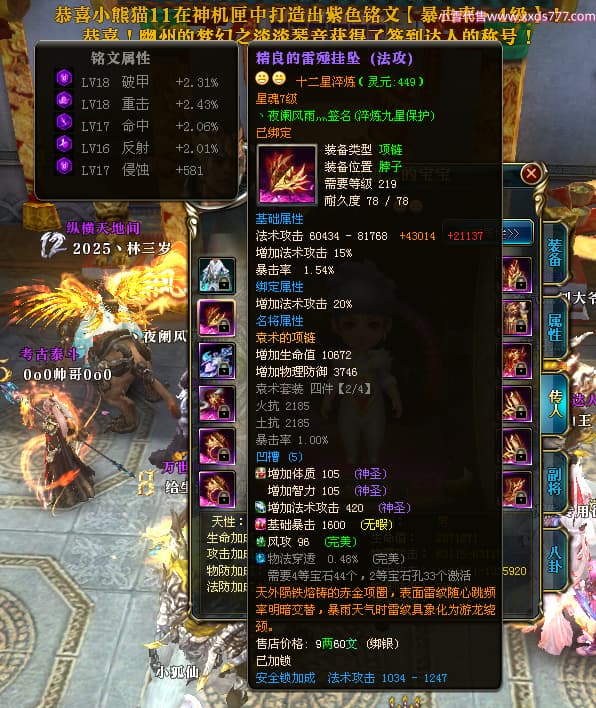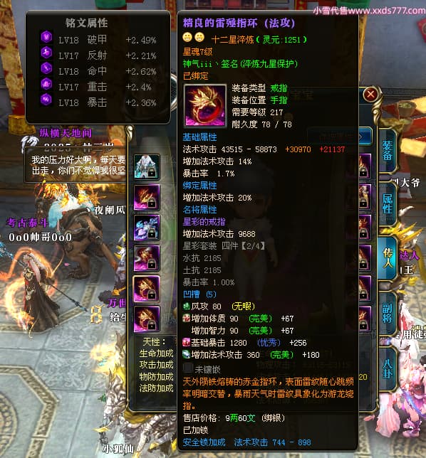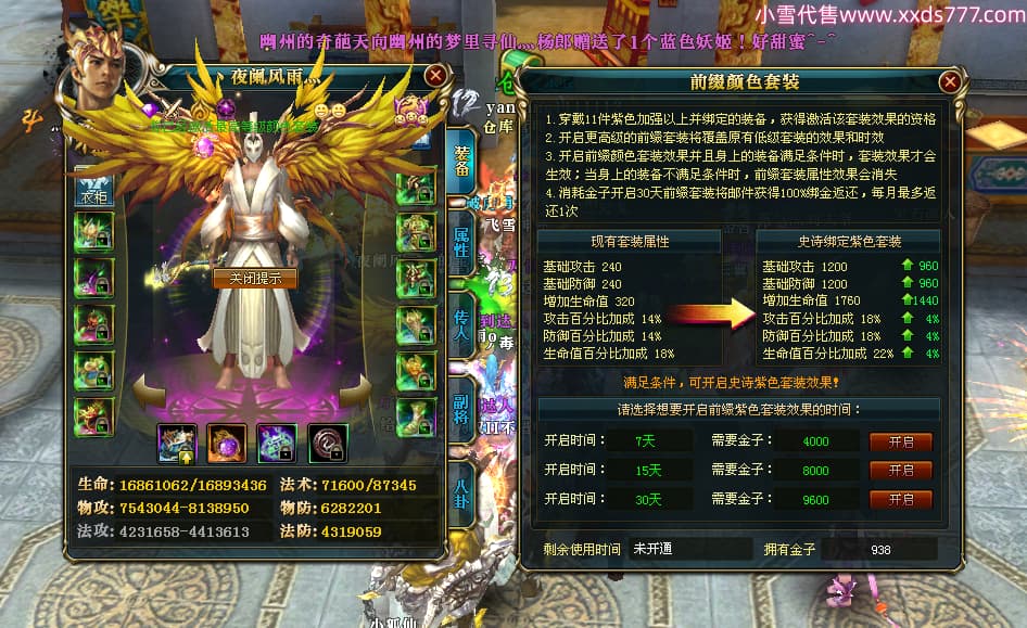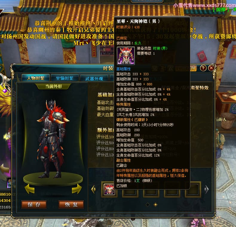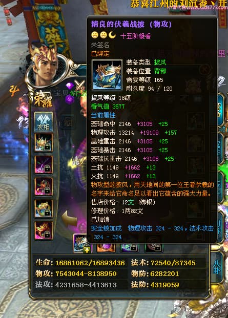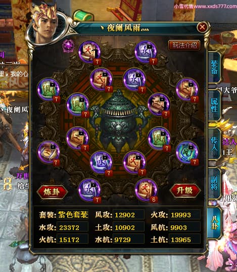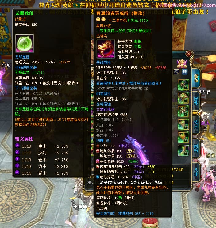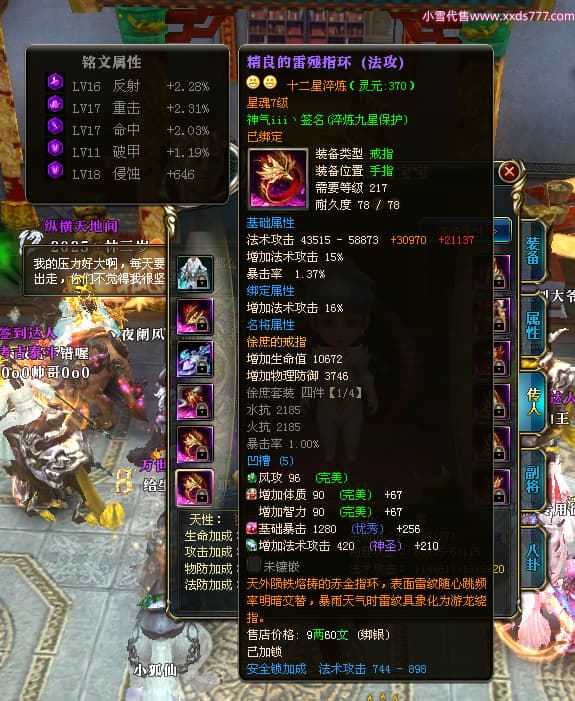 编号W23753 丶夜阑风雨灬 龙舞九州 幽州 本国排名84名 11398W战力 人物黄金普通橙12X(9件15X3件混沌) 传人精良紫12X 副将极品紫12X 马史诗紫10X 精良紫15披风 人物星魂15级 传人星魂6级 副将星魂6级 马星魂8级 人物铭刻15级 人物点亮3件16星其余14星 马铭刻12级 点亮10星 人绿龙印 马黄龙印 五六等单双属性神圣完美优秀石头 蓝黄孔