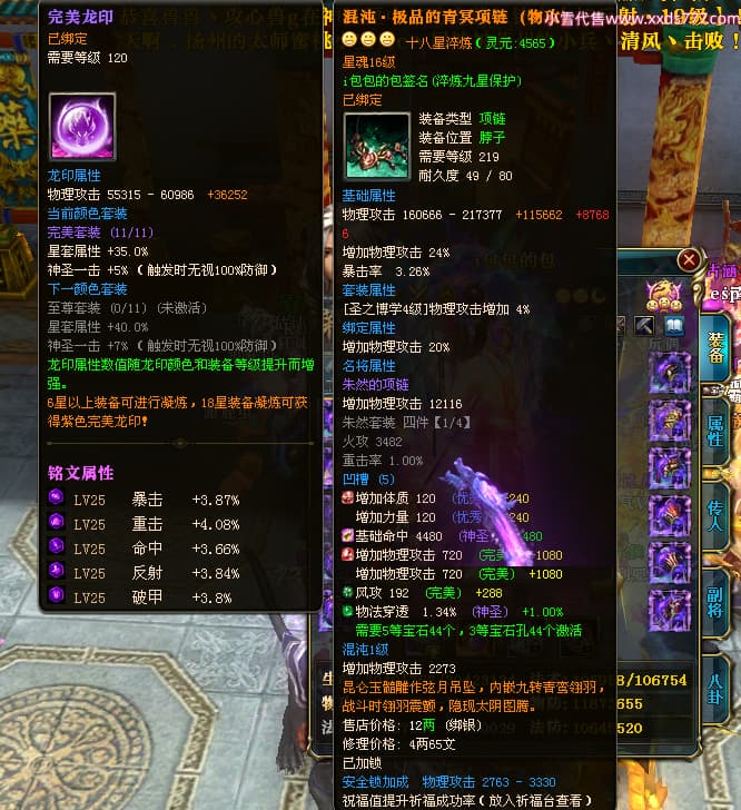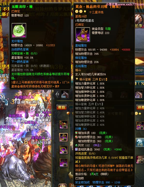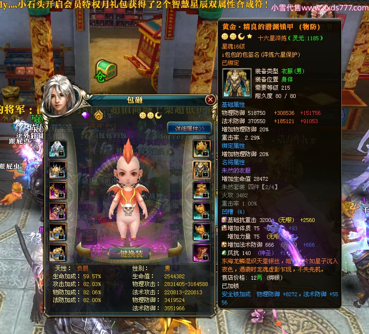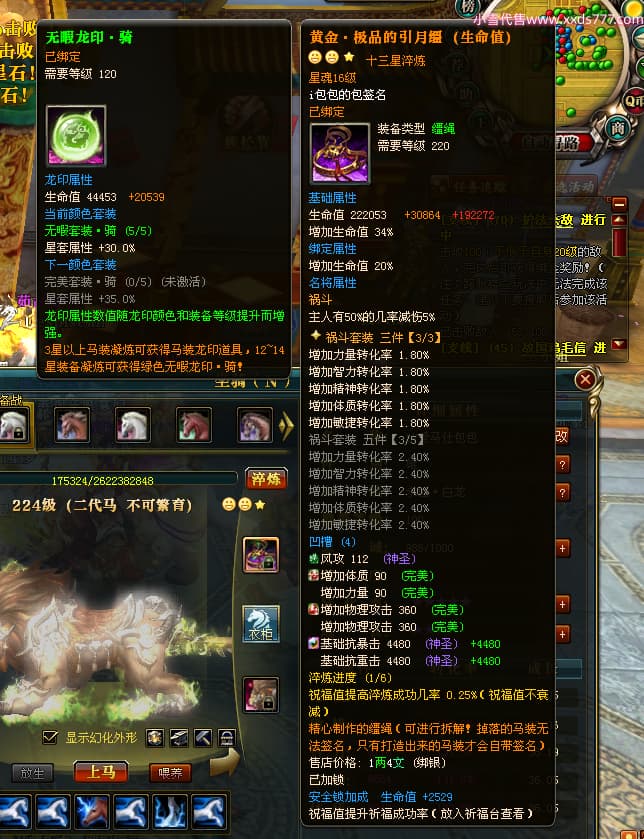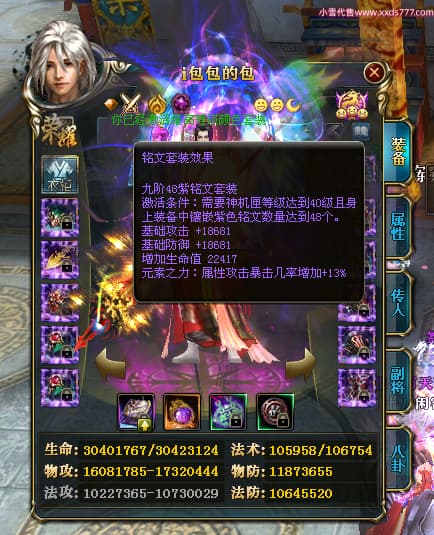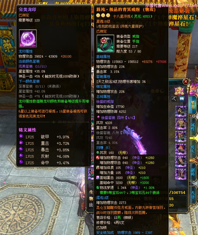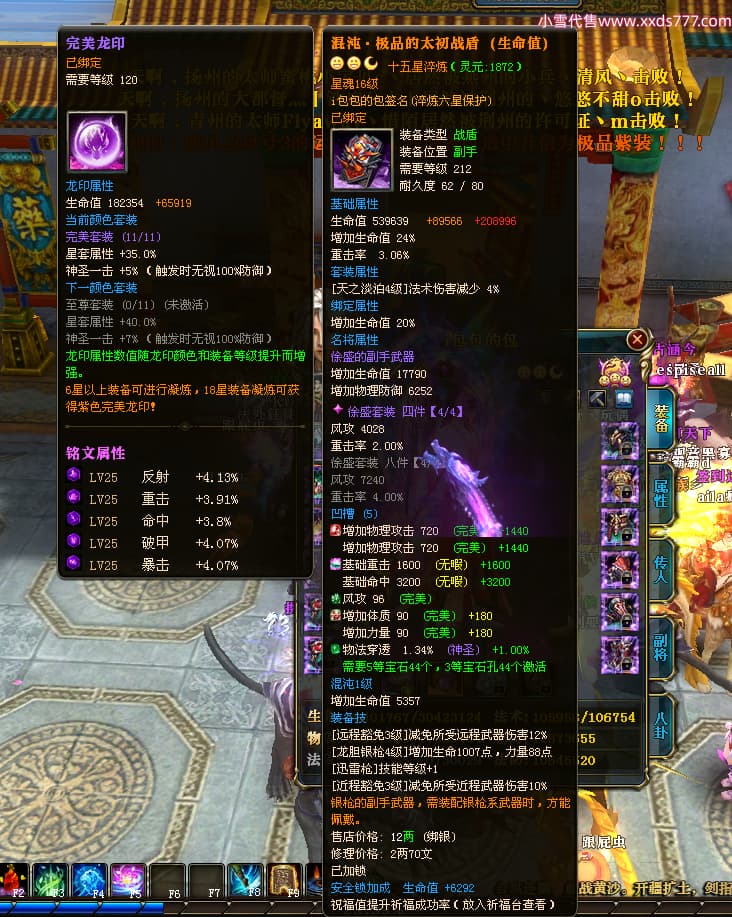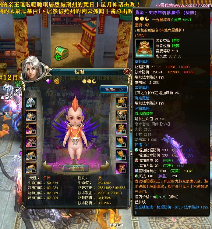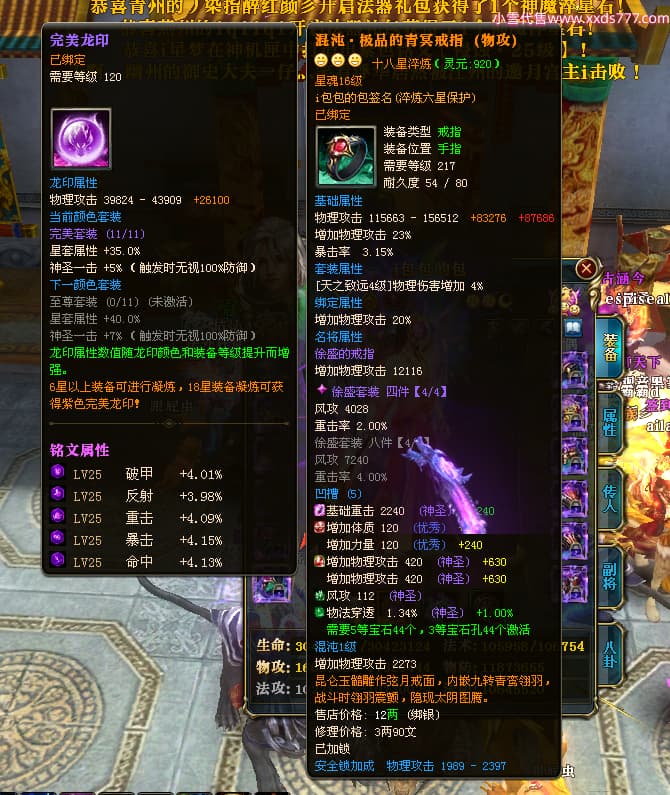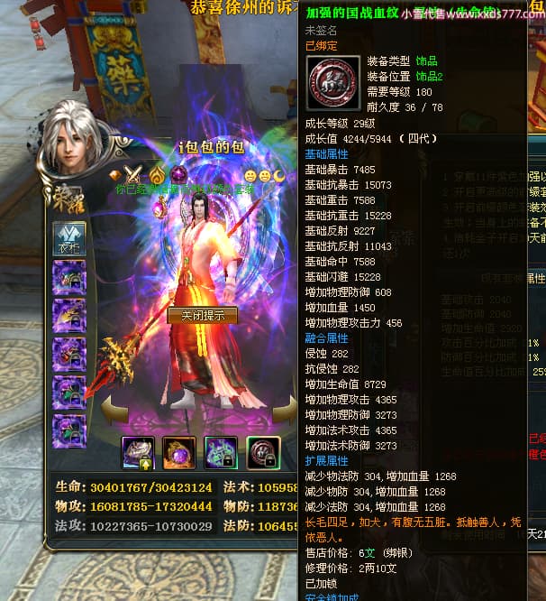 编号X23765 i包包的包 龙啸风云 青州 世界排名38名 27767W战力 人物黄金精良橙15X(5件18X9件混沌) 传人黄金史诗紫15X 副将精良橙15X 马黄金极品橙13X(双潜能52级50级) 史诗紫16披风 人物星魂16级 传人星魂13级 副将星魂6级 马星魂16级 人物铭刻1件18级1件17级其余16级 人物点亮1件18星其余16星 马铭刻13级 点亮14星 人物紫龙印 马绿龙印 六等单双属性神圣完美优秀石头 黄绿孔 已开启永久18星套