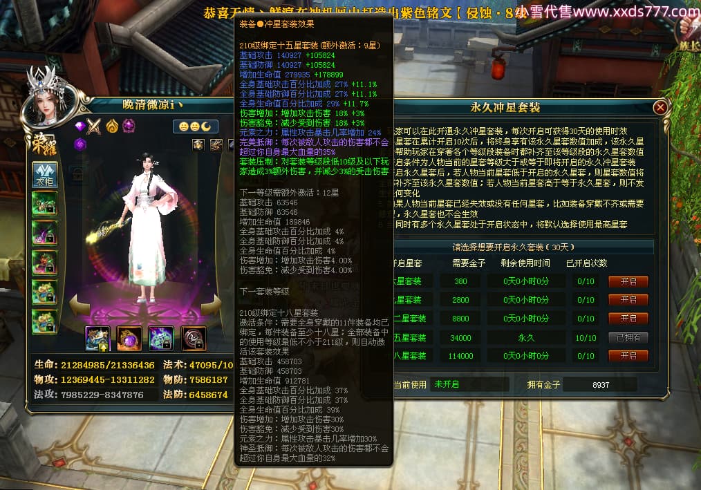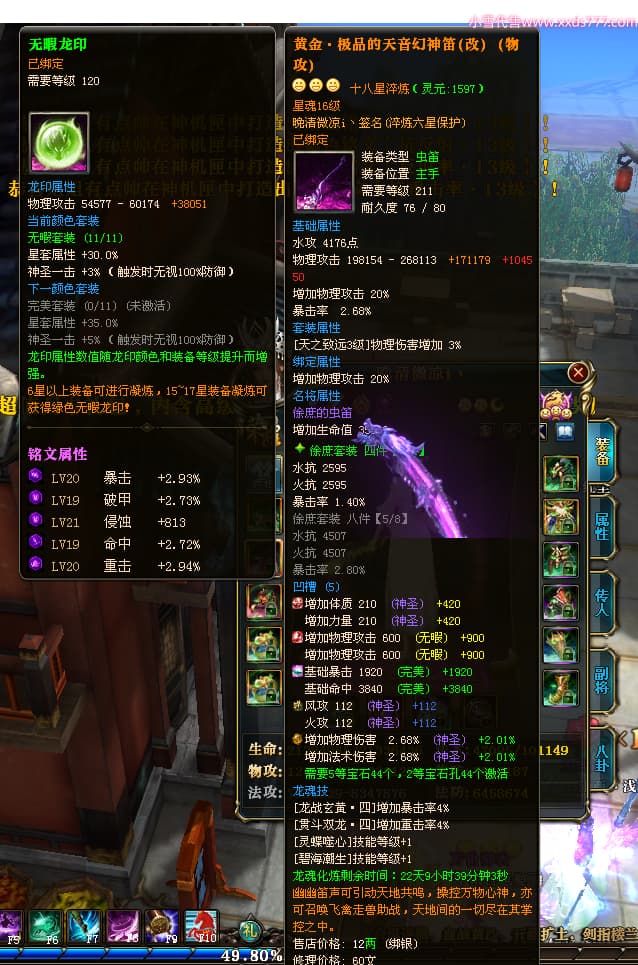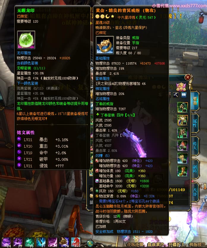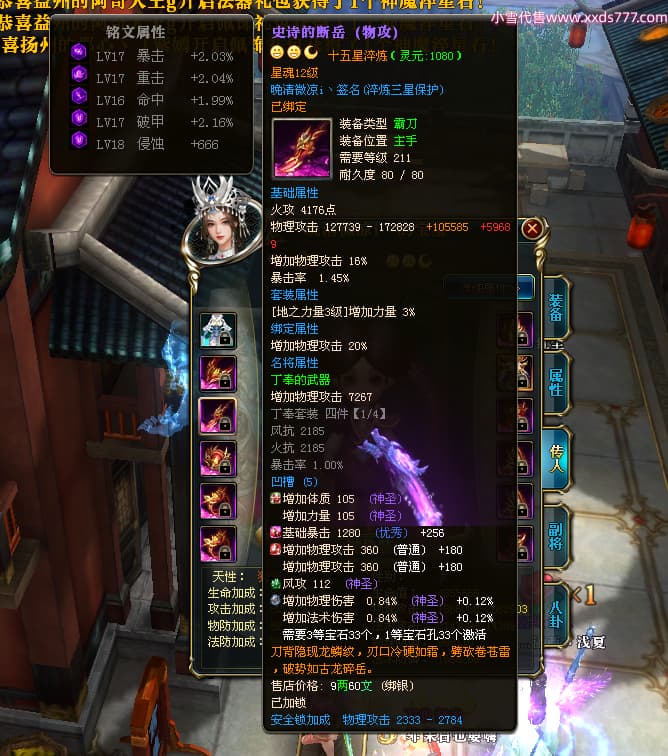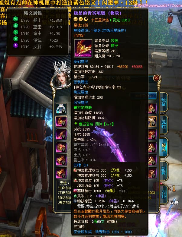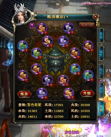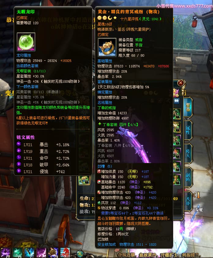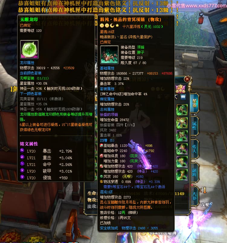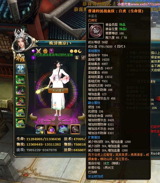 编号W23778 晚清微凉i丶 龙舞九州 荆州 本国排名31名 18328W战力 人物黄金史诗紫15X(2件18X5件混沌) 传人精良紫15X 副将极品紫12X 马史诗紫12X 极品紫15披风 人物星魂16级 传人星魂10级 副将星魂6级 马星魂13级 人物铭刻15级 人物点亮16星 马铭刻12级 点亮12星 人物绿龙印 马黄龙印 六等单双属性完美无暇神圣石头 蓝黄孔 已开启永久15星套