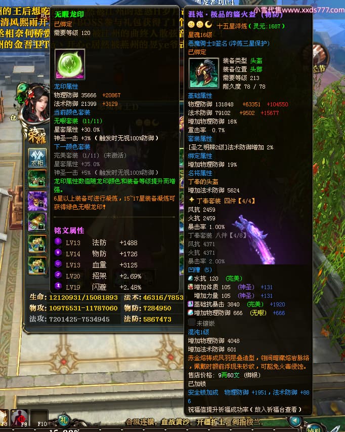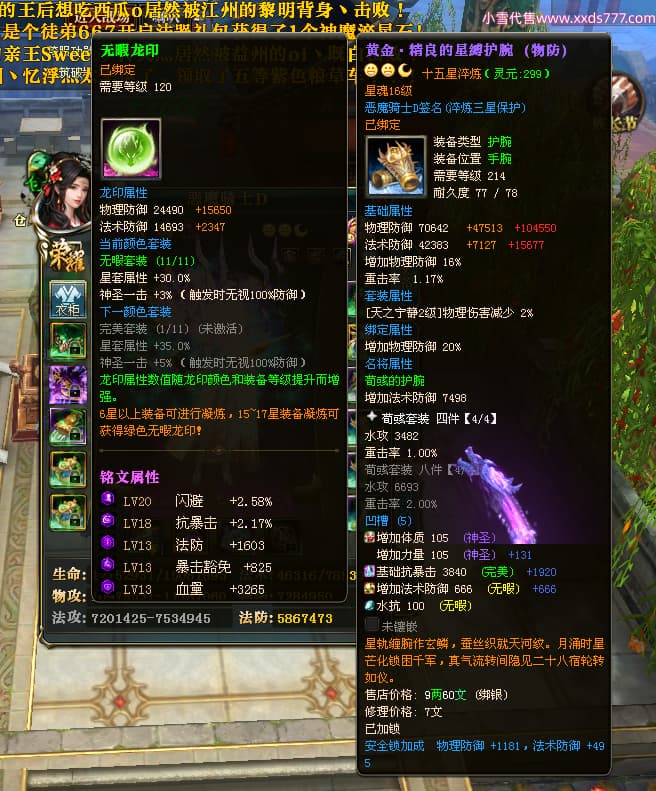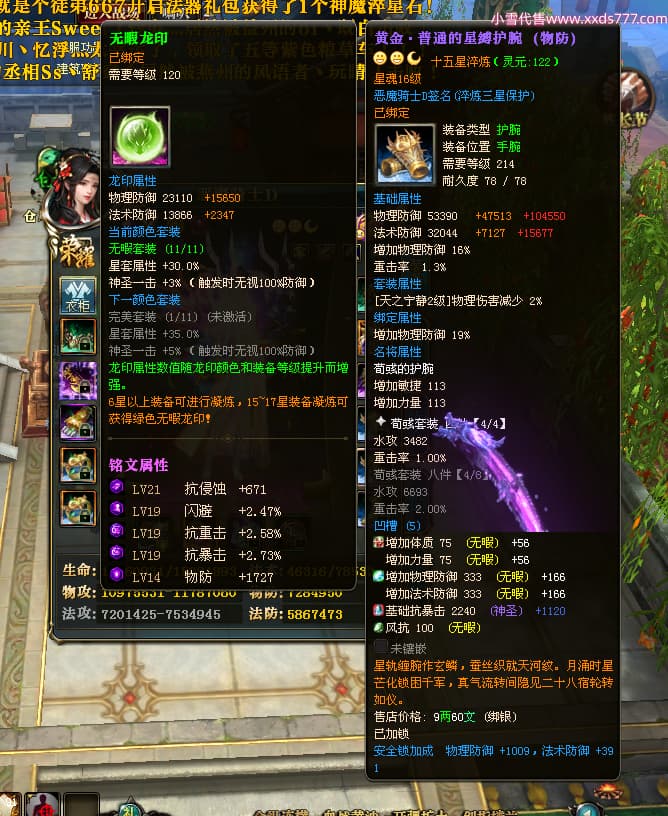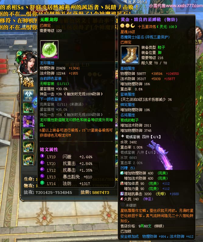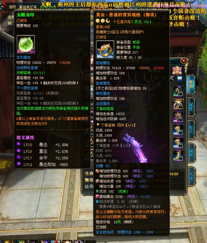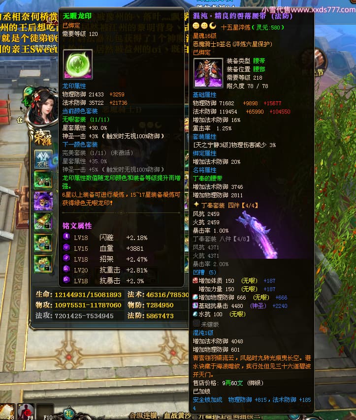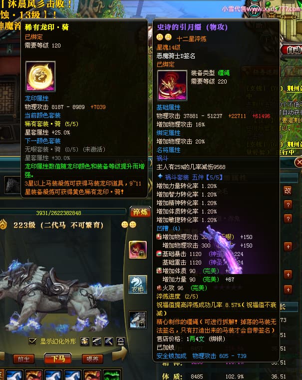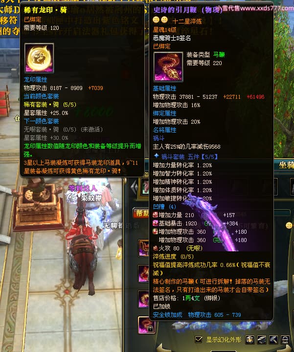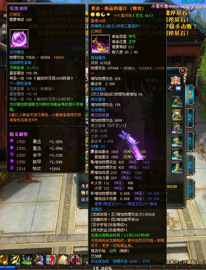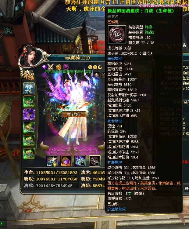 编号X23790 恶魔骑士D 龙啸风云 江州 本国排名60名 14896W战力 人物黄金精良紫15X(3件混沌) 传人精良紫12X 副将精良紫12X 马史诗紫12X 精良紫15披风 人物星魂16级 传人星魂9级 副将星魂6级 马星魂14级 人物铭刻3件16级其余15级 人物点亮4件16星其余14星 马铭刻15级 点亮12星 人物绿龙印(1件紫龙印) 马黄龙印 五等单双属性神圣完美优秀石头 蓝孔